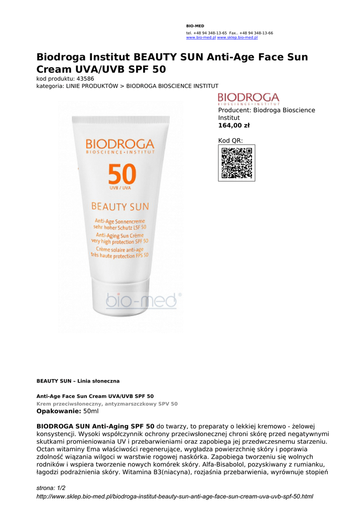 BIO-MED tel. +48 94 348-13-65 Fax.. +48 94 348-13-66 www.bio-med.pl www.sklep.bio-med.pl Biodroga Institut BEAUTY SUN Anti-Age Face Sun Cream UVA/UVB SPF 50 kod produktu: 43586 kategoria: LINIE PRODUKTÓW > BIODROGA BIOSCIENCE INSTITUT Producent: Biodroga Bioscience Institut 164,00 zł Kod QR: BEAUTY SUN – Linia słoneczna Anti-Age Face Sun Cream UVA/UVB SPF 50 Krem przeciwsłoneczny, antyzmarszczkowy SPV 50 Opakowanie: 50ml BIODROGA SUN Anti-Aging SPF 50 do twarzy, to preparaty o lekkiej kremowo - żelowej konsystencji. Wysoki współczynnik ochrony przeciwsłonecznej chroni skórę przed negatywnymi skutkami promieniowania UV i przebarwieniami oraz zapobiega jej przedwczesnemu starzeniu. Octan witaminy Ema właściwości regenerujące, wygładza powierzchnię skóry i poprawia zdolność wiązania wilgoci w warstwie rogowej naskórka. Zapobiega tworzeniu się wolnych rodników i wspiera tworzenie nowych komórek skóry. Alfa-Bisabolol, pozyskiwany z rumianku, łagodzi podrażnienia skóry. Witamina B3(niacyna), rozjaśnia przebarwienia, wyrównuje stopień strona: 1/2 http://www.sklep.bio-med.pl/biodroga-institut-beauty-sun-anti-age-face-sun-cream-uva-uvb-spf-50.html nawilżenia w skórze i poprawia zdolność regeneracji. Sposób użycia: W celu dokładnej ochrony skóry przed promieniowaniem UV, stosować codziennie i co najmniej 30 minut przed każdą dłuższą ekspozycją na słońce. Unikać intensywnego nasłonecznienia w południe. Działanie: • Łatwa aplikacja, wysoki poziom ochrony oraz działanie anti-aging • Szybko się wchłania i nie pozostawia białych plam na skórze • Świeży owocowy zapach • Ochrona przed wolnymi rodnikami • Działa kojąco • Nawilża i działa ochronnie • Efekt Anti-aging: stymuluje tworzenie nowych komórek, przeciwdziała przebarwieniom Składniki aktywne: UVA / UVB filter system, Alpha Bisabolol, Acetat Vitamin, Vitamin B3 INCI: OCTOCRYLENE, ETHYLHEXYL TRIAZONE, PHENYLBENZIMIDAZOLE SULFONIC ACID, DIETHYLAMINO HYDROXYBENZOYL HEXYL BENZOATE, BISABOLOL, E TOCOPHERYL ACETATE, NIACINAMIDE strona: 2/2 http://www.sklep.bio-med.pl/biodroga-institut-beauty-sun-anti-age-face-sun-cream-uva-uvb-spf-50.html