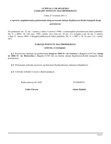 UCHWAŁA NR 40/218/2011 ZARZĄDU POWIATU RACIBORSKIEGO z dnia 27 września 2011 r. w sprawie zaopiniowania pozbawienia dróg na terenie miasta KędzierzynKoźle kategorii drogi powiatowej Na podstawie art. 32 ust. 1 ustawy z dnia 5 czerwca 1998r. o samorządzie powiatowym (tekst jednolity: Dz. U. z 2001r. Nr 142, poz. 1592, z późn. zm.) oraz art. 10 ust. 2 w związku z art. 6a ust. 2 ustawy z dnia 21 marca 1985r. o drogach publicznych (tekst jednolity: Dz. U. z 2007 r. Nr 19, poz. 115, z późn. zm.) ZARZĄD POWIATU RACIBORSKIEGO uchwala, co następuje: § 1. Pozytywnie opiniuje się pozbawienie drogi nr 2044 O ul. Gazowa o długości 0,393 km i drogi nr 2046 O ul. Harcerska o długości 0,763 km na terenie miasta KędzierzynKoźle kategorii drogi powiatowej. § 2. Wykonanie uchwały powierza się Staroście Raciborskiemu Adamowi Hajdukowi. § 3. Uchwała wchodzi w życie z dniem podjęcia. Radca prawny Kt 1620 STAROSTA Lidia Chrzan Adam Hajduk Strona 1 Uzasadnienie Zgodnie z art. 6a ust.2 i art. 10 ust. 2 ustawy z dnia 21 marca 1985 r. o drogach publicznych (tekst jednolity: Dz. U. z 2007 r. Nr 19 poz. 115, z późn. zm.) pozbawienie dotychczasowej kategorii drogi powiatowej następuje w drodze uchwały rady powiatu po zasięgnięciu opinii zarządu powiatu sąsiedniego. Z prośbą o wydanie opinii w w/w sprawie zwrócił się Dyrektor Powiatowego Zarządu Dróg w KędzierzynieKoźlu, w celu przekwalifikowania przedmiotowych dróg z kategorii drogi powiatowej na drogę gminą. Przedmiotowe drogi mają znaczenie lokalne i służą głównie miejscowych potrzebom. Powiatowy Zarząd Dróg w Raciborzu wydał opinię pozytywną w tej sprawie. Wobec powyższego w tym stanie prawnym i faktycznym podjęcie uchwały jest celowe i uzasadnione. Kierownik Referatu Inwestycji i Remontów STAROSTA Adam Hajduk Roman Peikert Strona 2