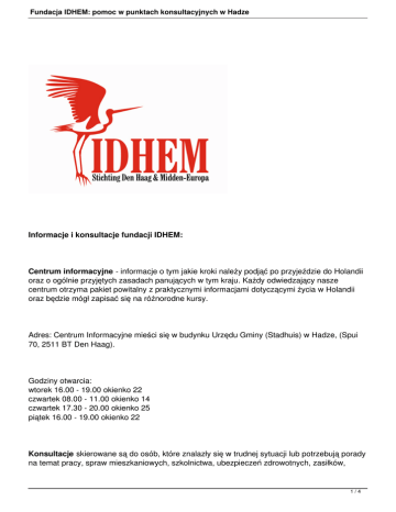 Fundacja IDHEM: pomoc w punktach konsultacyjnych w Hadze Informacje i konsultacje fundacji IDHEM: Centrum informacyjne - informacje o tym jakie kroki należy podjąć po przyjeździe do Holandii oraz o ogólnie przyjętych zasadach panujących w tym kraju. Każdy odwiedzający nasze centrum otrzyma pakiet powitalny z praktycznymi informacjami dotyczącymi życia w Holandii oraz będzie mógł zapisać się na różnorodne kursy. Adres: Centrum Informacyjne mieści się w budynku Urzędu Gminy (Stadhuis) w Hadze, (Spui 70, 2511 BT Den Haag). Godziny otwarcia: wtorek 16.00 - 19.00 okienko 22 czwartek 08.00 - 11.00 okienko 14 czwartek 17.30 - 20.00 okienko 25 piątek 16.00 - 19.00 okienko 22 Konsultacje skierowane są do osób, które znalazły się w trudnej sytuacji lub potrzebują porady na temat pracy, spraw mieszkaniowych, szkolnictwa, ubezpieczeń zdrowotnych, zasiłków, 1/4 Fundacja IDHEM: pomoc w punktach konsultacyjnych w Hadze zadłużenia, etc. Julianakerk Schalk Burgerstraat 217 2572 TV Den Haag poniedziałek 12.00-13.00 Vadercentrum Adam Jonckbloetplein 24 2523 AR Den Haag środa 18.00-21.00 Buurthuis Bario Kockstraat 175 2571 TD Den Haag czwartek 17.30-20.00 Wijkcentrum De Regenvalk Weimarstraat 69 2562 GR Den Haag piątek 10.00-12.00 Konsultacje dla osób bezdomnych: Julianakerk Schalk Burgerstraat 217 2572 TV Den Haag poniedziałek i piątek 9.30-12.00 Infolinia +31-70-365-8183 - informacje na temat pracy, spraw mieszkaniowych, ubezpieczeń 2/4 Fundacja IDHEM: pomoc w punktach konsultacyjnych w Hadze zdrowotnych, kursów językowych oraz innych kwestii dotyczących życia w Holandii. Infolinia w języku polskim - środa i piątek w godzinach 19.00 - 21.00 Infolinia w języku bułgarskim - poniedziałek w godzinach 19.00 - 21.00 Infolinia w języku rumuńskim - wtorek w godzinach 19.00 - 21.00 Więcej informacji na temat IDHEM oraz aktualnych projektów fundacji na stronie www.id hem.nl tel: +31-70-365-8183 e-mail: [email protected] HOLANDIA www.niedziela.nl - dokładne informacje o wydarzeniach w Holandii znajdziesz zawsze w polonijnym portalu internetowym www.niedziela.nl Prosimy o podawanie informacji o organizowanych imprezach, dyskotekach, wystawach, występach, itd. - e-mail'em na [email protected] lub telefonicznie +31-70-309-9540 (pon-pią 10:00-17:00, redakcja). Fotki mile widziane. 3/4 Fundacja IDHEM: pomoc w punktach konsultacyjnych w Hadze Niedziela.NL, opublikowane w portalu 08-10-2012, ostatnia zmiana 10-07-2014 {jcomments off} 4/4