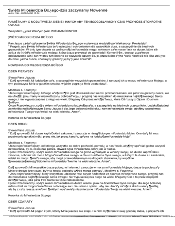 ¶wiêto Milosierdzia Bo¿ego-dzis zaczynamy Nowennê Autor: Viki - 2007/04/06 13:04 _____________________________________ PAMIÊTAJMY O MODLITWIE ZA SIEBIE I INNYCH ABY TEN B£OGOSLAWIONY CZAS PRZYNIÓS£ STOKROTNE OWOCE Wszystkim ¿yczê Weo³ych ¦wi±t WIELKANOCNYCH ¦WIÊTO MI£OSIERDZIA BO¯EGO Pan Jezus ¿±da³ og³oszenia ¶wiêta Mi³osierdzia Bo¿ego w pierwsz± niedzielê po Wielkanocy. Powiedzia³: " Pragnê, aby ¶wiêto Mi³osierdzia by³o ucieczk± i schronieniem dla wszystkich dusz, a szczególnie dla biednych grzeszników. W dniu tym otwarte s± wnêtrzno¶ci mi³osierdzia mego, wylewam ca³e morze ³ask na dusze, które siê zbli¿± do ¼ród³a mi³osierdzia mojego, która dusza przyst±pi do spowiedzi i Komunii ¶w., dost±pi zupe³nego odpuszczenia win i kar; w dniu tym otwarte s± wszystkie upusty Bo¿e, przez które p³yn± ³aski; niech siê nie lêka zbli¿yæ do mnie ¿adna dusza, chocia¿by grzechy jej by³y jako szkar³at". NOWENNA DO MILOSIERDZIA BO¯EGO DZIEÑ PIERWSZY S³owa Pana Jezusa: " Dzi¶ sprowad¼ Mi ludzko¶æ ca³±, a szczególnie wszystkich grzeszników, i zanurzaj ich w morzu mi³osierdzia Mojego, a tym pocieszysz Mnie w gorzkim smutku, w jakim pogr±¿a Mnie utrata dusz". Modlitwa s. Faustyny: "Jezu najmi³osierniejszy, którego w³a¶ciwo¶ci± jest litowaæsiê nad nami i przebaczaænam, nie patrz na grzechy nasze, ale na ufno¶Ê, jak± mamy w nieskoÒczon± dobroæTwoj±, i przyjmij nas wszystkich do mieszkania najlito¶ciwszego Serca swego, i nie wypuszczaj nas z niego na wieki. B³agamy Ciê przez mi³o¶æTwoj±, która Ciê ³±czy z Ojcem i Duchem ¶wiêtym. Ojcze Przedwieczny, spójrz okiem mi³osierdzia na ludzko¶æca³±, a szczególnie na biednych grzeszników. Ludzko¶æta jest zamkniêta najlito¶ciwszym Sercu Jezusa i dla Jego bolesnej mêki oka¿ nam mi³osierdzie swoje, aby¶my wszechmoc mi³osierdzia Twego wys³awiali na wieki wieków. Amen". Koronka do Mi³osierdzia Bo¿ego DZIEÑ DRUGI S³owa Pana Jezusa: " Dzi¶ sprowad¼ Mi dusze kap³aÒskie i zakonne, i zanurz je w niezg³êbionym mi³osierdziu Moim. One da³y Mi moc przetrwania gorzkiej mêki; przez nie, jak przez kana³y, sp³ywa na ludzko¶æmi³osierdzie Moje". Modlitwa s. Faustyny: "Jezu najmi³osierniejszy, od którego wszystko co dobre pochodzi, pomnó¿ w nas ³askê, aby¶my spe³niali godne uczynki mi³osierdzia, by ci, co na nas patrz±, chwalili Ojca mi³osierdzia, który jest w niebie. Ojcze Przedwieczny, spójrz okiem mi³osierdzia swego na grono wybranych w winnicy swojej, na dusze kap³aÒskie i zakonne, i obdarz ich moc± b³ogos³awieÒstwa swego, a dla uczuæSerca Syna swego, w którym te dusze s± zamkniête, udziel im mocy i ¶wiat³a swego, aby mogli przewodziæinnym na drogach zbawienia, by wspólnie ¶piewaæcze¶æniezg³êbionemu mi³osierdziu Twemu na wieki wieczne. Amen". Dzi¶ sprowad¼ Mi wszystkie dusze pobo¿ne i wierne, i zanurz je w morzu mi³osierdzia Mojego; dusze te pociesza³y Mnie w drodze krzy¿owej, by³y t± kropl± pociechy w¶ród morza goryczy". Modlitwa s. Faustyny: " Jezu najmi³osierniejszy, który wszystkim udzielasz ³ask swych nadobficie ze skarbca mi³osierdzia swego, przyjmij nas do mieszkania najlito¶ciwszego serca swego i nie wypuszczaj nas niego na wieki. b³agamy Ciê o to przez niepojêt± mi³o¶æTwoj±, jak± pa³a Twe Serce ku Ojcu niebieskiemu. Ojcze Przedwieczny, spójrz okiem mi³osierdzia na dusze wierne, jako na dziedzictwo Syna swego i dla Jego bolesnej mêki udziel im b³ogos³awieÒstwa i otaczaj je sw± nieustann± opiek±, aby nie utraci³y mi³o¶ci i skarbu wiary ¶wiêtej, ale by z ca³± rzesz± anio³ów i ¶wiêtych wys³awia³y niezmierzone mi³osierdzie Twoje na wieki wieczne. Amen". Koronka do Mi³osierdzia Bo¿ego DZIEÑ CZWARTY S³owa Pana Jezusa: " Dzi¶ sprowad¼ Mi pogan i tych, którzy Mnie jeszcze nie znaj±. I o nich my¶la³em w swej gorzkiej mêce, a przysz³a ich <h2>Forum.oPio.pl</h2> <h1>!!! UWAGA !!! </h1> <h3>Chwilowo niezarejestrowani Joomlaboard u¿ytkownicyForum mog±Component tylko czytaæversion: posty, by 1.1.3 pisaæ Stable nale¿y siê zalogowaæ.</h3> Generated: <p>(Forum 7 March, jest 2017, niemoderowane 12:04 i dostêpne dla go gorliwo¶æpocieszy³a Serce Moje. Zanurz ich w morzu mi³osierdzia Mojego". Modlitwa s. Faustyny: " Jezu najlito¶ciwszy, który jeste¶ ¶wiat³o¶ci± ¶wiata ca³ego, przyjmij do mieszkania najlito¶ciwszego Serca swego dusze pogan, które Ciê jeszcze nie znaj±; niechaj promienie Twej ³aski o¶wiec± ich, aby i oni wraz z nami wys³awiali przedziwne mi³osierdzie twoje, i nie wypuszczaj ich z mieszkania najlito¶ciwszego Serca swego. Ojcze Przedwieczny, spójrz okiem mi³osierdzia swego na dusze pogan i tych, co Ciê jeszcze nie znaj±, a s± zamkniête w najlito¶ciwszym Sercu Jezusa. Poci±gnij je do ¶wiat³a Ewangelii. Dusze te nie wiedz±, jak wielkim jest szczê¶ciem Ciebie mi³owaÊ. Spraw, aby i one wys³awia³y hojno¶æmi³osierdzia Twego na wieki wieczne. Amen". Koronka do Mi³osierdzia Bo¿ego DZIEÑ PI°TY S³owa Pana Jezusa: "Dzi¶ sprowad¼ Mi dusze braci od³±czonych i zanurz ich w morzu mi³osierdzia Mojego. W gorzkiej mêce rozdzielali Mi cia³o i Serce, to jest Ko¶ció³ Mój. Kiedy wracaj± do jedno¶ci z Ko¶cio³em, goj± siê rany Moje i tym sposobem ul¿± Mi w mêce". Modlitwa s. Faustyny: " Jezu najmi³osierniejszy, który jeste¶ dobroci± sam±, Ty nie odmawiasz ¶wiat³a prosz±cym Ciebie, przyjmij do mieszkania najlito¶ciwszego Serca swego dusze braci naszych od³±czonych i poci±gnij ich swym ¶wiat³em do jedno¶ci z Ko¶cio³em, i nie wypuszczaj ich z mieszkania najlito¶ciwszego Serca swego, ale spraw, aby i oni uwielbili hojno¶æmi³osierdzia Twego. Ojcze Przedwieczny, spójrz okiem mi³osierdzia swego na dusze braci naszych od³±czonych, zw³aszcza tych, którzy roztrwonili dobra Twoje i nadu¿yli ³ask Twoich, trwaj±c uporczywie w swych b³êdach. Nie patrz na ich b³êdy, ale na mi³o