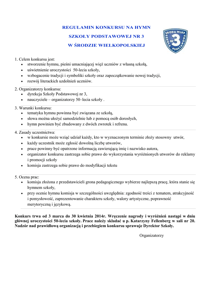 REGULAMIN KONKURSU NA HYMN SZKOŁY PODSTAWOWEJ NR 3 W ŚRODZIE WIELKOPOLSKIEJ 1. Celem konkursu jest: stworzenie hymnu, pieśni umacniającej więź uczniów z własną szkołą, uświetnienie uroczystości 50-lecia szkoły, wzbogacenie tradycji i symboliki szkoły oraz zapoczątkowanie nowej tradycji, rozwój literackich uzdolnień uczniów. 2. Organizatorzy konkursu: dyrekcja Szkoły Podstawowej nr 3, nauczyciele – organizatorzy 50–lecia szkoły . 3. Warunki konkursu: tematyka hymnu powinna być związana ze szkołą, słowa można ułożyć samodzielnie lub z pomocą osób dorosłych, hymn powinien być zbudowany z dwóch zwrotek i refrenu. 4. Zasady uczestnictwa: w konkursie może wziąć udział każdy, kto w wyznaczonym terminie złoży stosowny utwór, każdy uczestnik może zgłosić dowolną liczbę utworów, prace powinny być opatrzone informacją zawierającą imię i nazwisko autora, organizator konkursu zastrzega sobie prawo do wykorzystania wyróżnionych utworów do reklamy i promocji szkoły komisja zastrzega sobie prawo do modyfikacji tekstu 5. Ocena prac: komisja złożona z przedstawicieli grona pedagogicznego wybierze najlepszą pracę, która stanie się hymnem szkoły, przy ocenie hymnu komisja w szczególności uwzględnia: zgodność treści z tematem, atrakcyjność i pomysłowość, zaprezentowanie charakteru szkoły, walory artystyczne, poprawność merytoryczną i językową. Konkurs trwa od 3 marca do 30 kwietnia 2014r. Wręczenie nagrody i wyróżnień nastąpi w dniu głównej uroczystości 50-lecia szkoły. Prace należy składać u p. Katarzyny Fellenberg w sali nr 20. Nadzór nad prawidłową organizacją i przebiegiem konkursu sprawuje Dyrektor Szkoły. Organizatorzy