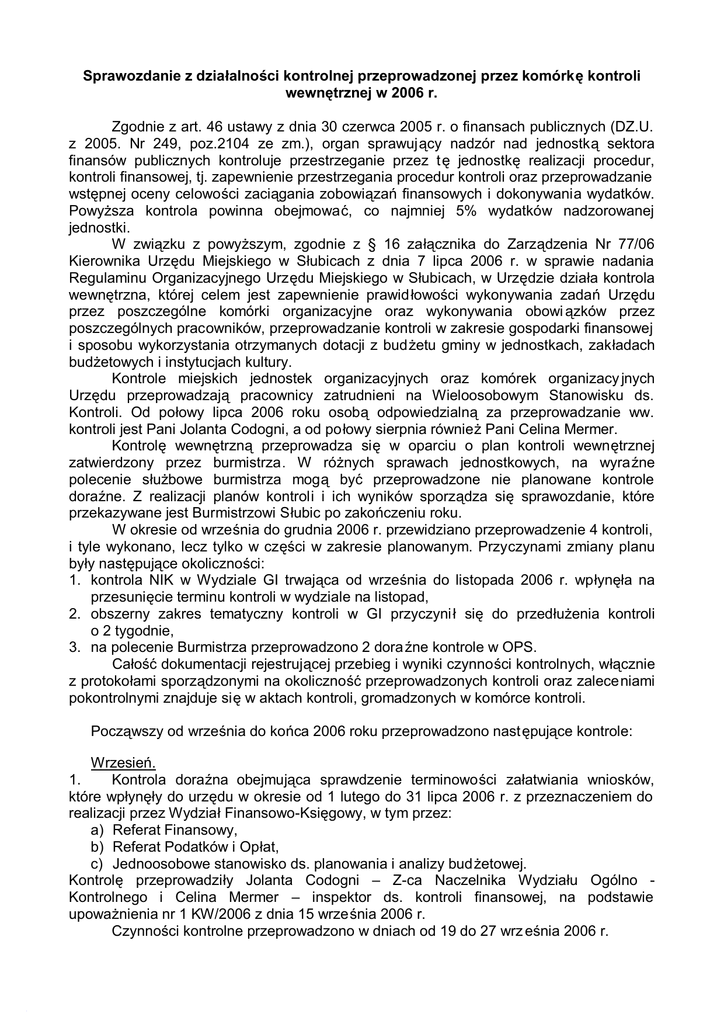 Sprawozdanie z działalności kontrolnej przeprowadzonej przez komórkę kontroli wewnętrznej w 2006 r. Zgodnie z art. 46 ustawy z dnia 30 czerwca 2005 r. o finansach publicznych (DZ.U. z 2005. Nr 249, poz.2104 ze zm.), organ sprawujący nadzór nad jednostką sektora finansów publicznych kontroluje przestrzeganie przez tę jednostkę realizacji procedur, kontroli finansowej, tj. zapewnienie przestrzegania procedur kontroli oraz przeprowadzanie wstępnej oceny celowości zaciągania zobowiązań finansowych i dokonywania wydatków. Powyższa kontrola powinna obejmować, co najmniej 5% wydatków nadzorowanej jednostki. W związku z powyższym, zgodnie z § 16 załącznika do Zarządzenia Nr 77/06 Kierownika Urzędu Miejskiego w Słubicach z dnia 7 lipca 2006 r. w sprawie nadania Regulaminu Organizacyjnego Urzędu Miejskiego w Słubicach, w Urzędzie działa kontrola wewnętrzna, której celem jest zapewnienie prawidłowości wykonywania zadań Urzędu przez poszczególne komórki organizacyjne oraz wykonywania obowi ązków przez poszczególnych pracowników, przeprowadzanie kontroli w zakresie gospodarki finansowej i sposobu wykorzystania otrzymanych dotacji z budżetu gminy w jednostkach, zakładach budżetowych i instytucjach kultury. Kontrole miejskich jednostek organizacyjnych oraz komórek organizacy jnych Urzędu przeprowadzają pracownicy zatrudnieni na Wieloosobowym Stanowisku ds. Kontroli. Od połowy lipca 2006 roku osobą odpowiedzialną za przeprowadzanie ww. kontroli jest Pani Jolanta Codogni, a od połowy sierpnia również Pani Celina Mermer. Kontrolę wewnętrzną przeprowadza się w oparciu o plan kontroli wewnętrznej zatwierdzony przez burmistrza . W różnych sprawach jednostkowych, na wyraźne polecenie służbowe burmistrza mogą być przeprowadzone nie planowane kontrole doraźne. Z realizacji planów kontroli i ich wyników sporządza się sprawozdanie, które przekazywane jest Burmistrzowi Słubic po zakończeniu roku. W okresie od września do grudnia 2006 r. przewidziano przeprowadzenie 4 kontroli, i tyle wykonano, lecz tylko w części w zakresie planowanym. Przyczynami zmiany planu były następujące okoliczności: 1. kontrola NIK w Wydziale GI trwająca od września do listopada 2006 r. wpłynęła na przesunięcie terminu kontroli w wydziale na listopad, 2. obszerny zakres tematyczny kontroli w GI przyczyni ł się do przedłużenia kontroli o 2 tygodnie, 3. na polecenie Burmistrza przeprowadzono 2 dora źne kontrole w OPS. Całość dokumentacji rejestrującej przebieg i wyniki czynności kontrolnych, włącznie z protokołami sporządzonymi na okoliczność przeprowadzonych kontroli oraz zaleceniami pokontrolnymi znajduje się w aktach kontroli, gromadzonych w komórce kontroli. Począwszy od września do końca 2006 roku przeprowadzono następujące kontrole: Wrzesień. 1. Kontrola doraźna obejmująca sprawdzenie terminowości załatwiania wniosków, które wpłynęły do urzędu w okresie od 1 lutego do 31 lipca 2006 r. z przeznaczeniem do realizacji przez Wydział Finansowo-Księgowy, w tym przez: a) Referat Finansowy, b) Referat Podatków i Opłat, c) Jednoosobowe stanowisko ds. planowania i analizy budżetowej. Kontrolę przeprowadziły Jolanta Codogni – Z-ca Naczelnika Wydziału Ogólno Kontrolnego i Celina Mermer – inspektor ds. kontroli finansowej, na podstawie upoważnienia nr 1 KW/2006 z dnia 15 września 2006 r. Czynności kontrolne przeprowadzono w dniach od 19 do 27 wrz eśnia 2006 r. Październik. 2. Kontrola doraźna przeprowadzona w Ośrodku Pomocy Społecznej w Słubicach. Kontrola obejmowała sprawdzenie bazy lokalowej ośrodka oraz analizę zatrudnienia i kwalifikacji pracowników, w tym: a) sprawdzenie zgodności stanu zatrudnienia pracowników socjalnych z art. 110 pkt 11 ustawy o pomocy społecznej i sprawdzenie warunków lokalowych OPS-u, b) weryfikacja zatrudnienia pracowników socjalnych i zgodności ich kwalifikacji z wymaganiami określonymi w ustawie, c) kontrola podnoszenia kwalifikacji zawodowych pracowników poprzez udział w szkoleniach (art. 119 ust 2 pkt 6 ustawy o pomocy spo łecznej). Kontrolę przeprowadziła Celina Mermer – inspektor ds. kontroli finansowej, na podstawie upoważnienia nr 273/06 z dnia 6 października 2006 r. Kontrolę przeprowadzono w dniach od 10 do 13 pa ździernika 2006 r. 3. Kontrola doraźna zlecona przez Burmistrza - jako interwencja na skargę. Kontrola przeprowadzona w Ośrodku Pomocy Społecznej w Słubicach, przez Celinę Mermer – inspektora ds. kontroli finansowej, na podstawie upoważnienia nr 274/06 z dnia 19 października 2006 r. Zakresem kontroli objęto weryfikację uprawnienia do nabycia zaliczki alimentacyjnej przez wskazane w skardze dziecko reprezentowane przez matk ę oraz prawidłowość naliczenia zaliczki. Czynności kontrolne przeprowadzono w dniu 24 października 2006 r. Listopad/grudzień 4. Kontrola problemowa przeprowadzona w Wydziale Gospodarki i Inwestycji Urz ędu Miejskiego w Słubicach. Kontrolę przeprowadziły Jolanta Codogni – Z-ca Naczelnika Wydziału Ogólno – Kontrolnego i Celina Mermer – Inspektor ds. kontroli finansowej, na podstawie upoważnienia nr 2/06 z dnia 31 października 2006 r. Kontrola obejmowała przestrzeganie przepisów k.p.a. przy załatwianiu wniosków, które wpłynęły do urzędu w okresie od 1 kwietnia do 30 września 2006 r., a w przypadku wniosków o wydanie decyzji o warunkach zabudowy, kontrolowano okres od 1 stycznia 2003 r. do 30 września 2006 r. Czynności kontrolne przeprowadzono w dniach od 7 listopada do dnia 15 grudnia 2006 r. Słubice, dnia 22 stycznia 2007r. Sporządziła: Celina Mermer