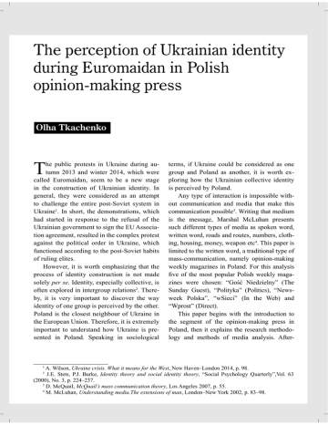 The perception of Ukrainian identity during Euromaidan in Polish opinion-making press Olha Tkachenko T he public protests in Ukraine during autumn 2013 and winter 2014, which were called Euromaidan, seem to be a new stage in the construction of Ukrainian identity. In general, they were considered as an attempt to challenge the entire post-Soviet system in Ukraine1. In short, the demonstrations, which had started in response to the refusal of the Ukrainian government to sign the EU Association agreement, resulted in the complex protest against the political order in Ukraine, which functioned according to the post-Soviet habits of ruling elites. However, it is worth emphasizing that the process of identity construction is not made solely per se. Identity, especially collective, is often explored in intergroup relations2. Thereby, it is very important to discover the way identity of one group is perceived by the other. Poland is the closest neighbour of Ukraine in the European Union. Therefore, it is extremely important to understand how Ukraine is presented in Poland. Speaking in sociological 1 terms, if Ukraine could be considered as one group and Poland as another, it is worth exploring how the Ukrainian collective identity is perceived by Poland. Any type of interaction is impossible without communication and media that make this communication possible3. Writing that medium is the message, Marshal McLuhan presents such different types of media as spoken word, written word, roads and routes, numbers, clothing, housing, money, weapon etc4. This paper is limited to the written word, a traditional type of mass-communication, namely opinion-making weekly magazines in Poland. For this analysis Þve of the most popular Polish weekly magazines were chosen: “GoĞü Niedzielny” (The Sunday Guest), “Polityka” (Politics), “Newsweek Polska”, “wSieci” (In the Web) and “Wprost” (Direct). This paper begins with the introduction to the segment of the opinion-making press in Poland, then it explains the research methodology and methods of media analysis. After- A. Wilson, Ukraine crisis. What it means for the West, New Haven–London 2014, p. 98. J.E. Stets, P.J. Burke, Identity theory and social identity theory, “Social Psychology Quarterly”,Vol. 63 (2000), No. 3, p. 224–237. 3 D. McQuail, McQuail’s mass communication theory, Los Angeles 2007, p. 55. 4 M. McLuhan, Understanding media.The extensions of man, London–New York 2002, p. 83–98. 2 76 wards it presents a brief analysis of the existing theories and concepts which refer to the problem of Ukrainian identity and their relevance/ irrelevance to the results discovered from the analysis of Polish opinion-making press. In the summary, research into the national identity in the perception of foreign mass media is used to clarify various aspects of the identity-making process in the state whose identity is researched and disclose important issues of international communication. Polish opinion-making press The segment of opinion-making press occupies a signiÞcant place on the Polish media market. The notion of “opinion-making press” (prasa opinii, prasa opiniotwórcza) is widespread both in Polish society and media studies. The Encyclopedia of knowledge about press, edited by Juliana MaĞlanka, provides the following deÞnition: “Opinion-making press comments on events with the purpose of forming public opinion and attitudes”5. In turn, Tomasz Mileczarek articulates the attributes of the opinion-making press, which are as follows: opinion-making editorial board, domination of the opinionshaping or “publicistic” (Pol. publicystyczny) style, and content focused on the socio-political, cultural, and sometimes literary problems6. 5 Olha Tkachenko Also, opinion-making press interprets reality making people think, ask and answer questions, while informative press just tells news7. Zbigniew Bauer explains that, contrary to informative journalism, which only provides new information about the world, opinion-making press deepens this knowledge, stipulating an intellectual and emotional reaction to the presented facts8. The Encyclopedia of knowledge about press divides the opinion-making press into sociocultural and socio-political periodicals9. Hence, Tomasz Mielczarek assures that opinion-making press is “the tangible evidence of the intellectual activity of the Poles”10. Agnieszka Kula rightly admits that nowadays with the development of Information and Communication Technologies new challenges have emerged before the printed press as well. As daily press does not serve as the source of actual and up-to-date information, it needs to attract readers by offering them an analytical point of view and comments on the events. Therefore, the opinion-making press could be represented by broadsheet newspapers, serious smallerformat newspapers, ambitious weeklies, intellectual magazines with lesser frequency, etc.11 However, the daily press has been considered as less durable and continuous media than, for Encyklopedia wiedzy o prasie, ed. J. MaĞlanka, Wrocáaw 1976, p. 179. T. Mielczarek, Wspóáczesna polska prasa opinii [Modern Polish opinion-making press], „Rocznik Historii Prasy Polskiej” [Yearbook of the history of the Polish press], Vol. 16 (2013), No 1, p. 79–102. 7 A. Kula, O pewnych zasadach sztuki publicystycznej w prasie opiniotwórczej. TemporalnoĞü i argumentacyjnoĞü [On some principles of publicistic art in the opinion-making press. Temporality and argumentation], „PoznaĔskie Studia Polonistyczne. Seria JĊzykoznawcza” [Polish language studies in PoznaĔ. Linguistic series], Vol. 20 (2013), No. 1, p. 3. 8 Z. Bauer, Gatunki dziennikarskie [Journalistic genres] [in:] Dziennikarstwo i Ğwiat mediów [Journalism and the world of media], ed. Z. Bauer, E. ChudziĔski, Kraków 2012, p. 263. 9 J. MaĞlanka, Encyklopedia... op. cit., p. 179. 10 T. Mielczarek, Monopol, pluralizm, koncentracja. ĝrodki ko