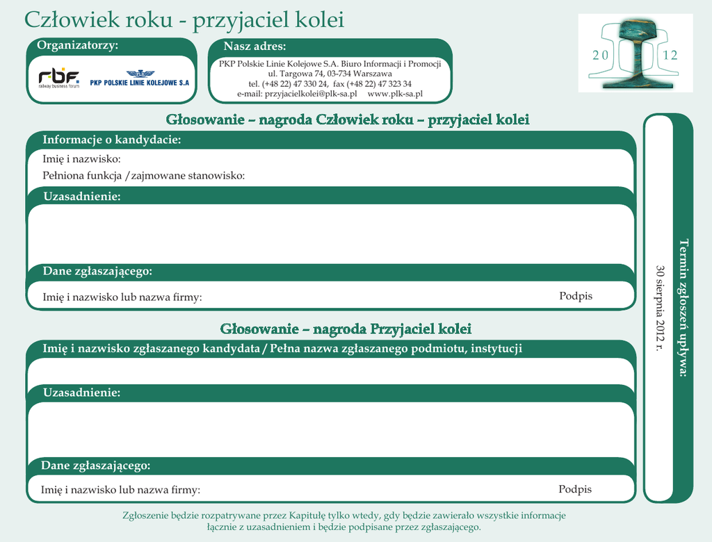 Człowiek roku - przyjaciel kolei Organizatorzy: Nasz adres: PKP Polskie Linie Kolejowe S.A. Biuro Informacji i Promocji ul. Targowa 74, 03-734 Warszawa tel. (+48 22) 47 330 24, fax (+48 22) 47 323 34 e-mail: [email protected] www.plk-sa.pl Głosowanie – nagroda Człowiek roku – przyjaciel kolei Informacje o kandydacie: Imię i nazwisko: Pełniona funkcja /zajmowane stanowisko: Uzasadnienie:o kandydacie: Informacje Głosowanie – nagroda Przyjaciel kolei Imię i nazwisko zgłaszanego kandydata / Pełna nazwa zgłaszanego podmiotu, instytucji Uzasadnienie: Dane zgłaszającego: Imię i nazwisko lub nazwa firmy: Podpis Zgłoszenie będzie rozpatrywane przez Kapitułę tylko wtedy, gdy będzie zawierało wszystkie informacje łącznie z uzasadnieniem i będzie podpisane przez zgłaszającego. Termin zgłoszeń upływa: Podpis Imię i nazwisko lub nazwa firmy: 30 sierpnia 2012 r. Dane zgłaszającego: