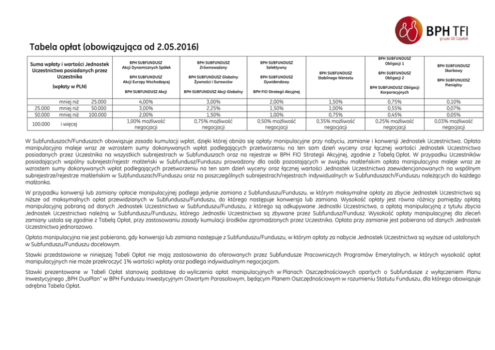 Tabela opłat (obowiązująca od 2.05.2016) Suma wpłaty i wartości Jednostek Uczestnictwa posiadanych przez Uczestnika (wpłaty w PLN) 25.000 50.000 mniej niż mniej niż mniej niż 100.000 i więcej 25.000 50.000 100.000 BPH SUBFUNDUSZ Akcji Dynamicznych Spółek BPH SUBFUNDUSZ Akcji Europy Wschodzącej BPH SUBFUNDUSZ Zrównoważony BPH SUBFUNDUSZ Globalny Żywności i Surowców BPH SUBFUNDUSZ Obligacji 1 BPH SUBFUNDUSZ Selektywny BPH SUBFUNDUSZ Dywidendowy BPH SUBFUNDUSZ Akcji BPH SUBFUNDUSZ Akcji Globalny BPH FIO Strategii Akcyjnej 4,00% 3,00% 2,00% 1,00% możliwość negocjacji 3,00% 2,25% 1,50% 0,75% możliwość negocjacji 2,00% 1,50% 1,00% 0,50% możliwość negocjacji BPH SUBFUNDUSZ Stabilnego Wzrostu BPH SUBFUNDUSZ Obligacji 2 BPH SUBFUNDUSZ Obligacji Korporacyjnych 1,50% 1,00% 0,75% 0,35% możliwość negocjacji 0,75% 0,55% 0,45% 0,25% możliwość negocjacji BPH SUBFUNDUSZ Skarbowy BPH SUBFUNUDSZ Pieniężny 0,10% 0,07% 0,05% 0,03% możliwość negocjacji W Subfunduszach/Funduszach obowiązuje zasada kumulacji wpłat, dzięki której obniża się opłaty manipulacyjne przy nabyciu, zamianie i konwersji Jednostek Uczestnictwa. Opłata manipulacyjna maleje wraz ze wzrostem sumy dokonywanych wpłat podlegających przetworzeniu na ten sam dzień wyceny oraz łącznej wartości Jednostek Uczestnictwa posiadanych przez Uczestnika na wszystkich subrejestrach w Subfunduszach oraz na rejestrze w BPH FIO Strategii Akcyjnej, zgodnie z Tabelą Opłat. W przypadku Uczestników posiadających wspólny subrejestr/rejestr małżeński w Subfundusz/Funduszu prowadzony dla osób pozostających w związku małżeńskim opłata manipulacyjna maleje wraz ze wzrostem sumy dokonywanych wpłat podlegających przetworzeniu na ten sam dzień wyceny oraz łącznej wartości Jednostek Uczestnictwa zaewidencjonowanych na wspólnym subrejestrze/rejestrze małżeńskim w Subfunduszach/Funduszu oraz na poszczególnych subrejestrach/rejestrach indywidualnych w Subfunduszach/Funduszu należących do każdego małżonka. W przypadku konwersji lub zamiany opłacie manipulacyjnej podlega jedynie zamiana z Subfunduszu/Funduszu, w którym maksymalne opłaty za zbycie Jednostek Uczestnictwa są niższe od maksymalnych opłat przewidzianych w Subfunduszu/Funduszu, do którego następuje konwersja lub zamiana. Wysokość opłaty jest równa różnicy pomiędzy opłatą manipulacyjną pobraną od danych Jednostek Uczestnictwa w Subfunduszu/Funduszu, z którego są odkupywane Jednostki Uczestnictwa, a opłatą manipulacyjną z tytułu zbycia Jednostek Uczestnictwa należną w Subfunduszu/Funduszu, którego Jednostki Uczestnictwa są zbywane przez Subfundusz/Fundusz. Wysokość opłaty manipulacyjnej dla zleceń zamiany ustala się zgodnie z Tabelą Opłat, przy zastosowaniu zasady kumulacji środków zgromadzonych przez Uczestnika. Opłata przy zamianie jest pobierana od danych Jednostek Uczestnictwa jednorazowo. Opłata manipulacyjna nie jest pobierana, gdy konwersja lub zamiana następuje z Subfunduszu/Funduszu, w którym opłaty za nabycie Jednostek Uczestnictwa są wyższe od ustalonych w Subfunduszu/Funduszu docelowym. Stawki przedstawione w niniejszej Tabeli Opłat nie mają zastosowania do oferowanych przez Subfundusze Pracowniczych Programów Emerytalnych, w których wysokość opłat manipulacyjnych nie może przekroczyć 1% wartości wpłaty oraz podlega indywidualnym negocjacjom. Stawki prezentowane w Tabeli Opłat stanowią podstawę do wyliczenia opłat manipulacyjnych w Planach Oszczędnościowych opartych o Subfundusze z wyłączeniem Planu Inwestycyjnego „BPH DuoPlan” w BPH Funduszu Inwestycyjnym Otwartym Parasolowym, będącym Planem Oszczędnościowym w rozumieniu Statutu Funduszu, dla którego obowiązuje odrębna Tabela Opłat.