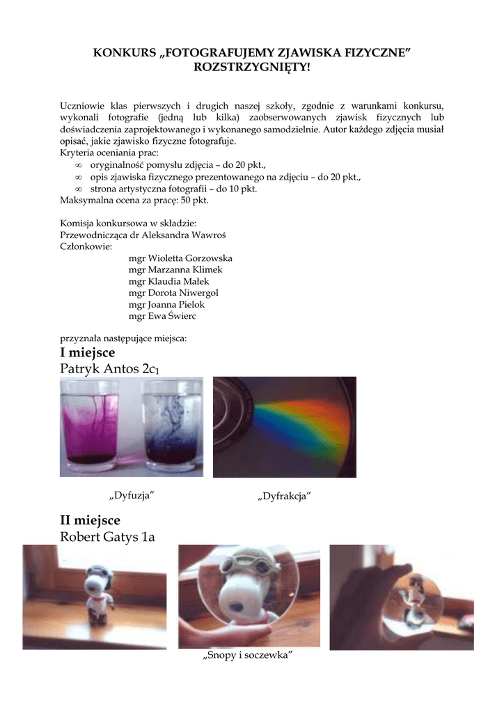 KONKURS „FOTOGRAFUJEMY ZJAWISKA FIZYCZNE” ROZSTRZYGNIĘTY! Uczniowie klas pierwszych i drugich naszej szkoły, zgodnie z warunkami konkursu, wykonali fotografie (jedną lub kilka) zaobserwowanych zjawisk fizycznych lub doświadczenia zaprojektowanego i wykonanego samodzielnie. Autor kaŜdego zdjęcia musiał opisać, jakie zjawisko fizyczne fotografuje. Kryteria oceniania prac: • oryginalność pomysłu zdjęcia – do 20 pkt., • opis zjawiska fizycznego prezentowanego na zdjęciu – do 20 pkt., • strona artystyczna fotografii – do 10 pkt. Maksymalna ocena za pracę: 50 pkt. Komisja konkursowa w składzie: Przewodnicząca dr Aleksandra Wawroś Członkowie: mgr Wioletta Gorzowska mgr Marzanna Klimek mgr Klaudia Małek mgr Dorota Niwergol mgr Joanna Pielok mgr Ewa Świerc przyznała następujące miejsca: I miejsce Patryk Antos 2c1 „Dyfuzja” „Dyfrakcja” II miejsce Robert Gatys 1a „Snopy i soczewka” III miejsce: Anna Kędzia 2c1 „… a szaty jego stały się białe jak śnieg” „Tu rosą umyjesz swe ręce” ElŜbieta Kopyto 2c1 „Pioruny” Mateusz Krawczyk 2c1 „Odbicie światła w tafli wody” Posmyk 2007 WyróŜnienia: Anita Czapla 3aT „Tęcza” Krzysztof Juszczyszyn 2c1 „Alkopoligamia: Załamanie światopoglądu” Izabella Skubała 2c1 „Rozszczepienie światła” Monika Tobiasz 2c1 „Łzy słońca” Magdalena Dubiel 2c1 „Fala kolista” Zwycięzcy konkursu otrzymali pamiątkowe dyplomy oraz nagrody rzeczowe! Organizator dr Aleksandra Wawroś