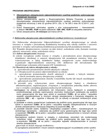 Załącznik nr 4 do SIWZ PROGRAM UBEZPIECZENIA 1. Obowiązkowe ubezpieczenie odpowiedzialności cywilnej podmiotu wykonującego działalność leczniczą 1.1. Zakres ubezpieczenia: zgodny z Rozporządzeniem Ministra Finansów w sprawie obowiązkowego ubezpieczenia odpowiedzialności cywilnej podmiotu wykonującego działalność leczniczą z dnia 22 grudnia 2011r. (Dz. U. Nr 293 z dnia 30.12.2011r., poz. 1729). 1.2. Suma Gwarancyjna: minimalna, zgodna z w/w rozporządzeniem – równowartość w złotych 100 000,- EUR na jedno zdarzenie i 500 000,- EUR na wszystkie zdarzenia. 1.3. Okres ubezpieczenia: 24 miesiące (od marca 2014). 2. Dobrowolne ubezpieczenie odpowiedzialności cywilnej (deliktowej i kontraktowej) 2.1. Dobrowolne ubezpieczenie Odpowiedzialności cywilnej ubezpieczonego za szkody rzeczowe w związku z prowadzoną działalnością leczniczą oraz szkody osobowe i rzeczowe powstałe w związku z prowadzoną działalnością pozamedyczną lub posiadanym mieniem. 2.2. Wypadek ubezpieczeniowy rozumie się jako śmierć, uszkodzenie ciała, doznanie rozstroju zdrowia, zniszczenie, utratę, uszkodzenie rzeczy 2.3. Zakres ubezpieczenia obejmuje: A) szkody wyrządzone osobie trzeciej w związku z prowadzeniem przez ubezpieczonego działalności określonej w umowie ubezpieczenia lub posiadanym mieniem, które jest wykorzystywane w takiej działalności będące następstwem czynu niedozwolonego w granicach odpowiedzialności ustawowej (OC deliktowa) lub niewykonania lub nienależytego wykonania zobowiązania (OC kontraktowa). 2.4. Rozszerza się zakres ubezpieczenia o szkody: a) spowodowane przeniesieniem chorób zakaźnych i zakażeń. 2.1.Ubezpieczyciel nie ponosi odpowiedzialności za szkody: 1) spowodowane przeniesieniem chorób zakaźnych i zakażeń, o których istnieniu w chwili zawierania umowy ubezpieczony wiedział, 2) spowodowane przeniesieniem choroby Creutzfeldta–Jacoba lub innych encefalopatii gąbczastych oraz HIV, b) powstałe przy wykonywaniu przez ubezpieczającego funkcji o charakterze administracyjnym, organizacyjnym, związanym z zarządzaniem jednostką służby zdrowia oraz w związku z posiadaną aparaturą medyczną lub techniczną; c)polegające na utracie, uszkodzeniu lub zniszczeniu rzeczy będących w posiadaniu poszkodowanego podczas wykonywania czynności medycznych (ustanawia się podlimit sumy gwarancyjnej dla tego typu szkód w wysokości 5.000,- zł na jedno i wszystkie wypadki ubezpieczeniowe w rocznym okresie ubezpieczenia z franszyzą integralną na poziomie 200, - zł) – zgodnie z klauzulą OC za szkody w rzeczach wniesionych przez pacjentów d) powstałe w mieniu powierzonym (ustanawia się podlimit sumy gwarancyjnej dla tego typu szkód w wysokości 5.000,- zł na jedno i wszystkie wypadki ubezpieczeniowe w rocznym okresie ubezpieczenia z franszyzą integralną na poziomie 200, - zł e) powstałe wskutek awarii, działania i eksploatacji urządzeń wodno – kanalizacyjnych lub centralnego ogrzewania - ustanawia się podlimit sumy gwarancyjnej dla tego typu szkód w wysokości 100.000,- zł na jedno i wszystkie wypadki ubezpieczeniowe w rocznym okresie ubezpieczenia; f)wyrządzone osobom trzecim w związku z rozbudową, remontem lub modernizacją budynków/ lokali - ustanawia się podlimit sumy gwarancyjnej dla tego typu szkód w wysokości 100.000,- zł na jedno i wszystkie wypadki ubezpieczeniowe w rocznym okresie ubezpieczenia. g)powstałe na skutek rażącego niedbalstwa; h) wyrządzone pracownikom i innym osobom współpracujących na podstawie umów cywilno str. 1 www.spzozparczew.pl 03.02.2014 –prawnych oraz za szkody poniesione przez wolontariuszy i praktykantów – OC pracodawcy z podlimitem sumy gwarancyjnej dla tego typu szkód w wysokości 100.000,- zł na jedno i wszystkie wypadki ubezpieczeniowe w rocznym okresie ubezpieczenia i) powstałe w pojazdach pracowników (odpowiedzialność deliktowa) – nie dotyczy szkód kradzieżowych. Limit: 20 000 zł na jedno i wszystkie wypadki ubezpieczeniowe w rocznym okresie ubezpieczenia 2.5. Warunki szczególne: Warunkiem odpowiedzialności ubezpieczyciela jest zajście wypadku ubezpieczeniowego w rocznym okresie ubezpieczenia oraz zgłoszenie roszczenia z tego tytułu przed upływem terminu przedawnienia. Za wypadek przyjmuje się: śmierć, uszkodzenie ciała, doznanie rozstroju zdrowia, utrata, zniszczenie lub uszkodzenie rzeczy 2.6. Suma Gwarancyjna – 100 000 PLN na jeden i wszystkie wypadki ubezpieczeniowe w rocznym okresie ubezpieczenia 2.7. udział własny w szkodzie: brak; 2.8. brak franszyzy redukcyjnej; 2.9. franszyza integralna na poziomie 200, - zł; 2.10. Okres ubezpieczenia: 24 miesiące (od marca 2014) 2.11. Szkodowość z odpowiedzialności leczniczej w okresie ostatnich 3 lat: Brak szkód. 2.12. Klauzule wymagane: a) klauzula stempla bankowego b) klauzula OC pracodawcy c) klauzula OC za szkody powstałe w rzeczach wniesionych przez pacjentów. 3. Ubezpieczenie mienia od wszystkich ryzyk 3.1. Przedmiot ubezpieczenia 1) budynki wg wartości księgowej brutto (załącznik nr 6 do siwz) na sumę ubezpieczenia 14 393 281,18 zł; Od 01.04.2015 r. wartość budynków zostanie zwiększona o kwotę 3 000 000,- zł Składka ubezpieczeniowa za w/w doubezpieczenie należy wyliczyć metodą „pro rata temporis”; 2) niskowartościowe środki trwałe i pozostałe środki niskowartościowe SU 100 000,- zł, limit na pierwsze ryzyko; 3) mienie pracownicze – limit dla każdego ubezpieczonego 500,- zł; limit łączny 20 000,zł w systemie na pierwsze ryzyko; 4) mienie osób trzecich – limit dla każdego ubezpieczonego 500,- zł, limit łączny 20 000,- zł w systemie na pierwsze ryzyko. 3.2. Ubezpieczenie od kradzieży z włamaniem i rabunkiem – system ubezpieczenia na pierwsze ryzyko, z włączeniem kosztów naprawy zabezpieczeń z podlimitem 10 000,- zł. 3.3. Suma ubezpieczenia kradzieży z włamaniem i rabunkiem dla poszczególnych przedmiotów ubezpieczenia: a) wypos