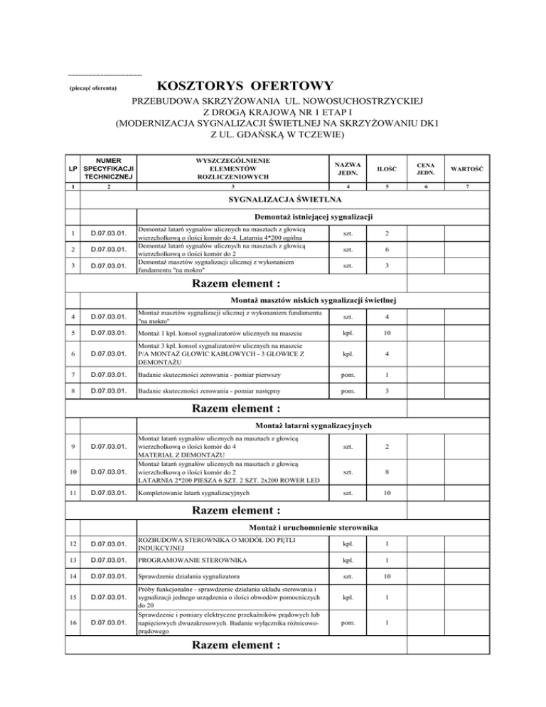 ................................................ (pieczęć oferenta) KOSZTORYS OFERTOWY PRZEBUDOWA SKRZYŻOWANIA UL. NOWOSUCHOSTRZYCKIEJ Z DROGĄ KRAJOWĄ NR 1 ETAP I (MODERNIZACJA SYGNALIZACJI ŚWIETLNEJ NA SKRZYŻOWANIU DK1 Z UL. GDAŃSKĄ W TCZEWIE) NUMER LP SPECYFIKACJI TECHNICZNEJ 1 2 WYSZCZEGÓLNIENIE ELEMENTÓW ROZLICZENIOWYCH NAZWA JEDN. ILOŚĆ CENA JEDN. WARTOŚĆ 3 4 5 6 7 SYGNALIZACJA ŚWIETLNA Demontaż istniejącej sygnalizacji 1 D.07.03.01. 2 D.07.03.01. 3 D.07.03.01. Demontaż latarń sygnałów ulicznych na masztach z głowicą wierzchołkową o ilości komór do 4. Latarnia 4*200 ogólna Demontaż latarń sygnałów ulicznych na masztach z głowicą wierzchołkową o ilości komór do 2 Demontaż masztów sygnalizacji ulicznej z wykonaniem fundamentu "na mokro" szt. 2 szt. 6 szt. 3 Razem element : Montaż masztów niskich sygnalizacji świetlnej 4 D.07.03.01. Montaż masztów sygnalizacji ulicznej z wykonaniem fundamentu "na mokro" 5 D.07.03.01. Montaż 1 kpl. konsol sygnalizatorów ulicznych na maszcie kpl. 10 6 D.07.03.01. Montaż 3 kpl. konsol sygnalizatorów ulicznych na maszcie P/A MONTAŻ GŁOWIC KABLOWYCH - 3 GŁOWICE Z DEMONTAŻU kpl. 4 7 D.07.03.01. Badanie skuteczności zerowania - pomiar pierwszy pom. 1 8 D.07.03.01. Badanie skuteczności zerowania - pomiar następny pom. 3 szt. 4 Razem element : Montaż latarni sygnalizacyjnych 9 D.07.03.01. 10 D.07.03.01. 11 D.07.03.01. Montaż latarń sygnałów ulicznych na masztach z głowicą wierzchołkową o ilości komór do 4 MATERIAŁ Z DEMONTAŻU Montaż latarń sygnałów ulicznych na masztach z głowicą wierzchołkową o ilości komór do 2 LATARNIA 2*200 PIESZA 6 SZT. 2 SZT. 2x200 ROWER LED Kompletowanie latarń sygnalizacyjnych szt. 2 szt. 8 szt. 10 Razem element : Montaż i uruchomnienie sterownika 12 D.07.03.01. ROZBUDOWA STEROWNIKA O MODÓŁ DO PĘTLI INDUKCYJNEJ kpl. 1 13 D.07.03.01. PROGRAMOWANIE STEROWNIKA kpl. 1 14 D.07.03.01. Sprawdzenie działania sygnalizatora szt. 10 15 D.07.03.01. kpl. 1 16 D.07.03.01. pom. 1 Próby funkcjonalne - sprawdzenie działania układu sterowania i sygnalizacji jednego urządzenia o ilości obwodów pomocniczych do 20 Sprawdzenie i pomiary elektryczne przekaźników prądowych lub napięciowych dwuzakresowych. Badanie wyłącznika różnicowoprądowego Razem element : Montaż sygnalizatorów akustycznych 17 D.07.03.01. Montaż sygnalizatora akustycznego sygnalizacji świetlnej szt. 4 Razem element : Budowa kanalizacji kablowej 18 D.07.03.01. Kopanie rowów dla kabli. Wykop wykonywany ręcznie, grunt kat. III. Próbne przekopy 19 D.07.03.01. Zasypanie rowów dla kabli. 20 D.07.03.01. 21 D.07.03.01. 22 D.07.03.01. 23 D.07.03.01. Budowa kanalizacji kablowej z rur PCW w gruncie kat III, liczba warstw w ciągu kanalizacji 1, liczba rur w warstwie 1, liczba otworów w ciągu kanalizacji 1. Budowa studni kablowych prefabrykowanych rozdzielczych SK-1 dwuelementowych, kat. gruntu III Budowa studni kablowych prefabrykowanych rozdzielczych SKR-1 dwuelementowych, kat. gruntu III Pomiary geodezyjne powykonawcze m3 1 m3 1 m 108 studnia 4 studnia 1 kpl. 1 Razem element : Układanie kabli w kanalizacji kablowej, masztach i rurach 24 D.07.03.01. 25 D.07.03.01. 26 D.07.03.01. 27 D.07.03.01. 28 D.07.03.01. 29 D.07.03.01. 30 D.07.03.01. 31 D.07.03.01. 32 D.07.03.01. 33 D.07.03.01. Układanie kabli wielożyłowych o masie do 1,0 kg/m w rurach, pustakach lub kanałach zamkniętych. Kabel YKSY30x1,5 Układanie kabli wielożyłowych o masie do 0,5 kg/m w rurach, pustakach Układanie kabli w rurach i kanalizacji kablowej. Kabel YStY 8x2,5 mm2 Układanie kabli w rurach i kanalizacji kablowej. Kabel YStY 6x2,5 mm2 Układanie kabli w rurach i kanalizacji kablowej. Kabel YStY 4x2,5 mm2 Układanie kabli w rurach i kanalizacji kablowej. Kabel YStY 2x2,5 mm2 Obróbka kabli sygnalizacyjnych wielożyłowych Obróbka na sucho kabli sygnalizacyjnych wielożyłowych bez pancerza na napięcie do 1kV, kabel nieuzbrojony o ilości żył do 32 Badanie linii kablowej sterowniczej. Kabel sygnalizacyjny w ilości zył 10. W tym dwukrotny pomiar pętli. Badanie linii kablowej średniego napięcia, niskiego napięcia i sterowniczej. Kabel sygnalizacyjny o ilości żył 30. m 80 m 35 m 45 m 25 m 115 m 61 szt. 4 szt. 6 odc. 11 odc. 3 Razem element : Wykonanie petli indukcyjnych 34 D.07.03.01. 35 D.07.03.01. 36 D.07.03.01. 37 D.07.03.01. WYKONANIE PĘTLI INDUKCYJNYCH W JEZDNI CZTEROZWOJOWYCH WYKONANIE PĘTLI INDUKCYJNYCH W JEZDNI TRZYZWOJOWA Wypełnienie szczelin głębokości 14 cm i szerokości 2 cm masą zalewową. Zalewanie pętli Mufy z tworzyw termokurczliwyxh przelotowe na kablach o izolacji i powłoce z tworzyw sztucznych w rowach kablowych. Mufa na kablu pętlowym. m 54 m 204 m 258 szt. 15 Razem element : OGÓŁEM CENA NETTO : (podpis i pieczęć oferenta)