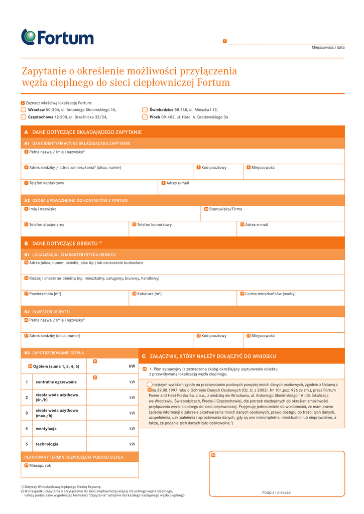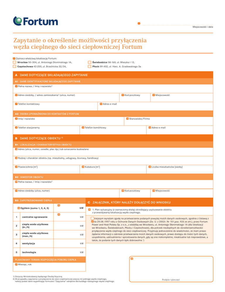 1 Miejscowość i data Zapytanie o określenie możliwości przyłączenia węzła cieplnego do sieci ciepłowniczej Fortum 2 Zaznacz właściwą lokalizację Fortum: Wrocław 50-304, ul. Antoniego Słonimskiego 1A, Świebodzice 58-160, ul. Mieszka I 13, Częstochowa 42-200, ul. Brzeźnicka 32/34, Płock 09-402, ul. Harc. A. Gradowskiego 3a A DANE DOTYCZĄCE SKŁADAJĄCEGO ZAPYTANIE A1 DANE IDENTYFIKACYJNE SKŁADAJĄCEGO ZAPYTANIE 3 Pełna nazwa / Imię i nazwisko1) 4 Adres siedziby / adres zamieszkania1) (ulica, numer) 7 Telefon kontaktowy 5 8 Kod pocztowy 6 Miejscowość Adres e-mail A2 OSOBA UPOWAŻNIONA DO KONTAKTÓW Z FORTUM 9 Imię i nazwisko 11 Telefon stacjonarny 10 12 Stanowisko/Firma Telefon komórkowy 13 Adres e-mail 19 Liczba mieszkańców [osoby] B DANE DOTYCZĄCE OBIEKTU 2) B1 LOKALIZACJA I CHARAKTERYSTYKA OBIEKTU 15 Adres (ulica, numer, osiedle, plac itp.) lub oznaczenie budowlane 16 Rodzaj i charakter obiektu (np. mieszkalny, usługowy, biurowy, handlowy) 17 Powierzchnia [m2] 18 Kubatura [m3] B2 INWESTOR OBIEKTU 20 Pełna nazwa / Imię i nazwisko1) 21 Adres siedziby (ulica, numer) 22 B3 ZAPOTRZEBOWANIE CIEPŁA 24 1 Ogółem (suma 1, 3, 4, 5) centralne ogrzewanie 26 25 23 Miejscowość C ZAŁĄCZNIK, KTÓRY NALEŻY DOŁĄCZYĆ DO WNIOSKU kW kW 28 1. Plan sytuacyjny (z zaznaczoną skalą) określający usytuowanie obiektu z przewidywaną lokalizacją węzła cieplnego. Niniejszym wyrażam zgodę na przetwarzanie podanych powyżej moich danych osobowych, zgodnie z Ustawą z 29.08.1997 roku o Ochronie Danych Osobowych (Dz. U. z 2002r. Nr 101,poz. 926 ze zm.), przez Fortum Power and Heat Polska Sp. z o.o., z siedzibą we Wrocławiu, ul. Antoniego Słonimskiego 1A (dla lokalizacji we Wrocławiu, Świebodzicach, Płocku i Częstochowie), dla potrzeb niezbędnych do określeniamożliwości przyłączenia węzła cieplnego do sieci ciepłowniczej. Przyjmuję jednocześnie do wiadomości, że mam prawo żądania informacji o zakresie przetwarzania moich danych osobowych, prawo dostępu do treści tych danych, uzupełnienia, uaktualnienia i sprostowania danych, gdy są one niekompletne, nieaktualne lub nieprawdziwe, a także, że podanie tych danych było dobrowolne.1) 29 dnia 2 ciepła woda użytkowa (śr./h) kW 3 ciepła woda użytkowa (max./h) kW 4 wentylacja kW 5 technologia kW PLANOWANY TERMIN ROZPOCZĘCIA POBORU CIEPŁA 27 Kod pocztowy 30 Miesiąc, rok 1) Dotyczy Wnioskodawcy będącego Osobą fizyczną. 2) W przypadku zapytania o przyłączenie do sieci ciepłowniczej więcej niż jednego węzła cieplnego, należy podać dane wypełniając formularz “Zapytania” odrębnie dla każdego następnego węzła cieplnego. Podpis i pieczęć