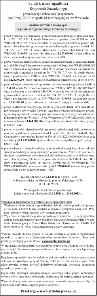 Syndyk masy upadłości Krzysztofa Zawadzkiego prowadzącego działalność gospodarczą pod firmą PREiB w upadłości likwidacyjnej zs. we Wrocławiu ogłasza sprzedaż z wolnej ręki w formie nieograniczonego przetargu pisemnego: 1. prawa własności nieruchomości gruntowej niezabudowanej w granicach działki nr 7/3 i 7/6 AM-11, obręb Marszowice o powierzchni 10.284 m2, KW WR1K/00213870/5 wraz z udziałem w wysokości 442/4090 w prawie własności nieruchomości gruntowych niezabudowanych w granicy działek 7/1, 7/4, 7/5, i 7/7, AM-11, obręb Marszowice o powierzchni 0,4248 ha, KW WR1K/00153865/8, za cenę nie niższą niż 1.127.600,00 (jeden milion sto dwadzieścia siedem tysięcy sześćset) zł netto + VAT, 2. prawa własności nieruchomości gruntowej niezabudowanej w granicach działki nr 2 AM-10, obręb Marszowice o powierzchni 8.600 m2, KW WR1K/0039151/5 wraz z udziałem w wysokości 370/4090 w prawie własności nieruchomości gruntowych w granicach działek nr 7/1, 7/4, 7/5, 7/7 AM-11, obręb Marszowice o powierzchni 0,4248 ha, KW WR1K/00153865/8, za cenę nie niższą niż 1.128.000,00 (jeden milion sto dwadzieścia osiem tysięcy) zł netto + VAT, 3. prawa własności nieruchomości gruntowej niezabudowanej w granicach działki nr 1 AM-10, obręb Marszowice o powierzchni 7.900 m2, KW WR1K/00153866/5 wraz z udziałem w wysokości 339/4090 w prawie własności nieruchomości gruntowych w granicach działek nr 7/1, 7/4, 7/5, 7/7 AM-11, obręb Marszowice o powierzchni 0,4248 ha, KW WR1K/00153865/8, za cenę nie niższą niż 1.036.000,00 (jeden milion trzydzieści sześć tysięcy) zł netto + VAT, 4. prawa użytkowania wieczystego gruntu w granicach działki nr 1 AM-40, obręb Południe o powierzchni 6.996 m2 oraz prawo własności budynków produkcyjno-magazynowych stanowiących przedmiot odrębnej od gruntu własności, położonych przy ul. Wilczej 7-13 we Wrocławiu, KW WR1K/00037190/6, za cenę nie niższą niż 4.144.000,00 (cztery miliony sto czterdzieści cztery tysiące) zł netto + VAT, 5. prawa własności nieruchomości gruntowej zabudowanej halą produkcyjną oraz wiatą stalową w granicach działek nr 4012/9 i 4012/15 AM-28, obręb Ostrzeszów o powierzchni łącznej 6.470 m2, KW KZ1O/00040064/0 za cenę nie niższą niż 1.655.000,00 (jeden milion sześćset pięćdziesiąt pięć tysięcy) zł netto + VAT, 6. prawa własności nieruchomości gruntowej zabudowanej budynkiem administracyjno-produkcyjno-magazynowym o powierzchni 298,83 m2 oraz nieruchomości zabudowanej domem mieszkalnym dwurodzinnym w budowie o powierzchni użytkowej 297,60 m2 w granicach działki nr 26 AM-14, obręb Brochów o powierzchni 5.006 m2, przy ul. Dróżniczej 56 we Wrocławiu, KW WR1K/00020663/1, za cenę nie niższą niż 2.528.000,00 (dwa miliony pięćset dwadzieścia osiem tysięcy) zł netto + VAT. Przetarg odbędzie się 7.12.2011 r. o godz. 12.00 w biurze syndyka we Wrocławiu przy ul. Pułaskiego 48/50, tel. 71 341 95 19. W przypadku bezskutecznego przetargu, kolejne przetargi odbędą się 29.12.2011 r. i 26.01.2012 r. Warunkiem uczestnictwa w przetargu nieograniczonym jest: 1. Wysłanie z odpowiednim wyprzedzeniem lub złożenie w przeddzień przetargu do godz. 14.00 w biurze syndyka w zamkniętej kopercie z napisem „Przetarg” pisemnej oferty zgodnej z wymogami regulaminu. 2. Wpłacenie w przeddzień przetargu wadium w wysokości 1% ceny wywoławczej na rachunek bankowy masy upadłości Krzysztof Zawadzki PREiB w upadłości likwidacyjnej w Nordea Bank Polski S.A. O/Wrocław nr 33 1440 1156 0000 0000 1371 7354, z podaniem tytułu wpłaty „Przetarg”. Wyboru oferenta dokona syndyk w dniach przetargu, zgodnie z regulaminem sprzedaży, na podstawie pisemnych ofert prawidłowo złożonych. Regulamin przetargu dostępny jest na stronie www.ardobiejewska.pl. W przypadku złożenia ofert równorzędnych syndyk kwalifikuje te oferty do licytacji ustnej, która zostanie przeprowadzona w biurze syndyka w dniach przetargu o godz. 14.00. Regulamin sprzedaży jest do wglądu w dni powszednie w biurze syndyka oraz w biurze we Wrocławiu przy ul. Wilczej 7-13, tel. 71 346 45 45 w godz. 9-14, gdzie również można uzyskać dodatkowe informacje dotyczące przedmiotu sprzedaży i przetargu. Organizator przetargu nieograniczonego zastrzega sobie prawo swobodnego wyboru oferty oraz prawo odwołania, przerwania lub unieważnienia przetargu. Wszelkie koszty związane z przeniesieniem własności nieruchomości łącznie z kosztami wykreślenia hipotek ponosi nabywca. Przetargi – www.ardobiejewska.pl