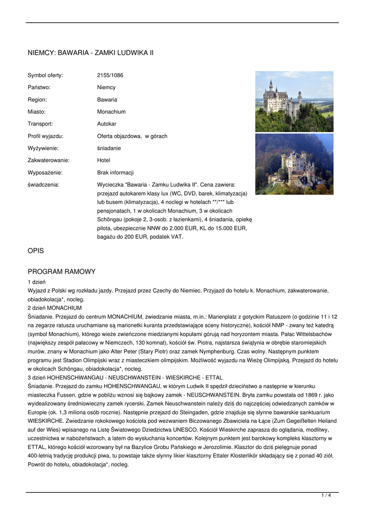 NIEMCY: BAWARIA - ZAMKI LUDWIKA II Symbol oferty: 2155/1086 Państwo: Niemcy Region: Bawaria Miasto: Monachium Transport: Autokar Profil wyjazdu: Oferta objazdowa, w górach Wyżywienie: śniadanie Zakwaterowanie: Hotel Wyposażenie: Brak informacji świadczenia: Wycieczka "Bawaria - Zamku Ludwika II". Cena zawiera: przejazd autokarem klasy lux (WC, DVD, barek, klimatyzacja) lub busem (klimatyzacja), 4 noclegi w hotelach **/*** lub pensjonatach, 1 w okolicach Monachium, 3 w okolicach Schöngau (pokoje 2, 3-osob. z łazienkami), 4 śniadania, opiekę pilota, ubezpiecznie NNW do 2.000 EUR, KL do 15.000 EUR, bagażu do 200 EUR, podatek VAT. OPIS PROGRAM RAMOWY 1 dzień Wyjazd z Polski wg rozkładu jazdy. Przejazd przez Czechy do Niemiec. Przyjazd do hotelu k. Monachium, zakwaterowanie, obiadokolacja*, nocleg. 2 dzień MONACHIUM Śniadanie. Przejazd do centrum MONACHIUM, zwiedzanie miasta, m.in.: Marienplatz z gotyckim Ratuszem (o godzinie 11 i 12 na zegarze ratusza uruchamiane są marionetki kuranta przedstawiające sceny historyczne), kościół NMP - zwany też katedrą (symbol Monachium), którego wieże zwieńczone miedzianymi kopułami górują nad horyzontem miasta. Pałac Wittelsbachów (największy zespół pałacowy w Niemczech, 130 komnat), kościół św. Piotra, najstarsza świątynia w obrębie staromiejskich murów, znany w Monachium jako Alter Peter (Stary Piotr) oraz zamek Nymphenburg. Czas wolny. Następnym punktem programu jest Stadion Olimpijski wraz z miasteczkiem olimpijskim. Możliwość wyjazdu na Wieżę Olimpijską. Przejazd do hotelu w okolicach Schöngau, obiadokolacja*, nocleg. 3 dzień HOHENSCHWANGAU - NEUSCHWANSTEIN - WIESKIRCHE - ETTAL Śniadanie. Przejazd do zamku HOHENSCHWANGAU, w którym Ludwik II spędził dzieciństwo a następnie w kierunku miasteczka Fussen, gdzie w pobliżu wznosi się bajkowy zamek - NEUSCHWANSTEIN. Bryła zamku powstała od 1869 r. jako wyidealizowany średniowieczny zamek rycerski. Zamek Neuschwanstein należy dziś do najczęściej odwiedzanych zamków w Europie (ok. 1,3 miliona osób rocznie). Następnie przejazd do Steingaden, gdzie znajduje się słynne bawarskie sanktuarium WIESKIRCHE. Zwiedzanie rokokowego kościoła pod wezwaniem Biczowanego Zbawiciela na Łące (Zum Gegeißelten Heiland auf der Wies) wpisanego na Listę Światowego Dziedzictwa UNESCO. Kościół Wieskirche zaprasza do oglądania, modlitwy, uczestnictwa w nabożeństwach, a latem do wysłuchania koncertów. Kolejnym punktem jest barokowy kompleks klasztorny w ETTAL, którego kościół wzorowany był na Bazylice Grobu Pańskiego w Jerozolimie. Klasztor do dziś pielęgnuje ponad 400-letnią tradycję produkcji piwa, tu powstaje także słynny likier klasztorny Ettaler Klosterlikör składający się z ponad 40 ziół. Powrót do hotelu, obiadokolacja*, nocleg. 1/4 4 dzień LINDERHOF - GARMISCH PARTENKIRCHEN Śniadanie. Przejazd do neobarokowego zamku LINDERHOF, który powstał na bazie domku myśliwskiego rodziny książęcej. W latach 1869-1878 był rozbudowywany wraz z ogrodami (słynna Grota Venus) do obecnej postaci. Pomimo najmniejszych rozmiarów ze wszystkich zamków był on ulubionym przez Ludwika II. Przejazd do GARMISCH PARTENKIRCHEN - miejscowości słynącej z organizacji Zimowych Igrzysk Olimpijskich i Turnieju Czterech Skoczni. Spacer po Stadionie Olimpijskim. Wyjazd kolejką na Eckbauer (przepiękna panorama Alp), piesza wycieczka przez Wąwóz Partnachklamm. Krótki spacer po centrum miasteczka. Powrót do hotelu, obiadokolacja*, nocleg. 5 dzień PRIEN - HERRENCHIEMSEE Śniadanie. Przejazd do PRIEN. Rejs statkiem po Jeziorze Chiemsee na wyspę Herreninsel. Spacer do zamku HERRENCHIEMSEE, wybudowanego na podobieństwo Wersalu w latach 1878-1886 na zamówienie króla Ludwika II, który kupił wyspę w 1873 roku. Zwiedzanie. Późnym popołudniem wyjazd w drogę powrotną do Polski. 6 dzień Powrót do kraju w godzinach porannych. * dopłata do 4 obiadokolacji: + 290 zł WAŻNE INFORMACJE - cena nie zawiera biletów wstępu do zwiedzanych obiektów oraz lokalnych przewodników, ok. 100 €, - dopłata do pokoju 1 osobowego + 300 zł, - cena nie zawiera świadczeń nie wymienionych w ofercie. TRANSPORT Autobusy podstawowe wyjeżdżają z Katowic lub Krakowa. Z pozostałych miast realizowane są tzw. połączenia antenowe przy min. 6 osobach, realizowane różnymi środkami transportu: samochód osobowy, bus, pociąg, autobusy liniowe. Połączenia antenowe potwierdzane są na 72 godziny przed datą wyjazdu. Linia zachodnia: Wrocław - Opole - Gliwice - KATOWICE Linia północna A: Łódź - Piotrków Tryb. - Częstochowa - KATOWICE Linia północna B: Warszawa - Radom - Skarżysko-Kamienna - Kielce - KRAKÓW - KATOWICE Linia wschodnia: Rzeszów - Dębica - Tarnów - KRAKÓW - KATOWICE Linia południowa: Tychy - KATOWICE 2/ Przewozy antenowe są skomunikowane ze sobą co może powodować oczekiwanie w miejscach przesiadkowych, zwłaszcza w terminach powrotu. 3/ Każdy pasażer może zabrać ze sobą 1 szt. bagażu podstawowego do 20 kg i bagażu podręcznego o wadze do 5 kg. Istnieje możliwość wyjazdu z innych miejscowości po uzgodnieniu z Biurem ARION. TERMINY: od: 2017-03-20 do: 2017-03-25 (6 dni), miejsca: sprawdź miejsca cena od: 1185 PLN od: 2017-04-28 do: 2017-05-03 (6 dni), miejsca: sprawdź miejsca cena od: 1245 PLN od: 2017-06-12 do: 2017-06-17 (6 dni), miejsca: sprawdź miejsca cena od: 1245 PLN od: 2017-07-24 do: 2017-07-29 (6 dni), miejsca: sprawdź miejsca cena od: 1245 PLN od: 2017-08-14 do: 2017-08-19 (6 dni), miejsca: sprawdź miejsca cena od: 1245 PLN od: 2017-10-02 do: 2017-10-07 (6 dni), miejsca: sprawdź miejsca cena od: 1245 PLN CENNIK: Długość pobytu: 6 dni 6 dni Grupa cenowa: A B (-) (-) (-) (-) Ubezpieczenie (obligatoryjne) (*) ubezpieczenie KL i NNW Transport (obligatoryjny) (*) przejazd autokarem klasy lux lub busem Pakiet (obligatoryjny) 2/4 (*) pakiet świadczeń wg oferty Miasto wyjazdowe (do wyboru) (-) wyjazd 