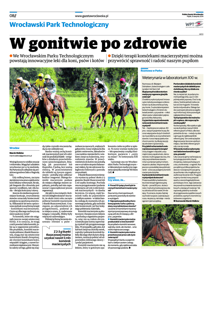 08// Polska Gazeta Wrocławska Piątek, 8 sierpnia 2014 www.gazetawroclawska.pl Wrocławski Wrocław Park Technologiczny 4287121 W gonitwie po zdrowie A We Wrocławskim Parku Technologicznym A Dzięki terapii komórkami macierzystymi można powstają innowacyjne leki dla koni, psów i kotów przywrócić sprawność i radość naszym pupilom Rozmowa w Parku Wrocław Marcin Walków [email protected] Wyścigi konne to wielkie emocje i widowisko. Mogą być udziałem wrocławian już w tę niedzielę. Na Partynicach odbędzie się prestiżowa gonitwa Oaks o Nagrodę Liry. Gdy milkną brawa, zaczyna się intensywna praca opiekunów koni i lekarzy weterynarii. Bo tak, jak bieganie dla człowieka jest sporym wysiłkiem, tak i dla konia – obciąża kończyny i stawy. Jeszcze do niedawna poważniejsze kontuzje, zwyrodnienia stawów oznaczały konieczność przejścia na sportową emeryturę. Kilkanaście lat temu opracowano jednak nową formę terapii – komórkami macierzystymi. Czym są i dlaczego zachwyca się nimi naukowy świat? To komórki, które nie osiągnęły jeszcze swojej ostatecznej formy. A to oznacza, że mogą z nich powstać takie komórki, jakie są w organizmie potrzebne. Dla przykładu, komórki macierzyste pobrane z tkanki tłuszczowej, mogą stać się ostatecznie komórkami tkanki chrzęstnej, ale również komórkami kości, więzadeł i ścięgien, a nawet komórkami mięśniowymi. Wszystko zależy od tego, gdzie się znaj- dą i jakie czynniki otoczenia będą na nie oddziaływać. Bardzo ważną cechą komórek macierzystych jest ich zdolność do produkcji białek – związków o działaniu przeciwbólowym i przeciwzapalnym. Działają jak paracetamol lub ibuprofen. Z jedną, lecz ważną różnicą. W przeciwieństwie do tabletki są żywym organizmem – potrafią więc odbierać bodźce i reagować. Dlatego komórki macierzyste podane do miejsca objętego stanem zapalnym, potrafią nad nim zapanować i zapoczątkować proces regeneracji. Ale jaki to ma związek z końmi i ich dolegliwościami? Ano taki, że około 2000 roku zaczęto pobierać komórki macierzyste z tkanki tłuszczowej koni. A następnie, po odpowiednim ich przygotowaniu, podawać je w miejsca urazu, tj. naderwane ścięgna i więzadła. Efekty były więcej niż zadowalające. Później tę formę leczenia stosowano również u psów – Z 2-3 g tkanki tłuszczowej można uzyskać nawet 5 mln komórek macierzystych zwłaszcza rasowych, większych gabarytów. Coraz większa liczba golden retrieverów, labradorów i owczarków niemieckich z wiekiem cierpi na kulawiznę, zwyrodnienia stawów. W przeciwieństwie do kotów nie potrafią one w aż takim stopniu balansować ciałem, by nie odczuwać dolegliwości bólowych z powodu zwyrodnień. Z tkanki tłuszczowej zwierzęcia wystarczy pobrać około 2-3 gramów tkanki tłuszczowej lub 5 ml szpiku kostnego. Pozwala ona na przygotowanie i podanie zwierzęciu od 3 do 5 mln komórek macierzystych – to dawka lecznicza. Co więcej, część komórek trafia do pojemników z ciekłym azotem – w takim banku czekają do momentu ich ponownego podania, gdy zachodzi taka konieczność, już bez kolejnego pobierania materiału. Komórki macierzyste są skutecznym i bezpiecznym lekiem – pochodzą z organizmu pacjenta, więc nie są ciałem obcym. A restrykcyjne normy zapewniają czystość tak przygotowanego leku. W przypadku, gdy pies, kot lub koń cierpi na choroby nerek, wątroby i pobranie komórek byłoby dla niego zbyt dużym obciążeniem, można je pobrać od odpowiednio dobranego dawcy – i podać pacjentowi. Komórki macierzyste nie są lekiem, który w gotowym opa- kowaniu czeka na półce w aptece. To nowy wymiar medycyny — lek opracowany z myślą o konkretnym pacjencie i „szyty na miarę”. To weterynaria XXI wieku. I powstaje ona we Wrocławskim Parku Technologicznym – w laboratorium medycyny regeneracyjnej dla zwierząt Vet Stem Cell. a Czy wiesz, że... a Ponad 10 tysięcy koni było leczonych komórkami macierzystymi? Dwa na trzy z koni sportowych po leczeniu powróciły do startów w wyścigach. a Najczęstszą jednostką chorobową aparatu ruchu u psów są stany zwyrodnieniowe stawów? Leczenie ich komórkami macierzystymi przynosi poprawę utrzymującą się od 6 do 24 miesięcy u 80 proc. pacjentów. a Komórki macierzyste można przekształcić w inne komórki? Na przykład w komórki nerwowe, wątroby, nerek, ale również... w komórki mięśnia sercowego. a Komórki macierzyste można przechowywać przez całe życie zwierzęcia? W specjalnym banku w pojemnikach z ciekłym azotem czekają do momentu, gdy zajdzie potrzeba ich ponownego podania. a Rozmowa z dr. Błażejem Dolniakiem, biotechnologiem i założycielem Vet Stem Cell Skąd pomysł na laboratorium medycyny regeneracyjnej dla zwierząt? Chcieliśmy wykorzystywać innowacyjne metody powstające w laboratoriach, by skutecznie leczyć koty, psy i konie. Z wykształcenia jestem biotechnologiem z 16-letnim doświadczeniem, a prywatnie — miłośnikiem psów i właścicielem pięknego konia Miss Aleksandry. Czy jest duże zapotrzebowanie na leczenie komórkami macierzystymi? Tak — i będzie jeszcze większe. 80 proc. naszych pacjentów to psy. Bo coraz więcej psów dużych i średnich ras ma problemy ze zwyrodnieniami stawów. I coraz więcej opiekunów chce im pomóc, by dłużej cieszyły się zdrowiem i sprawnością. Przy jakich schorzeniach zwierząt stosowana jest ta terapia? Urazy ścięgien i więzadeł, urazy mięśni i stany zapalne kości, złamania kości, trudno gojące się rany, choroby zwyrodnieniowe stawów. I choć wymieniam jednym tchem, nie jest to cała lista. Wspomnę tylko jeszcze o przewlekłej niewydolności nerek – wówczas podajemy komórki macierzyste dożylnie. Czy leczenie komórkami macierzystymi jest skuteczne? Przeprowadziliśmy badania skuteczności terapii regeneracyjnej. Wyniki — ponad 83 proc. skuteczności. Czyli utrzymanie
