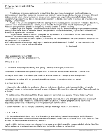 Specjalny Ośrodek Szkolno-Wychowawczy Nr 1 Z życia przedszkolaków 05.09.2016. Przedszkole przyjazne dziecku to takie, które daje swoim podopiecznym możliwość rozwoju zainteresowań, talentów, zapewnia zaspokojenie potrzeby uznania, aprobaty, stwarza przyjazny klimat i daje poczucie więzi z innymi. Jednym ze sposobów budowania wspólnoty przedszkolnej opartej na wzajemnym porozumieniu dzieci, nauczycieli i rodziców a także środowiska lokalnego są organizowane imprezy i uroczystości. Mając to na uwadze zorganizowałyśmy szereg imprez i uroczystości z udziałem rodziców, dziadków, uczniów szkół miasta Przemyśla i okolic, władz miasta Przemyśla oraz innych zaproszonych gości. Niektóre podejmowane przez nas inicjatywy zostały opisane w prasie lokalnej. Organizacja tych imprez i uroczystości w znacznym stopniu przyczyniła się do poszerzenia zakresu pracy przedszkola. Było to możliwe dzięki integrowaniu różnych środowisk, zapraszaniu władz miasta Przemyśla, sponsorów, rodziców. Wyjątkowość naszych imprez , polegała na wyzwoleniu w uczestnikach ducha spontanicznej zabawy z zachowaniem wysokiej klasy artystycznej. Celem prowadzonych imprez było to, aby bawiąc się i współtworząc na żywo program wszyscy czuli się gwiazdami tych spotkań. Wszystkie organizowane przez nas imprezy zawierają wiele twórczych działań i w znacznym stopniu rozszerzają zakres pracy całego Ośrodka. L. Kapłoniak Rok przedszkolny 2016/2017 Witamy w nowym roku przedszkolnym. WRZESIEŃ - 1 września rozpoczęliśmy Nowy Rok pracy i zabawy w naszym przedszkolu. - Pierwsza urodzinowa uroczystość w tym roku. 7 świeczek zdmuchiwała Kamilka - 100 lat !!!!!! - Kolejne urodzinki - 7 lat skończyła Oliwka a 4 latka Sebastian. Wszyscy wesoło się bawili. - Pod koniec września 100 lat głośno śpiewaliśmy również dumnej ośmiolatce - Natali. PAŹDZIERNIK - 18 października odbyło się spotkanie z Panem Leśniczym. Podczas zajęć dowiedzieliśmy się wielu ciekawych rzeczy o zachowaniu zwierząt w naszych lasach. Obejrzeliśmy również bajkę "Jak zachować się w lesie." - W październiku 8 lat skończył Filip. Długo będziemy pamiętać jego pyszny "Angry Birds'owy" tort. - Święto pieczonego ziemniaka to już nasza coroczna tradycja. Pani Ewa przygotowała dużo ciekawych konkursów dla dzieci i rodziców. Wszyscy świetnie się bawili. Finałem programu była oczywiście degustacja grilowanej kiełbaski i pysznych pieczonych ziemniaczków. - Dzień Papieski - po raz kolejny uczciliśmy pamięć Wielkiego Polaka - Jana Pawła II LISTOPAD - 21 listopada odwiedził nas cyrk! Mieliśmy okazję aby dotknąć prawdziwego węża, jeździliśmy na jednokołowym rowerku i oglądaliśmy mnóstwo ciekawych, magicznych sztuczek. Było dużo śmiechu. Ten występ na długo pozostanie w naszej pamięci. - Andrzejki to świetna muzyczna zabawa, integrująca wszystkich uczniów z przedszkola i szkoły. Wspólne tańce, zabawy z chustą animacyjną i balonami to jest to co lubimy najbardziej. http://przedszkole.d6.pl Kreator PDF Utworzono 7 March, 2017, 12:04 Specjalny Ośrodek Szkolno-Wychowawczy Nr 1 - Ogólnopolski Dzień Praw Dziecka - 25 listopada w naszym ośrodku można było odbyć podróż po stoiskach prezentujących nasze prawa: do bezpieczeństwa, zabawy, zdrowego trybu życia. W ciekawy, dostępny dla nas sposób dowiedzieliśmy się jak żyć bezpiecznie i mieć szczęśliwe dzieciństwo. - Pani Alinka dba o nasz kontakt z żywą poezją. Z okazji Dnia Pluszowego Misia zaprosiła do nas poetkę dziecięcą - panią Agatę Widzowską. Poetka czytała nam swoje wiersze, opowiadała o bohaterach swoich utworów i dużo z nami rozmawiała o naszych pluszowych przyjaciołach. Na to spotkanie zaprosiliśmy naszych kolegów i koleżanki z zaprzyjaźnionego przedszkola miejskiego nr 16. Im więcej dzieci do zabawy tym weselej! Dzieci razem z nauczycielami zaprosili nas na jasełka, które przygotują i przedstawią dla nas w styczniu. Już nie możemy siś doczekać! GRUDZIEŃ - Zapiecek to pracownia ceramiki w Przemyślu. 5 grudnia mieliśmy okazję do samodzielnej pracy w glinie. Wykonywaliśmy elementy większego dzieła zatytułowanego "Mały Księże". Finał naszej pracy można oglądać na naszej stołówce - efekt końcowy wygląda imponująco. - Grudzień kojarzy nam się z jedną osobą - Świętym Mikołajem! Oczywiście byliśmy wszyscy bardzo grzeczni i każdy z nas otrzymał prezent. Nawet nasi nauczyciele musieli być bardzo dobrzy bo i dla nich Mikołaj miał słodkie pakunki! - Jak co roku w grudniu, spotykamy się wszyscy przy wspólnej wieczerzy wigilijnej. Słuchając kolęd dzielimy się opłatkiem i życzymy sobie nawzajem zdrowia, szczęścia i spełnienia marzeń. WESOŁYCH ŚWIĄT I SZCZĘŚLIWEGO NOWEGO ROKU 2017!!!!!!!!!!!!!!! STYCZEŃ - 9 stycznia zostaliśmy zaproszeni przez naszych przyjaciół z przedszkola miejskiego nr 16 na jasełka, które sami przedstawiali. Po występie wszyscy razem bawiliśmy się przy muzyce. - 11 stycznia był dla nas bardzo ważnym dniem. Wzięliśmy udział w XII Przeglądzie Twórczości Osób Niepełnosprawnych pod hasłem "Wszyscy Razem". W Centrum Kulturalnym , na prawdziwej dużej scenie, w świetle lamp przedstawialiśmy scenkę pod tytułem "Światełko w sercu mym". Byliśmy prawdziwymi aktorami!! Otrzymaliśmy dużo głośnych braw! LUTY - luty rozpoczął się zabawą urodzinową Laury! Osiem świeczek rozświetlało Annę i Elzę na słodziutkim torcie. - Kasia - dumna sześciolatka podczas swoich urodzin dbała o to aby każdy dodrze się bawił przy wesołej, tanecznej muzyce. - 29 lutego w ostatki odbyła się w naszym ośrodku wspaniała zabawa karnawałowa. Maski i przebrania były obowiązkowe. Królem balu przedszkolaków został Jaś a królową Arletka. http://przedszkole.d6.pl Kreator PDF Utworzono 7 March, 2017, 12:04