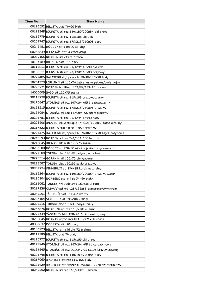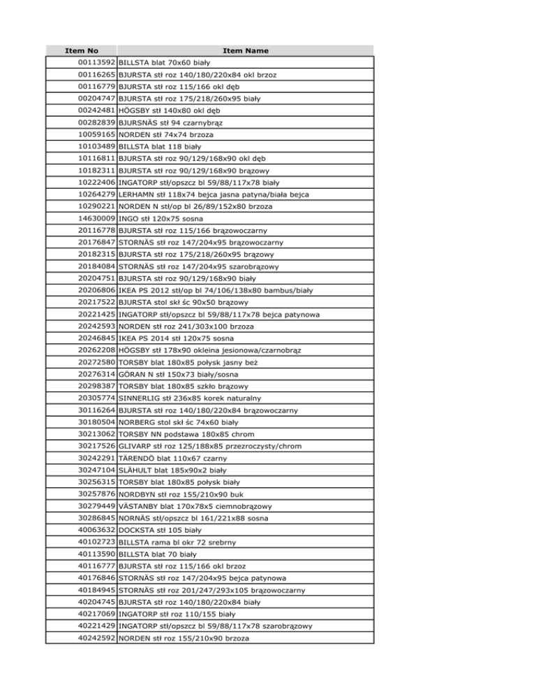 Item No Item Name 00113592 BILLSTA blat 70x60 biały 00116265 BJURSTA stł roz 140/180/220x84 okl brzoz 00116779 BJURSTA stł roz 115/166 okl dęb 00204747 BJURSTA stł roz 175/218/260x95 biały 00242481 HÖGSBY stł 140x80 okl dęb 00282839 BJURSNÄS stł 94 czarnybrąz 10059165 NORDEN stł 74x74 brzoza 10103489 BILLSTA blat 118 biały 10116811 BJURSTA stł roz 90/129/168x90 okl dęb 10182311 BJURSTA stł roz 90/129/168x90 brązowy 10222406 INGATORP stł/opszcz bl 59/88/117x78 biały 10264279 LERHAMN stł 118x74 bejca jasna patyna/biała bejca 10290221 NORDEN N stł/op bl 26/89/152x80 brzoza 14630009 INGO stł 120x75 sosna 20116778 BJURSTA stł roz 115/166 brązowoczarny 20176847 STORNÄS stł roz 147/204x95 brązowoczarny 20182315 BJURSTA stł roz 175/218/260x95 brązowy 20184084 STORNÄS stł roz 147/204x95 szarobrązowy 20204751 BJURSTA stł roz 90/129/168x90 biały 20206806 IKEA PS 2012 stł/op bl 74/106/138x80 bambus/biały 20217522 BJURSTA stol skł śc 90x50 brązowy 20221425 INGATORP stł/opszcz bl 59/88/117x78 bejca patynowa 20242593 NORDEN stł roz 241/303x100 brzoza 20246845 IKEA PS 2014 stł 120x75 sosna 20262208 HÖGSBY stł 178x90 okleina jesionowa/czarnobrąz 20272580 TORSBY blat 180x85 połysk jasny beż 20276314 GÖRAN N stł 150x73 biały/sosna 20298387 TORSBY blat 180x85 szkło brązowy 20305774 SINNERLIG stł 236x85 korek naturalny 30116264 BJURSTA stł roz 140/180/220x84 brązowoczarny 30180504 NORBERG stol skł śc 74x60 biały 30213062 TORSBY NN podstawa 180x85 chrom 30217526 GLIVARP stł roz 125/188x85 przezroczysty/chrom 30242291 TÄRENDÖ blat 110x67 czarny 30247104 SLÄHULT blat 185x90x2 biały 30256315 TORSBY blat 180x85 połysk biały 30257876 NORDBYN stł roz 155/210x90 buk 30279449 VÄSTANBY blat 170x78x5 ciemnobrązowy 30286845 NORNÄS stł/opszcz bl 161/221x88 sosna 40063632 DOCKSTA stł 105 biały 40102723 BILLSTA rama bl okr 72 srebrny 40113590 BILLSTA blat 70 biały 40116777 BJURSTA stł roz 115/166 okl brzoz 40176846 STORNÄS stł roz 147/204x95 bejca patynowa 40184945 STORNÄS stł roz 201/247/293x105 brązowoczarny 40204745 BJURSTA stł roz 140/180/220x84 biały 40217069 INGATORP stł roz 110/155 biały 40221429 INGATORP stł/opszcz bl 59/88/117x78 szarobrązowy 40242592 NORDEN stł roz 155/210x90 brzoza 40247207 DALSHULT podstawa brzoza 40264273 LERHAMN stł 74x74 czarnobrąz 40293770 MÖCKELBY stł/opszcz bl 79/114/150x79 dąb 50116263 BJURSTA N stł roz 175/218/260x95 okl dęb 50116809 BJURSTA stł roz 90/129/168x90 brązowoczarny 50116847 BJURSTA stł roz 50/70/90x90 okl dęb 50242313 TRANETORP stł roz 143/203x90 czarny 50247141 BACKARYD podstawa pomarańczowy 50260383 HÖGSBY stł 178x90 okleina bukowa 50272574 TORSBY blat 135x85 połysk jasny beż 50280098 MELLTORP N blat 75x75 biały 50280102 MELLTORP N podstawa 75x75 biały 50281408 RYDEBÄCK blat 150x78x3.7 pomarańczowy 60102722 BILLSTA pods prostok 72 srebrny 60152340 STORNÄS stł roz 201/247/293x105 bejca patynowa 60154645 TORSBY blat 180x85 szkło biały 60182304 BJURSTA stł roz 115/166 brązowy 60204749 BJURSTA stł roz 50/70/90x90 biały 60217520 BJURSNÄS stł 138x84 czarnobrąz 60225723 STOCKHOLM stł 170x85 orzech 60247027 GAMLEBY stł/op bl 67/134/201x78 bej jas patyna/sza 60256314 TORSBY blat 135x85 połysk biały 60259421 LERHAMN stł 118x74 czarnobrąz 60262211 HÖGSBY stł 140x80 okleina bukowa 60298385 TORSBY blat 135x85 szkło brązowy 70116262 BJURSTA N stł roz 175/218/260x95 brązowoczarny 70116846 BJURSTA stł roz 50/70/90x90 brązowoczarny 70182308 BJURSTA stł roz 50/70/90x90 brązowy 70204720 TORSBY blat 135x85 brązowoczarny 70213060 TORSBY NN podstawa 135x85 chrom 70221423 INGATORP stł roz 155/215x87 biały 70245042 TÄRENDÖ podstawa 110x67 czarny 70279447 VÄSTANÅ podstawa ciemnobrązowy 70290223 NORDEN N stł/op bl 26/89/152x80 biały 70294339 LISABO stł 140x78 okleina jesionowa 80089003 BJÖRKUDDEN stł 119x74 brzoza 80091713 NORBO stol skł śc 79x59 brzoza 80102721 BILLSTA pdst stolu 72 srebrny 80113588 BILLSTA blat 130x70 biały 80116266 BJURSTA stł roz 140/180/220x84 okl dęb 80217072 INGATORP stł roz 110/155 czarny 80217524 BJURSTA stol skł śc 90x50 brązowoczarny 80221427 INGATORP stł/opszcz bl 59/88/117x78 czarnobrąz 80242302 GLIVARP stł roz 75/115x70 przezroczysty/chrom 80264271 LERHAMN stł 74x74 bejca jasna patyna/biała bejca 80281416 RYDEBÄCK blat 150x78x3.7 biały 90116261 BJURSTA N stł roz 175/218/260x95 okl brzoz 90116807 BJURSTA stł roz 90/129/168x90 okl brzoz 90116845 BJURSTA stł roz 50/70/90x90 okl brzoz 90154644 TORSBY blat 135x85 szkło biały 90182307 BJURSTA stł roz 140/180/220x84 brązowy 90204743 BJURSTA stł roz 115/166 biały 90222407 INGATORP stł roz 155/215x87 czarny 90247139 BACKARYD podstawa biały 90280096 MELLTORP N blat 125x75 biały 90280100 MELLTORP N podstawa 125x75 biały 20102724 BILLSTA pdst stolu 103 srebrny 60109851 BILLSTA pods prostok 103 srebrny 70217652 STORNÄS Stół barowy 127x70 brązowoczarny 90087541 BJÖRKUDDEN Stół barowy 70x70 brzoza 00238196 ÄNGSÖ table, out 125 black-brown stained 20238195 ÄNGSÖ table, out 125 white stained 30290461 ÄNGSÖ table, out 138x79 black-brown stained 50290460 ÄNGSÖ table, out 138x79 white stained 40238199 ÄNGSÖ table, out 205x100 black-brown stained 00238200 ÄNGSÖ table, out 205x100 white stained 50288042 ÄPPLARÖ bar table, out brown stained 40208531 ÄPPLARÖ drop-leaf table, out 140/200/260x78 brown 20305694 ÄPPLARÖ drop-leaf table, out 140/200/260x78 white 80291731 ÄPPLARÖ gateleg tbl f wall 80x59 brown stained 50208535 ÄPPLARÖ gateleg tbl, out 20/77/133x62 brown 70205183 ÄPPLARÖ table, out 140x140 brown stained 70311503 ARRESÖ balc table 60x40 brown 50258667 ASKHOLMEN balc table 70x44 grey-brown stained 60240035 ASKHOLMEN table 60x62 foldable grey-brown stained 70240577 FALSTER table, out 160x100 black/brown 60202199 FALSTER table, out 160x100 grey 30240579 FALSTER table, out 63x63 black/brown 60209619 FALSTER table, out 63x63 grey 9