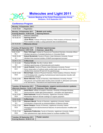 Molecules and Light 2011 Autumn Meeting of the Polish Photochemistry Group Zakopane, 19-23 September 2011 Conference Program Monday, 19 September, 2011: 14.00-19.00 Registration Monday, 19 September 2011 Evening Session: 19.00-23.00 19.00-19.15 19.15-20.15 Models and reality Opening Session Welcome addresses Opening lecture Jacek Waluk, Institute of Physical Chemistry, Polish Academy of Sciences, Warsaw From models to reality: a (very) personal view of photoscience 20.15-23.00 Welcome dinner Tuesday, 20 September 2011 Ultrafast spectroscopy Morning Session: 9.00-13.00 Chairman: Jakob Wirz Peter Vöhringer, Institute for Physical and Theoretical Chemistry, University of Bonn 9.00-10.00 PL1 Ultrafast dynamics of solvated electrons in H-bonded fluids Gotard Burdziński, Faculty of Physics, Adam Mickiewicz University, Poznań 10.00-10.45 IL1 Ultrafast time-resolved studies of Wolff rearrangement process 10.45-11.15 Coffee break 11.15-12.00 IL2 Thomas Schultz, Max Born Institute, Berlin 12.00-12.20 OC1 12.20-12.40 OC2 12.40-13.00 OC3 Ultrafast spectroscopy of biomolecules and clusters Jacek Kubicki, Faculty of Physics, Adam Mickiewicz University, Poznań Direct observation of sulfonyl azide excited state and its decay processes by ultrafast time-resolved IR and UV-Vis spectroscopy Michał Kijak, Institute of Physical Chemistry, Polish Academy of Science, Warsaw 2-(2-Pyridyl)pyrrole: coupling of photoinduced electron/proton transfer with conformational changes Marek Sikorski, Faculty of Chemistry, Adam Mickiewicz University, Poznań The ground- and excited-state double proton transfer in alloxazine and some of its derivatives: Theoretical and experimental approach Tuesday, 20 September 2011 Photocatalysis, organic-semiconductor systems Afternoon Session: 14.30-17.45 Chairman: Peter Vöhringer Horst Kisch, Institute of Inorganic Chemistry, University of Erlangen-Nürnberg 14.30-15.30 PL2 Semiconductor visible light photocatalysis – principles and applications Rafał Sadowski, Faculty of Chemistry, Jagiellonian University, Kraków 15.30-15.50 OC4 Photoactive titanium dioxide coatings on organic polymers 15.50-16.20 Coffee break 16.20-17.05 IL3 17.05-17.25 OC5 17.25-17.45 OC6 Wojciech Macyk, Faculty of Chemistry, Jagiellonian University, Kraków Coordination compounds as photosensitizers of titanium dioxide Marek Oszajca, Faculty of Chemistry, Jagiellonian University, Kraków Photophysical and electrochemical features of semiconductors modified with polynitriles Agnieszka Podborska, Faculty of Chemistry, Jagiellonian University, Kraków New optoelectronic logic devices based on surface-modified TiO2 Tuesday, 20 September 2011 Evening Session: 20.00-21.30 Poster session 1 Wednesday, 21 September 2011 Photochemistry, synthesis, new materials Morning Session: 9.00-13.00 Chairman: Jacek Waluk Jakob Wirz, Department of Chemistry, University of Basel 9.00-10.00 PL3 Photoremovable protecting groups: How fast are they really? 10.00-10.45 IL4 Daniel Gryko, Institute of Organic Chemistry, Polish Academy of Sciences, Warsaw Novel π-expanded porphyrins – synthesis and photophysics 10.45-11.15 Coffee break 11.15-12.00 IL5 Sebastian Maćkowski, Institute of Physics, Nicolaus Copernicus University, Toruń 12.00-12.20 OC7 12.20-12.40 OC8 12.40-13.00 OC9 Photomodification of corrole molecules Mariusz Tasior, Institute of Organic Chemistry, Polish Academy of Sciences, Warsaw The synthesis and optical properties of novel coumarins Miłosz Pawlicki, Department of Chemistry, University of Wrocław Radiationless deactivation of subpyriporphyrins Maciej Nowak, Institute of Physics, Polish Academy of Sciences, Warsaw Photon-induced and spontaneous transformations of the structure of cytosine molecule Wednesday, 21 September 2011, 14.00 – 18.00: Excursion Wednesday, 21 September 2011 Evening, 19.30 – 23.00 Conference Dinner Thursday, 22 September 2011 Electron, proton, energy transfer Morning Session: 9.00-13.15 Chairman: Andrzej Sobolewski Eric Vauthey, Department of Physical Chemistry, University of Geneva 9.00-10.00 PL4 Excitation energy hopping and photoinduced charge transfer processes in multichromophoric systems Gonzalo Angulo, Institute of Physical Chemistry, Polish Academy of Sciences, Warsaw 10.00-10.45 IL6 Electron transfer and diffusion 10.45-11.15 Coffee break 11.15-12.15 PL5 Klaas Zachariasse, Max-Planck-Institute for Biophysical Chemistry, Göttingen 12.15-12.35 OC10 12.35-12.55 OC11 12.55-13.15 OC12 Intramolecular charge transfer in the excited state. Dynamics and structure Ewelina Karolak-Solarska, Institute of Physical Chemistry, Polish Academy of Sciences, Warsaw Electron transfer and photodissociation in a spirocyclic bichromophoric molecule Anna Szemik-Hojniak, Department of Chemistry, University of Wrocław Excited state deactivation processes in 3-aminoflavone Jędrzej Solarski, Institute of Physical Chemistry, Polish Academy of Sciences, Warsaw Investigation of the bi-molecular energy transfer processes in liquid solutions Thursday, 22 September 2011 Afternoon Session: 15.00-18.30 Panel Discussion Photoinduced charge transfer and conformational changes Chairman: Jerzy Karpiuk 15.00-16.30 PD Part 1: Address sent by Zbigniew R. Grabowski Contributions: Jacek Waluk and Klaas Zachariasse 16.30-17.00 Coffee break 17.00-18.30 PD Part 2: Open discussion: short spontaneous contributions are welcome 2 Friday, 23 September 2011 Theory and computations Morning Session: 9.00-12.30 Chairman: Eric Vauthey Andrzej Sobolewski, Institute of Physics, Polish Academy of Sciences, Warsaw 9.00-10.00 PL6 Photophysics of hydrogen bonded systems: from theory to applications 10.00-10.45 IL7 Piotr Skurski, Department of Chemistry, University of Gdańsk Unusual oxidizing agents 10.45-11.15 Coffee break 11.15-11.35 OC13 Przemysław Kolek, Institute of Physics, Rzeszów University 11.35-11.55 OC14 11.55-12.15 OC15 12.15-12.30 Supersonic jet spectra and ab initio modelling of S0→S1 transition of anthranilic acid mole