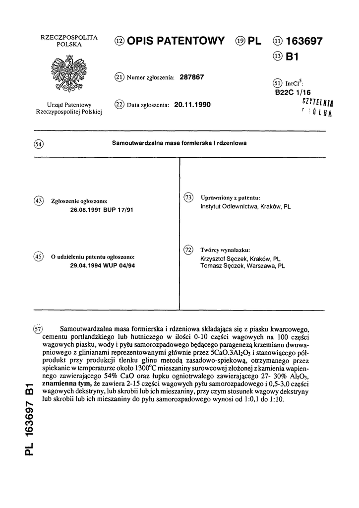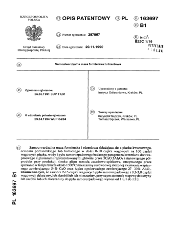 Samoutwardzalna masa formierska i rdzeniowa - Patenty