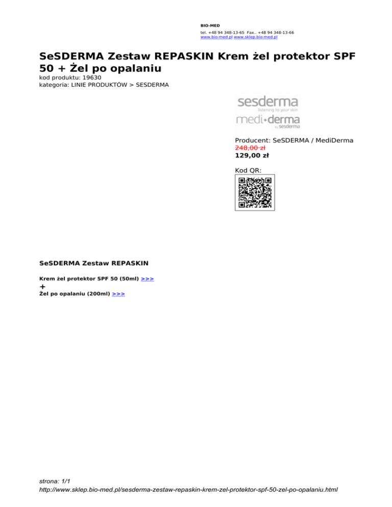BIO-MED tel. +48 94 348-13-65 Fax.. +48 94 348-13-66 www.bio-med.pl www.sklep.bio-med.pl SeSDERMA Zestaw REPASKIN Krem żel protektor SPF 50 + Żel po opalaniu kod produktu: 19630 kategoria: LINIE PRODUKTÓW > SESDERMA Producent: SeSDERMA / MediDerma 248,00 zł 129,00 zł Kod QR: SeSDERMA Zestaw REPASKIN Krem żel protektor SPF 50 (50ml) >>> + Żel po opalaniu (200ml) >>> strona: 1/1 http://www.sklep.bio-med.pl/sesderma-zestaw-repaskin-krem-zel-protektor-spf-50-zel-po-opalaniu.html