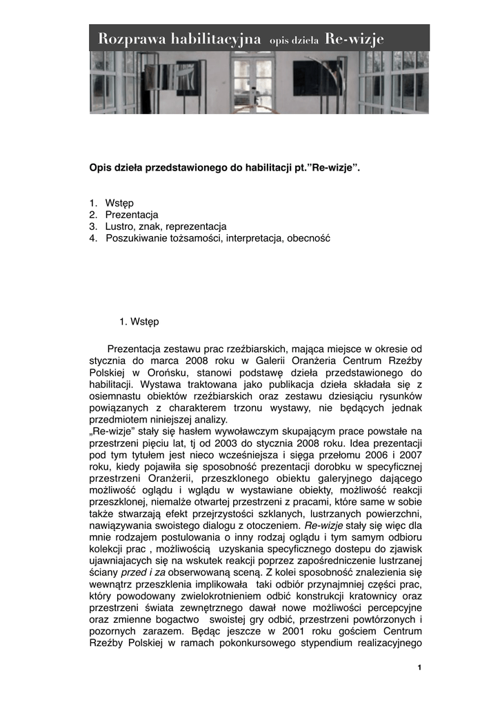 Rozprawa habilitacyjna opis dzieła Re-wizje Opis dzieła przedstawionego do habilitacji pt.”Re-wizje”. 1. 2. 3. 4. % Wstęp Prezentacja Lustro, znak, reprezentacja Poszukiwanie tożsamości, interpretacja, obecność 1. Wstęp Prezentacja zestawu prac rzeźbiarskich, mająca miejsce w okresie od stycznia do marca 2008 roku w Galerii Oranżeria Centrum Rzeźby Polskiej w Orońsku, stanowi podstawę dzieła przedstawionego do habilitacji. Wystawa traktowana jako publikacja dzieła składała się z osiemnastu obiektów rzeźbiarskich oraz zestawu dziesiąciu rysunków powiązanych z charakterem trzonu wystawy, nie będących jednak przedmiotem niniejszej analizy. „Re-wizje” stały się hasłem wywoławczym skupającym prace powstałe na przestrzeni pięciu lat, tj od 2003 do stycznia 2008 roku. Idea prezentacji pod tym tytułem jest nieco wcześniejsza i sięga przełomu 2006 i 2007 roku, kiedy pojawiła się sposobność prezentacji dorobku w specyficznej przestrzeni Oranżerii, przeszklonego obiektu galeryjnego dającego możliwość oglądu i wglądu w wystawiane obiekty, możliwość reakcji przeszklonej, niemalże otwartej przestrzeni z pracami, które same w sobie także stwarzają efekt przejrzystości szklanych, lustrzanych powierzchni, nawiązywania swoistego dialogu z otoczeniem. Re-wizje stały się więc dla mnie rodzajem postulowania o inny rodzaj oglądu i tym samym odbioru kolekcji prac , możliwością uzyskania specyficznego dostepu do zjawisk ujawniajacych się na wskutek reakcji poprzez zapośredniczenie lustrzanej ściany przed i za obserwowaną sceną. Z kolei sposobność znalezienia się wewnątrz przeszklenia implikowała taki odbiór przynajmniej części prac, który powodowany zwielokrotnieniem odbić konstrukcji kratownicy oraz przestrzeni świata zewnętrznego dawał nowe możliwości percepcyjne oraz zmienne bogactwo swoistej gry odbić, przestrzeni powtórzonych i pozornych zarazem. Będąc jeszcze w 2001 roku gościem Centrum Rzeźby Polskiej w ramach pokonkursowego stypendium realizacyjnego 1 Rozprawa habilitacyjna opis dzieła Re-wizje miałem sposobność zaznajomienia się warunkami oraz specyfiką i atrakcyjnościa tej przestrzeni wystawiennniczej. Przez pewien czas dojrzewała we mnie idea próby wykorzystania tego miejsca i walorów, jakie daje taka ekspozycja a zarazem rodzaj gry z obiektem zamkniętym i otwartym zarazem. Współistnienie rzeźby z otoczeniem ograniczonym ścianami i sufitem ale otwartym na zmieniajace się warunki światła, przejrzystości szkła, realne wchodzenie otoczenie (czytaj: natury parku) do wewnątrz wydało mi się interesującym aspektem determinującym starania o realizację tej prezentacji. Idea ta ujawniła się mocniej w chwili, kiedy uprzytomniłem sobie, że ewolucja moich poszukiwań rzeźbiarskich anektujących coraz mocniej materię lustra, szkła i powietrza może w tej przestrzeni nabrać nowego, być może intensywniejszego wymiaru. Może więc stać się sposobnością zrewidowania mojego poglądu ( i poglądu odbiorcy przede wszystkim) na trafność , celowość czy zasadność takich poszukiwań. Owa re-wizja to więc jakby kilkuwarstwowe po-oglądanie, do-oglądywanie, re-widowanie poglądów własnych, rodzaj checkpointu, który moim zdaniem, warto sobie co pewien czas zadać. Może jeszcze to jeszcze nie re-definiowanie – ten etap potrzebuje wszakże nade wszystko czasu na chłodną refleksję , czasu dojrzałych wniosków. % 2. Prezentacja Wystawiony zestaw prac skomponowany został z osiemnastu obiektów rzeźbiarskich oraz wspomnianych dziesięciu rysunków i kolaży. Podstawę prezentacji przedłożonej do habilitacji stanowi szesnaście obiektów powstałych po uzyskaniu kwalifikacji I-go stopnia w maju 2002 roku, zatytułowanych kolejno: ŁUK ( 2003), STUDNIA (2003), BEZIMIENNY (2006), ZACHOWANY (2006), WEJRZENIE (2006/07), WSPARCIE (2007), RE-WIZJE (2007), POZORY I, POZORY II, POZORY III (tryptyk - 2007), RELATYWY (2006/07), FURTA /POMIĘDZY (2007), 15 X 15 (2007), SPECULUM (2007/08), 6 SPOJRZEŃ (2007/08) i WZNOSZENIE (2008). Pokazane na wystawie dwie prace IKONA-IDOL oraz BARIERA powstałe w 2002 roku stanowiły swoisty łącznik, przeniesienie idei dokonań powstałych do roku 2002, zrealizowanych w związku z przewodem kwalifikacyjnym I-go stopnia , jednocześnie wyraz pewnej ewolucji w sposobie nie tylko traktowania formy ale również specyficznego traktowania koncepcji rzeźby - komunikatu, obiektu semantycznie naznaczonego. Wydało mi się celowym w tak zaplanowanej prezentacji ukazać rodzaj ideowego continuum w myśleniu o rzeźbie , którego początki są umiejscowione na wysokości pracy dyplomowej z 1994 roku pt. TWARZ-OBLICZE-MASKA. Wspomniane wyżej dwie rzeźby były fragmentem zestawu przewodowego z 2002 roku noszącym wspólny tytuł ZNAK-IDEOGRAM, gdzie osiem prac w trzech cyklach próbowało się 2 Rozprawa habilitacyjna opis dzieła Re-wizje zmierzyć z subiektywnym rozumieniem pojęcia znaczenia, znaku, symbolu czy metafory; odnieść się do zjawisk eksplorujących zasoby ikonicznej spuścizny kultury. Obiekt IKONA – IDOL powstały w wyniku pewnych dociekań nad istotą znaku i symbolu, wartości ikonicznej przedstawienia i jego cech jako komunikatu, stał się w kolejnych fazach przyczynkiem do rozważań nad istotą mitu, gry symbolem i metaforą zarazem. To poszukiwanie zaowocowało m.in. pracami ŁUK i STUDNIA (cykl Mity), otwierającymi niejako orońską prezentację. Ten tok myślenia o semantyce formy kontynuuje BEZIMIENNY, gdzie układ pionowego, stalowego konstrukcyjnego kształtownika 2T o wyraźnie technicznej prowieniencji kontrastuje przeciwstawiając się poziomej, krótszej drewnianej belce o strukturze noszącej znamiona czasu i użycia z wyraźnie zasygnalizowaną interwencją stalowego okucia. Bezimienność to odniesienie się do owej uniesionej wysoko ponad głowy drewnianej re-konstrukcji faktu, zamkniętej historii pewnej rzeczywistości 