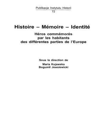 Publikacje Instytutu Historii 72 Histoire - Memoire - Identite Heros commemores par les habitants des differentes parties de 1'Europe Sous la direction de Maria Kujawska Bogumił Jewsiewicki Historia - Pamięć - Tożsamość Postaci upamiętniane przez współczesnych mieszkańców różnych części Europy Redakcja naukowa Maria Kujawska Bogumił Jewsiewicki Poznań 2006 TABLE DES MATIERES Preface (MARIA KUJAWSKA) Allocution d'ouverture de M. Bohdan Walczak, Recteur de l'Universite de Poznań . . . . Allocution d'onverture de Mme Danuta Minta-Tworzowska, Doyenne de la Faculte d'Histoire de l'UAM 5 9 11 PREMIERE PARTIE La communaute des experiences historiques et son influence sur la formation de la conscience culturelle des societes europeennes d'aujourd'hui Regimes d'historicite II serait preferable ne pas resewer a bistoriograpbie la reflexion sur l'attitude de l'opinion publiąue a l'egard des heros nationaux WOJCIECH WRZOSEK, L'imputation epistemologiąue comme element de la reflexion historique HALINA TOMALSKA, La signification et les dimensions du dialogue interculturel dans l'espace europeen contemporain MACIEJ BUGAJEWSKI, L'historiographie et l'avenir. Plan du contexte de la ąuestion de recherche JERZY GĄSOWSKI, Le heros comme objet de la perception sociale HANNA WÓJCIK-ŁAGAN, Differents aspects du patriotisme TADEUSZ SROGOSZ, BEATA URBANOWICZ, Napoleon - le mythe du sauueur et les attitudes de la societe polonaise dans les annees 1806-1807 HANNA KONOPKA, ADRIAN KONOPKA, Ludwik Zamenhof, habitant de la region de Białystok - precurseur de l'idee europeenne VIOLETTA JULKOWSKA, Heros historiąues et « heros domestiąues » dans les memoires des Polonaises du XIXe et XXe siecle MIRCEA STANCIU, Decembre 1989 : reuolution ou coup d'Etat ? Une vision d'en bas et de l'interieur de 1'action CRISTIAN PREDA, Memoires du communisme et imaginaire politiąue en Roumanie post-1989 SARAH GENSBURGER, De Jerusalem a Paris, les justes parmi les Nations entre figurę collective et cas singuliers AGNIESZKA NIEWIEDZIAŁ-BF.DU, Les Justes Parmi les Nations en Pologne, 1989-2003. Les enjeux de la construction d'un lieu de memoire IZABELA SKÓRZYŃSKA, Le Theatre - heros des Confins d l'epoque de la transformation . . JUSTYNA BUDZIŃSKA, Galeries des heros polonais crees a l'epoque de la transformation . . FRANęois HARTOG, 17 BOGUMIŁ JEWSIEWICKI, 29 35 41 53 63 71 83 97 105 117 123 131 139 149 163 Table des matieres 445 DEUXIEME PARTIE Les heros europeens, nationaux, locaux - temoignage de la memoire des societes europeennes d'aujourd'hui Cadres de la memoire communiste et memoires du communisme. Les autobiographies : recits exemplaires ou esąuisses d'auto-analyse ? JERZY CENTKOWSKI, Ces heros ąui ne sont pas seulement polonais GRZEGORZ CHOMICKI, Saint Adalbert - heros pour notre epoąue ? MACIEJ MICHALSKI, A la recherche des autorites : le culte contemporain des saints du Moyen-Age. Cas de Saint Adalbert et de Sainte Kunegonde MAŁGORZATA MOKOSA, Merlin et Arthur dans « Descriptio Cambriae » et « Itineratirum Cambriae » de Geraud de Galles JAROSŁAW VACULIK, JIRI MIHOLA, Reformatem de l'Eglise et intermediaire entre les confessions. Changements de l'image de Jean Hus et de sa reception au debut du troisidme millenaire MACIEJ FORYCKI, Stanislas Leszczyński - un Europeen dans la memoire des Polonais et des Franęais, des Poznaniens et des Lorrains ANNA GABRYŚ, Sur la persistance de la memoire. Heros polonais dans la memoire « franęaise » de la premiere moitie du XfXe siecle et d'aujourd'hui HENRYKA FIGAJ-NOWAK, Conception du heros national dans les syntheses historiąues d'entre les deux guerres PIOTR OKULEWICZ, Józef Piłsudski. Entre apologie et refoulement ZBIGNIEW OSIŃSKI, Janusz Jędrzejewicz et la fondation du mythe de l'heros national polonais - Józef Piłsudski HALINA WRÓŻYŃSKA, ANNA KASZCZYK, Cinq heros - les gamins de la rue Wroniecka. . . . GRZEGORZ BĘBNIK, Heros de la defense de Katowice en 1939 dans l'histoire et la memoire des habitants de la Haute Silesie ERYK KRASUCKI, Creer un nouveau type de heros. La figurę de Karol Swierczewski dans la realisation du film « Soldat de la Victorie » de Wanda Jakubowska KATARZYNA JARKIEWICZ, Stanisław Wider - activiste, ideologue de la conception polonaise de la pretrise dans les milieux ouvrieres KLAUDIUSZ ŚWIĘCICKI, Heros du Thedtre de la Mort de Tadeusz Kantor MARIE-CLAIRE LAVABRE, 177 187 191 199 205 215 225 231 241 249 263 2 8 1 289 301 313 323 TROISIEME PARTIE Heros de l'epoque de la transformation sociale dans la conscience des adolescents et de leurs parents. Leęons de memoire et de 1'education historique en Europę Centrale et Orientale Les heros des jeunes Polonais d'aujourd'hui et de leurs parents. Affirmation du bien. Un toumant ethiąue ? DANUTA KONIECZKA-SLIWIŃSKA, Actwiste ou bon menager et mecene de la culture ? Heros de la Grande-Pologne dans les manuels scolaires a l'epoque de la transformation. . . . ALOJZY ZIELECKI, Figures des heros nationaux dans les manuels d'histoire de l'ecole reformee LUCYNA KUDŁA, Heros europeens dans l'education historique scolaire MARIOLA HOSZOWSKA, Entre le passe et le present. Les heroines de l'histoire de la Pologne dans les manuels du XXIe siecle MONIKA WOJDON, Heros de l'education historique de la Ile Republique de Pologne. . . . CZESŁAW NOWARSKI, Sur les traces des heros paysans. Analyse des manuels d'histoire (1945-1980) MARIA KUJAWSKA, 333 3 4 5 355 371 377 391 405 446 Table des matieres Les heros du XXE siecles dans les manuels scolaires polonais et theąues d'aujourd'hui BARBARA JAKUBOWSKA, Les relations de collaboration entre le passe et l'epoque contemporaine KRYSTYNA WRÓBEL-LIPOWA, MARIUSZ AUSZ, Les heros de l'epoque de transformation socio-politique en Europę Centrale et Orientale dans l'opinion des etudiants HENRYK PALKIJ, Les heros de l'histoire scolaire - entre la memoire et les changements dans les systemes d'education en Europę GRAŻYNA PAŃKO, 415 42