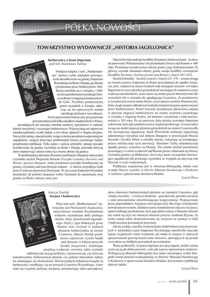 TOWARZYSTWO WYDAWNICZE „HISTORIA IAGELLONICA” Barbarzyńcy u bram Imperium pod red. Stanisława Turleja Niniejsza książka z serii „Mediterraneum” zawiera wybór artykułów poświęconych ukształtowaniu się granicy Imperium Rzymskiego na Renie i Dunaju, jej obronie i przełamaniu przez barbarzyńców. Publikacja narodziła się w związku z 1600. rocznicą przełamania rzymskiego limesu na Renie i wtargnięcia barbarzyńców do Galii. Przybliża problematykę granic rzymskich w Europie, odnosząc się do najnowszych ustaleń i przebiegu dyskusji w tym zakresie. Jest to opracowanie historyczne, przygotowane przez przedstawicieli kilku ośrodków akademickich w Polsce, posiadających już znaczący dorobek naukowy specjalistów w zakresie historii starożytnej i wczesnego średniowiecza. Wykorzystują oni najnowsze interdyscyplinarne wyniki badań, a swe teksty opatrzyli w bogate przypisy. Niezwykle istotny, chociaż krótki, wstęp w skrócie przedstawia najważniejsze zagadnienia i pojęcia dotyczące problematyki limesu rzymskiego będące przedmiotem publikacji. Tylko jeden z sześciu artykułów opisuje początki kształtowania się granicy rzymskiej na Renie i Dunaju, pozostałe dotyczą okres stopniowego załamywania się systemu obrony tej granicy. W problematykę obecności Rzymian nad Renem i Dunajem wprowadza czytelnika artykuł Wojciecha Borucha Początki rzymskiej obecności nad Renem i górnym Dunajem. Autor przedstawia początki kształtowania się granicy rzymskiej nad tymi dwiema rzekami – w okresie od podboju Galii przez Cezara po panowanie Domicjana. W tym czasie Imperium Rzymskie przechodzi od polityki ekspansji wobec Germanii do umacniania swej granicy na Renie i obrony status quo. Marcin Pawlak Aecjusz i barbarzyńcy Piąty tom serii „Mediterraneum” poświęcony jest Flawiuszowi Aecjuszowi, nazywanemu ostatnim Rzymianinem wodzowi rzymskiemu doby późnego antyku, który powstrzymał legendarnego Attylę i jego budzących grozę Hunów oraz trzymał w karbach plemiona barbarzyńskie na terenie Cesarstwa. Marcin Pawlak przedstawia najnowsze wyniki badań nad okresem, w którym przyszło działać Aecjuszowi. Analizując przebieg wydarzeń, rozważa, jakie czynniki oddziaływały na jego politykę, i zastanawia się, czy była ona konsekwentnie realizowanym planem, czy jedynie łańcuchem reakcji na zmieniające się okoliczności. Równorzędnym bohaterem książki są barbarzyńcy osiedlający się na terenach Cesarstwa Rzymskiego. Autor stara się wyjaśnić politykę Aecjusza, przestawiając także początkowy Marcin Pawlak analizuje konflikty Rzymian z barbarzyńcami – to okres od panowania Walentyniania I do przełamania limesu nad Renem w 406 roku. Prezentuje rzymski system obrony granic i jego funkcjonowanie. Za główny czynnik załamania obrony granic uznaje konflikty wewnętrzne (Konflikty Rzymian z barbarzyńcami nad Renem w latach 365–425). Dawid Zołoteńki – Zachód rzymski w latach 425–476 – zwraca uwagę na trwanie granicy Imperium na Renie przynajmniej do upadku Aecjusza, przy stopniowej utracie kontroli nad szeregiem terenów wewnątrz Imperium na rzecz plemion germańskich uzyskujących stopniowo coraz większą samodzielność, aż po stanie się atrakcyjnymi alternatywami dla rzymskich elit w stosunku do upadającego Cesarstwa. Za przełomowe w tym procesie uważa utratę Afryki, a tym samym zasobów finansowych, które mogły pomóc odbudować kontrolę nad prowincjami opanowanymi przez barbarzyńców. Paweł Izworski przedstawia jakościową zmianę w procesie migracji barbarzyńców na ziemie cesarstwa rzymskiego w związku z migracją Gotów, ich buntem i zawarciem z nimi porozumienia w 383 roku. Po raz pierwszy duże plemię wewnątrz Imperium traktowane było jako podmiot prawa międzynarodowego. Zwraca także uwagę na skutki migracji plemion germańskich na ziemie Cesarstwa dla ich wewnętrznej organizacji. Jacek Wiewiórski analizuje organizację administracji rzymskiej nad dolnym Dunajem w prowincjach Moesia Secunda i Scythia Minor u schyłku antyku, wskazując na postępujący proces militaryzacji tych prowincji. Stanisław Turlej charakteryzuje upadek granicy cesarstwa na Dunaju. Ten ostatni artykuł przedstawia pozostający w cieniu wydarzeń nad Renem proces załamania się obrony rzymskiej granicy na Bałkanach. Jest to być może szczególnie interesujące zagadnienie dla polskiego czytelnika ze względu na aktywną rolę Słowian w tych wydarzeniach. Publikacja zaopatrzona jest w obszerną bibliografię, indeks oraz w aneks Monety rzymskie ze zbiorów Muzeum Narodowego w Krakowie w wyborze i opracowaniu Jarosława Bodzka. Leszek Śliwa okres obecności barbarzyńskich plemion na ziemiach Cesarstwa, gdy władze rzymskie – z różnym skutkiem – poszukiwały sposobu zawarcia z nimi porozumienia umożliwiającego koegzystencję. Wypracowane przez poprzedników Aecjusza rozwiązania były dla niego wielokrotnie powtarzanym wzorem. Zdaniem autora fundamentem sukcesu Aecjusza, oprócz dobrego pochodzenia, były jego dobre relacje z Hunami, których nie wahał się użyć we własnym interesie przeciw władcom Rzymu. Za trafne uznaje także skoncentrowanie się Aecjusza na sytuacji w Galii i Italii kosztem pozostałych prowincji. Jak się wydaje, szerokie wykorzystanie źródeł historycznych powstałych w zachodniej części Imperium Rzymskiego umożliwiło znacznie lepsze wyjaśnienie wielu wydarzeń, niż miało to miejsce w starszych opracowaniach poświęconych temu okresowi, opierających się przede wszystkim na źródłach powstałych na wschodzie. Warto podkreślić, że praca napisana jest przystępnie, dzięki czemu czyta się ją jak dobrą powieść, a nie jak typowe opracowanie naukowe. Wzbogaca ją obszerna bibliografia oraz aneks zawierający wybór fotografii monet dynastii teodozjańskiej ze zbiorów Muzeum Narodowego w Krakowie w opracowaniu Jarosława Bodzka. Korzystanie z publikacji ułat
