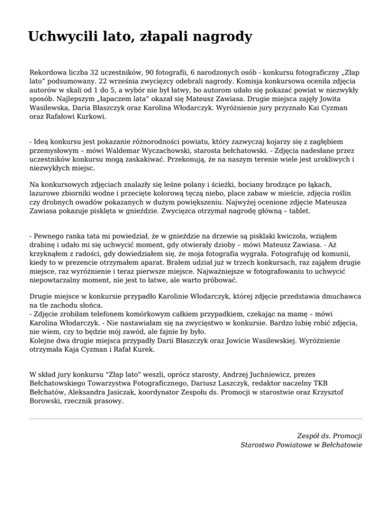 Uchwycili lato, złapali nagrody Rekordowa liczba 32 uczestników, 90 fotografii, 6 narodzonych osób - konkursu fotograficzny „Złap lato” podsumowany. 22 września zwycięzcy odebrali nagrody. Komisja konkursowa oceniła zdjęcia autorów w skali od 1 do 5, a wybór nie był łatwy, bo autorom udało się pokazać powiat w niezwykły sposób. Najlepszym „łapaczem lata” okazał się Mateusz Zawiasa. Drugie miejsca zajęły Jowita Wasilewska, Daria Błaszczyk oraz Karolina Włodarczyk. Wyróżnienie jury przyznało Kai Cyzman oraz Rafałowi Kurkowi. - Ideą konkursu jest pokazanie różnorodności powiatu, który zazwyczaj kojarzy się z zagłębiem przemysłowym – mówi Waldemar Wyczachowski, starosta bełchatowski. - Zdjęcia nadesłane przez uczestników konkursu mogą zaskakiwać. Przekonują, że na naszym terenie wiele jest urokliwych i niezwykłych miejsc. Na konkursowych zdjęciach znalazły się leśne polany i ścieżki, bociany brodzące po łąkach, lazurowe zbiorniki wodne i przecięte kolorową tęczą niebo, place zabaw w mieście, zdjęcia roślin czy drobnych owadów pokazanych w dużym powiększeniu. Najwyżej ocenione zdjęcie Mateusza Zawiasa pokazuje pisklęta w gnieździe. Zwycięzca otrzymał nagrodę główną – tablet. - Pewnego ranka tata mi powiedział, że w gnieździe na drzewie są pisklaki kwiczoła, wziąłem drabinę i udało mi się uchwycić moment, gdy otwierały dzioby – mówi Mateusz Zawiasa. - Aż krzyknąłem z radości, gdy dowiedziałem się, że moja fotografia wygrała. Fotografuję od komunii, kiedy to w prezencie otrzymałem aparat. Brałem udział już w trzech konkursach, raz zająłem drugie miejsce, raz wyróżnienie i teraz pierwsze miejsce. Najważniejsze w fotografowaniu to uchwycić niepowtarzalny moment, nie jest to łatwe, ale warto próbować. Drugie miejsce w konkursie przypadło Karolinie Włodarczyk, której zdjęcie przedstawia dmuchawca na tle zachodu słońca. - Zdjęcie zrobiłam telefonem komórkowym całkiem przypadkiem, czekając na mamę – mówi Karolina Włodarczyk. - Nie nastawiałam się na zwycięstwo w konkursie. Bardzo lubię robić zdjęcia, nie wiem, czy to będzie mój zawód, ale fajnie by było. Kolejne dwa drugie miejsca przypadły Darii Błaszczyk oraz Jowicie Wasilewskiej. Wyróżnienie otrzymała Kaja Cyzman i Rafał Kurek. W skład jury konkursu "Złap lato" weszli, oprócz starosty, Andrzej Juchniewicz, prezes Bełchatowskiego Towarzystwa Fotograficznego, Dariusz Laszczyk, redaktor naczelny TKB Bełchatów, Aleksandra Jasiczak, koordynator Zespołu ds. Promocji w starostwie oraz Krzysztof Borowski, rzecznik prasowy. Zespół ds. Promocji Starostwo Powiatowe w Bełchatowie