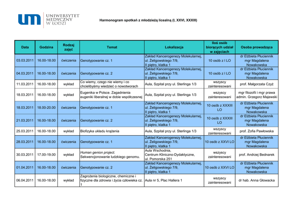 Harmonogram spotkań z młodzieżą licealną (I, XXVI, XXXIII) Iloś osób biorących udział w zajęciach Data Godzina Rodzaj zajęć 03.03.2011 16.00-18.00 ćwiczenia Genotypowanie cz. 1 04.03.2011 16.00-18.00 ćwiczenia Genotypowanie cz. 2 11.03.2011 16.00-18.00 wykład Co wiemy, czego nie wiemy i co chcielibyśmy wiedzieć o nowotworach Aula, Szpital przy ul. Sterlinga 1/3 wszyscy zainteresowani prof. Małgorzata Czyż 18.03.2011 16.00-18.00 wykład Eugenika w Polsce. Zagadnienia Aula, Szpital przy ul. Sterlinga 1/3 eugeniki liberalnej w dobie współczesnej wszyscy zainteresowani mgr filozofii i mgr prawa admin. Grzegorz Majewski 18.03.2011 18.00-20.00 ćwiczenia Genotypowanie cz. 1 21.03.2011 16.00-18.00 ćwiczenia Genotypowanie cz. 2 25.03.2011 16.00-18.00 wykład 28.03.2011 16.00-18.00 ćwiczenia 30.03.2011 17.00-19.00 wykład 01.04.2011 16.00-18.00 ćwiczenia 06.04.2011 16.00-18.00 wykład Temat Biofizyka układu krążenia Genotypowanie cz. 1 Human genion project. Sekwencjonowanie ludzkiego genomu. Genotypowanie cz. 2 Lokalizacja Zakład Kancerogenezy Molekularnej, ul. Żeligowskiego 7/9, II piętro, klatka 1 Zakład Kancerogenezy Molekularnej, ul. Żeligowskiego 7/9, II piętro, klatka 1 Zakład Kancerogenezy Molekularnej, ul. Żeligowskiego 7/9, II piętro, klatka 1 Zakład Kancerogenezy Molekularnej, ul. Żeligowskiego 7/9, II piętro, klatka 1 Aula, Szpital przy ul. Sterlinga 1/3 10 osób z I LO 10 osób z I LO 10 osób z XXXIII LO 10 osób z XXXIII LO wszyscy zainteresowani Zakład Kancerogenezy Molekularnej, 10 osób z XXVI LO ul. Żeligowskiego 7/9, II piętro, klatka 1 Aula Wschodnia, wszyscy Centrum Kliniczno-Dydaktyczne, zainteresowani ul. Pomorska 251 Zakład Kancerogenezy Molekularnej, 10 osób z XXVI LO ul. Żeligowskiego 7/9, II piętro, klatka 1 Zagrożenia biologiczne, chemiczne i fizyczne dla zdrowia i życia człowieka cz. Aula nr 5, Plac Hallera 1 1 wszyscy zainteresowani Osoba prowadząca dr Elżbieta Płuciennik mgr Magdalena Nowakowska dr Elżbieta Płuciennik mgr Magdalena Nowakowska dr Elżbieta Płuciennik mgr Magdalena Nowakowska dr Elżbieta Płuciennik mgr Magdalena Nowakowska prof. Zofia Pawłowska dr Elżbieta Płuciennik mgr Magdalena Nowakowska prof. Andrzej Bednarek dr Elżbieta Płuciennik mgr Magdalena Nowakowska dr hab. Anna Głowacka 13.04.2011 16.00-18.00 wykład 20.04.2011 16.00-18.00 wykład 27.04.2011 16.00-18.00 wykład 04.05.2011 16.00-18.00 wykład 09.05.2011 16.00-18.00 11.05.2011 Zagrożenia biologiczne, chemiczne i fizyczne dla zdrowia i życia człowieka cz. Aula nr 5, Plac Hallera 1 2 Zagrożenia biologiczne, chemiczne i fizyczne dla zdrowia i życia człowieka cz. Aula nr 5, Plac Hallera 1 3 Zagrożenia biologiczne, chemiczne i fizyczne dla zdrowia i życia człowieka cz. Aula nr 5, Plac Hallera 1 4 Witamina C odkryta na nowo Aula nr 5, Plac Hallera 1 ćwiczenia Świadomość ekologiczna 16.00-18.00 ćwiczenia Świadomość ekologiczna 16.05.2011 16.00-18.00 ćwiczenia Świadomość ekologiczna 18.05.2011 16.00-18.00 ćwiczenia Zanieczyszczenia żywności cz. 1 23.05.2011 16.00-18.00 ćwiczenia Zanieczyszczenia żywności cz. 2 25.05.2011 16.00-18.00 ćwiczenia Zanieczyszczenia żywności cz. 1 30.05.2011 16.00-18.00 ćwiczenia Zanieczyszczenia żywności cz. 2 1.06.2011 16.00-18.00 ćwiczenia Zanieczyszczenia żywności cz. 1 6.06.2011 16.00-18.00 ćwiczenia Zanieczyszczenia żywności cz. 2 Katedra Higieny i Epidemiologii, ul. Jaracza 63, p. 209 Katedra Higieny i Epidemiologii, ul. Jaracza 63, p. 209 Katedra Higieny i Epidemiologii, ul. Jaracza 63, p. 209 Katedra Higieny i Epidemiologii, ul. Jaracza 63, p. 209 Katedra Higieny i Epidemiologii, ul. Jaracza 63, p. 209 Katedra Higieny i Epidemiologii, ul. Jaracza 63, p. 209 Katedra Higieny i Epidemiologii, ul. Jaracza 63, p. 209 Katedra Higieny i Epidemiologii, ul. Jaracza 63, p. 209 Katedra Higieny i Epidemiologii, ul. Jaracza 63, p. 209 wszyscy zainteresowani dr hab. Anna Głowacka wszyscy zainteresowani dr hab. Anna Głowacka wszyscy zainteresowani dr hab. Anna Głowacka wszyscy zainteresowani dr hab. Anna Głowacka 10 osób z I LO dr Anna Bednarek-Gejo 10 osób z XXVI LO dr Anna Bednarek-Gejo 10 osób z XXXIII LO dr Anna Bednarek-Gejo 10 osób z I LO dr Anna Bednarek-Gejo 10 osób z I LO dr Anna Bednarek-Gejo 10 osób z XXVI LO dr Anna Bednarek-Gejo 10 osób z XXVI LO dr Anna Bednarek-Gejo 10 osób z XXXIII LO dr Anna Bednarek-Gejo 10 osób z XXXIII LO dr Anna Bednarek-Gejo