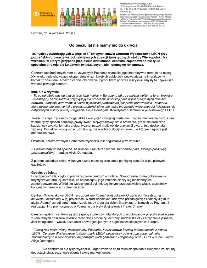 Poznań, dn. 4 września, 2008 r. Od pięciu lat nie mamy nic do ukrycia 100 tysięcy zwiedzających w pięć lat ! Ten wynik stawia Centrum Wycieczkowe LECH przy poznańskim browarze wśród największych atrakcji turystycznych stolicy Wielkopolski. Na wrzesień, w którym przypada pięciolecie działalności centrum, zaplanowano nie tylko specjalne atrakcje dla kolejnych zwiedzających, ale i ofensywę reklamową. Centrum spośród innych ofert turystycznych Poznania wyróżnia jego interaktywna formuła na miarę XXI wieku - nie chowająca eksponatów w zamkniętych gablotach, pozwalająca na interaktywny kontakt z obiektem. A bezpośrednie obcowanie z produktem poprzez wszystkie zmysły to największa wartość piwnego centrum. Inne niż wszystkie - To co odróżnia nas od innych tego typu miejsc w Europie to fakt, że można wejść na teren browaru. Zwiedzający bezpośrednio przyglądają się procesowi produkcji piwa w poszczególnych działach browaru, dotykają surowców, a każda wycieczka prowadzona jest przez przewodnika - eksperta, który doskonale zna nie tylko proces produkcji piwa, ale także przekazuje wiele anegdot i ciekawostek dotyczących kultury piwnej – wyjaśnia Alicja Domagała, Koordynator Centrum Wycieczkowego LECH. Turyści z kraju i zagranicy mogą także skorzystać z bogatej oferty gier i zabaw multimedialnych, które w atrakcyjny sposób pokazują piwny świat. Trójwymiarowy film o browarze, gra w elektroniczne kapsle, czy wysyłanie maila z gigantycznej puszki mailowej do przyjaciół gwarantują doskonałą zabawę. Dociekliwi mogą wziąć udział w quizie wiedzy o złocistym trunku, w którym nagrodą jest dodatkowe piwo. Ostatnim, bardzo ważnym elementem wycieczki jest degustacja piwa w pubie. – Podkreślamy w ten sposób, że właśnie tutaj i teraz można spróbować piwa, którego produkcję prezentowaliśmy – dodaje Alicja Domagała. Z pubem sąsiaduje sklep, w którym każdy może wybrać sobie pamiątkę spośród wielu piwnych gadżetów. Goście, goście… Przed pięcioma laty było to pierwsze piwne centrum w Polsce. Nowoczesna forma pokazywania turystycznych atrakcji sprawiła, że od początku jego istnienia cieszy się niesłabnącym zainteresowaniem. Wśród stu tysięcy gości byli między innymi przedstawiciele władz, uczestnicy kongresów naukowych i dziennikarze. Centrum Wycieczkowe LECH jest członkiem Poznańskiej Lokalnej Organizacji Turystycznej i aktywnie uczestniczy w jej projektach. Wśród wspólnych, udanych przedsięwzięć znalazły się m.in. akcja „Poznań za pół ceny”, organizacja study tours dla dziennikarzy zagranicznych po Poznaniu i realizacja filmu promocyjnego o Poznaniu dla brytyjskiej telewizji Travel Chanel. Częstymi gośćmi centrum są także grupy studentów, dla których przygotowano wycieczki edukacyjne z konkretnych obszarów wiedzy: technologii produkcji, ochrony środowiska czy zarządzania jakością. Jest co oglądać – wszak poznański browar jest jednym z najnowocześniejszych w Europie. - Cieszą nas także wizyty mieszkańców Poznania, którzy browar kojarzą jednoznacznie z piwem LECH. Centrum Wycieczkowe to świat marki LECH: począwszy od wystroju pubu, sal i gier multimedialnych a skończywszy na pamiątkowych gadżetach i degustacji piwa LECH w pubie – mówi Alicja Domagała. Ale centrum to nie tylko wycieczki. Organizowane są tu również spotkania związane ze sztuką degustacji piwa, sezonowe eventy i akcje marketingowe. Urodzinowa oprawa Każdy, kto odwiedzi Centrum Wycieczkowego LECH we wrześniu, otrzyma specjalny prezent. Z jubileuszem związana jest również wrześniowa kampania reklamowa, którą między innymi zobaczyć można na billboardach, citylightach i środkach komunikacji publicznej w Poznaniu. - Kampania pokazuje, że browar w Poznaniu jest jednym z najnowocześniejszych w Europie, swe sukcesy osiąga dzięki pracy świetnych specjalistów w zakresie produkcji i degustacji, a fachowcy gwarantują również wyjątkową atmosferę w Centrum Wycieczkowym – przekonuje Alicja Domagała. Ale to nie wszystkie działania zapowiedziane na ten miesiąc. Już 5 września na poznańskim Starym Rynku otwarta zostanie wystawa fotografii browaru. Jej otwarciu towarzyszyć będzie pokaz sztuki degustacji piwa, prowadzony przez Macieja Chołdrych – niekwestionowanego mistrza piwnej sensoryki. *** SABMiller – jeden z największych na świecie producentów piwa Kompania Piwowarska jest częścią jednego z największych na świecie producentów piwa - SABMiller plc. Grupa obecna jest w ponad 60 krajach na sześciu kontynentach, a jej portfel obejmuje ponad 150 silnych marek (m.in. Pilsner Urquell, Miller Genuine Draft, Peroni Nastro Azzurro czy Castle Lager). SABMiller plc jest jedną z największych na świecie (poza USA) firm rozlewających produkty CocaColi. W roku finansowym zakończonym 31 marca 2007 SABMiller osiągnął przychody w wysokości 18,6 mld dolarów i wypracował zysk brutto 2,8 mld dolarów. Sprzedaż piwa wyniosła 216 mln hl. Kompania Piwowarska - lider branży piwowarskiej w Polsce Kompania Piwowarska jest największym przedsiębiorstwem piwowarskim w Polsce. Kilkusetletnie doświadczenia w warzeniu piwa, nowoczesna technologia i rygorystyczne przestrzeganie zasad produkcji na światowym poziomie (World Class Manufacturing) gwarantują najwyższą jakość jej produktów. Do portfela marek należy TYSKIE (ulubione piwo Polaków), ŻUBR (druga marka w Polsce pod względem wielkości sprzedaży), LECH, Dębowe Mocne, Pilsner Urquell, Redd's, Dog in the Fog, Miller Genuine Draft, Peroni Nastro Azzurro oraz Wojak i Gingers. Kompania Piwowarska powstała w 1999 roku w wyniku połączenia Tyskich Browarów Książęcych i Lech Browary Wielkopolski. W roku 2003 do Kompanii dołączył Browar Dojlidy w Białymstoku, a w 2008 r. Browar Kielce. Wielkość sprzedaży osiągniętej przez KP w roku finansowym zakończonym 31 marca 2007 wyniosła ponad 13