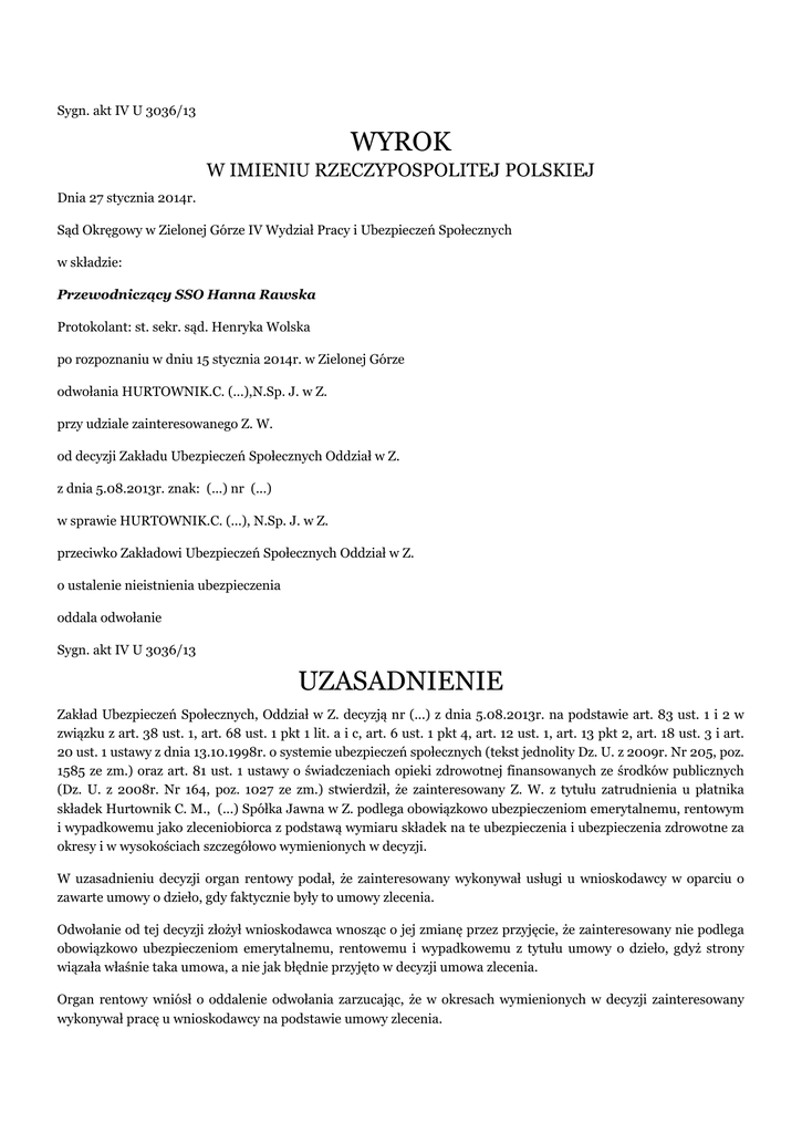 Sygn. akt IV U 3036/13 WYROK W IMIENIU RZECZYPOSPOLITEJ POLSKIEJ Dnia 27 stycznia 2014r. Sąd Okręgowy w Zielonej Górze IV Wydział Pracy i Ubezpieczeń Społecznych w składzie: Przewodniczący SSO Hanna Rawska Protokolant: st. sekr. sąd. Henryka Wolska po rozpoznaniu w dniu 15 stycznia 2014r. w Zielonej Górze odwołania HURTOWNIK.C. (...),N.Sp. J. w Z. przy udziale zainteresowanego Z. W. od decyzji Zakładu Ubezpieczeń Społecznych Oddział w Z. z dnia 5.08.2013r. znak: (...) nr (...) w sprawie HURTOWNIK.C. (...), N.Sp. J. w Z. przeciwko Zakładowi Ubezpieczeń Społecznych Oddział w Z. o ustalenie nieistnienia ubezpieczenia oddala odwołanie Sygn. akt IV U 3036/13 UZASADNIENIE Zakład Ubezpieczeń Społecznych, Oddział w Z. decyzją nr (...) z dnia 5.08.2013r. na podstawie art. 83 ust. 1 i 2 w związku z art. 38 ust. 1, art. 68 ust. 1 pkt 1 lit. a i c, art. 6 ust. 1 pkt 4, art. 12 ust. 1, art. 13 pkt 2, art. 18 ust. 3 i art. 20 ust. 1 ustawy z dnia 13.10.1998r. o systemie ubezpieczeń społecznych (tekst jednolity Dz. U. z 2009r. Nr 205, poz. 1585 ze zm.) oraz art. 81 ust. 1 ustawy o świadczeniach opieki zdrowotnej finansowanych ze środków publicznych (Dz. U. z 2008r. Nr 164, poz. 1027 ze zm.) stwierdził, że zainteresowany Z. W. z tytułu zatrudnienia u płatnika składek Hurtownik C. M., (...) Spółka Jawna w Z. podlega obowiązkowo ubezpieczeniom emerytalnemu, rentowym i wypadkowemu jako zleceniobiorca z podstawą wymiaru składek na te ubezpieczenia i ubezpieczenia zdrowotne za okresy i w wysokościach szczegółowo wymienionych w decyzji. W uzasadnieniu decyzji organ rentowy podał, że zainteresowany wykonywał usługi u wnioskodawcy w oparciu o zawarte umowy o dzieło, gdy faktycznie były to umowy zlecenia. Odwołanie od tej decyzji złożył wnioskodawca wnosząc o jej zmianę przez przyjęcie, że zainteresowany nie podlega obowiązkowo ubezpieczeniom emerytalnemu, rentowemu i wypadkowemu z tytułu umowy o dzieło, gdyż strony wiązała właśnie taka umowa, a nie jak błędnie przyjęto w decyzji umowa zlecenia. Organ rentowy wniósł o oddalenie odwołania zarzucając, że w okresach wymienionych w decyzji zainteresowany wykonywał pracę u wnioskodawcy na podstawie umowy zlecenia. Zainteresowany nie zajął stanowiska w sprawie (k. 27). Sąd ustalił następujący stan faktyczny: Wnioskodawca od 2009r. prowadzi działalność gospodarczą. Przedmiotem tej działalności była hurtowa sprzedaż drzwi i produkcja alkomatów. W 2011r. wnioskodawca zatrudniał średnio miesięcznie 21,08 pracowników w przeliczeniu na pełen etat i zleceniobiorców, a w 2012r. zatrudniał ich 24,09, (dowód: zeznania świadka D. G. k. 25, zeznania za wnioskodawcę D. M. k. 26, zeznania zainteresowanego k. 26, 27, odpis z rejestru k. 8,9, oświadczenie k. 24 tom I akt kontroli). Liczba ubezpieczonych na dzień 30.11.2012r. wynosiła 19 osób, a na dzień 10.04.2013r. – 24 osoby, (dowód: protokół kontroli – akta kontroli). W okresie od dnia 3.05.2010r. do dnia 31.12.2012r. wnioskodawca zawarł z zainteresowanym 30 umów o dzieło. Umowy o dzieło zostały zawarte w dniach: 3.05.2010r., 2.06.2010r., 1.07.2010r., 3.09.2010r., 3.11.2010r., 3.12.2010r., 4.01.2011r., 1.02.2011r., 1.03.2011r. , 1.04.2011r., 2.05.2011r., 1.06.2011r., 1.07.2011r., 1.08.2011r., 1.09.2011r., 3.10.2011r., 2.11.2011r., 1.12.2011r., 2.01.2012r., 1.02.2012r., 1.03.2012r., 2.04.2012r., 2.05.2012r., 2.06.2012r., 2.07.2012r., 1.08.2012r., 3.09.2012r., 1.10.2012r., 2.11.2012r., 3.12.2012r. Przedmiotem każdej z tych umów było wykonanie przez zainteresowanego wymiany drzwi podlegających reklamacji, naprawienie uszkodzeń „w miesiącach zawarcia umowy według uzgodnionych z klientami zgłoszeń” na podstawie zlecenia wystawionego przez dział reklamacji wnioskodawcy. Termin wykonania usługi obejmował miesiąc, na który zawarto umowę, a dzień wykonania usługi zainteresowany uzgadniał z klientem. W umowach wnioskodawca zobowiązał się udostępnić zainteresowanemu swój samochód przy wykonywaniu usług, a w razie jego braku pokryć koszty używania samochodu zainteresowanego. Odbiór wykonanych prac następował w oparciu o protokół zdawczoodbiorczy. Od momentu przekazania towarów zainteresowany ponosił odpowiedzialność za ich przypadkową utratę lub uszkodzenie. W umowach zostało ustalone wynagrodzenie zainteresowanego ryczałtowe 1.752 zł brutto miesięcznie, za wyjątkiem umów z: - 3.11.2010r. – 2.687 zł brutto, - 3.12.2010r. – 2.687 zł brutto, - 1.08.2011r. – 2.570zł brutto, - 3.10.2011r. – 1.887 zł brutto, - 1.12.2011r. – 1.986 zł brutto, (dowód: umowy o dzieło, rachunki, protokoły zdawczo-odbiorcze k. 324-530 tom II akt kontroli). Na podstawie tych umów zainteresowany zajmował się montażem drzwi zakupionych przez klientów w spółce i jeździł do klientów zgłaszających reklamację odnośnie zakupionych drzwi. Montaż drzwi wykonywał jednak sporadycznie. Zainteresowany umawiał się bezpośrednio z klientem po otrzymaniu zlecenia z działu reklamacji odnośnie dnia i godziny wykonania usługi. Używał własnych narzędzi. Jechał do zgłaszających reklamację samochodem wnioskodawcy lub własnym. W czasie reklamacji sprawdzał drzwi i jeżeli reklamacja była uzasadniona, to obowiązany był naprawić usterkę. Czasami reklamacje wynikały z niewłaściwego montażu drzwi dokonanego na własną rękę przez klientów, ale wtedy zainteresowany także starał się pomóc klientom w naprawie usterki. Wnioskodawca nie nadzorował jego pracy. Wynagrodzenie ustalone w umowach zawieranych w każdym miesiącu było niezależne od ilości pracy w danym miesiącu. Klient podpisywał protokół odbioru wykonanej usługi. Nigdy się nie zdarzyło, żeby klient zgłosił reklamację co do wykonanej usługi przez zainteresowanego. Rachunki były wypisywane przez księgowość, a wnioskodawca je podpisywał i zawsze otrzymywał wynagrodzenie ujęte w nich, a ustalone