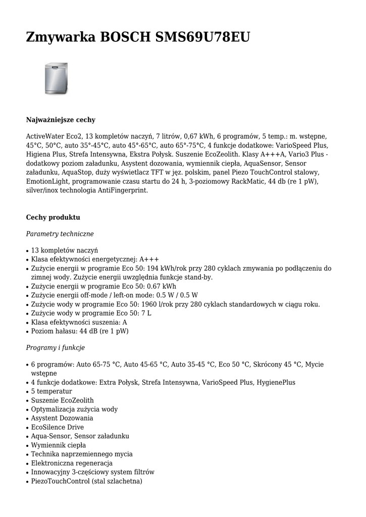 Zmywarka BOSCH SMS69U78EU Najważniejsze cechy ActiveWater Eco2, 13 kompletów naczyń, 7 litrów, 0,67 kWh, 6 programów, 5 temp.: m. wstępne, 45°C, 50°C, auto 35°-45°C, auto 45°-65°C, auto 65°-75°C, 4 funkcje dodatkowe: VarioSpeed Plus, Higiena Plus, Strefa Intensywna, Ekstra Połysk. Suszenie EcoZeolith. Klasy A+++A, Vario3 Plus dodatkowy poziom załadunku, Asystent dozowania, wymiennik ciepła, AquaSensor, Sensor załadunku, AquaStop, duży wyświetlacz TFT w jęz. polskim, panel Piezo TouchControl stalowy, EmotionLight, programowanie czasu startu do 24 h, 3-poziomowy RackMatic, 44 db (re 1 pW), silver/inox technologia AntiFingerprint. Cechy produktu Parametry techniczne ● ● ● ● ● ● ● ● ● 13 kompletów naczyń Klasa efektywności energetycznej: A+++ Zużycie energii w programie Eco 50: 194 kWh/rok przy 280 cyklach zmywania po podłączeniu do zimnej wody. Zużycie energii uwzględnia funkcje stand-by. Zużycie energii w programie Eco 50: 0.67 kWh Zużycie energii off-mode / left-on mode: 0.5 W / 0.5 W Zużycie wody w programie Eco 50: 1960 l/rok przy 280 cyklach standardowych w ciągu roku. Zużycie wody w programie Eco 50: 7 L Klasa efektywności suszenia: A Poziom hałasu: 44 dB (re 1 pW) Programy i funkcje ● ● ● ● ● ● ● ● ● ● ● ● ● 6 programów: Auto 65-75 °C, Auto 45-65 °C, Auto 35-45 °C, Eco 50 °C, Skrócony 45 °C, Mycie wstępne 4 funkcje dodatkowe: Extra Połysk, Strefa Intensywna, VarioSpeed Plus, HygienePlus 5 temperatur Suszenie EcoZeolith Optymalizacja zużycia wody Asystent Dozowania EcoSilence Drive Aqua-Sensor, Sensor załadunku Wymiennik ciepła Technika naprzemiennego mycia Elektroniczna regeneracja Innowacyjny 3-częściowy system filtrów PiezoTouchControl (stal szlachetna) ● ● ● ● ● ● ● ● ● ● EmotionLight Obsługa od góry Kolorowy graficzno-tekstowy wyświetlacz TFT o wysokiej rozdzielczości Wyświetlacz z informacją o czasie pozostałym do końca programu Sygnał akustyczny końca programu Wskaźniki w kolorze czerwonym Programowanie czasu startu: 1-24 h Wskaźnik braku soli na panelu Wskaźnik braku nabłyszczacza na panelu AntiFingerprint - specjalna powłoka chroniąca front przed odciskami palców System koszy ● ● ● ● ● ● ● ● ● System koszy VarioFlexPlus Szuflada Vario3 Plus - dodatkowy poziom załadunku XXL - kosze w kolorze srebrnym 3 poziomowy Rackmatic Składane półki w górnym koszu (6x) Składane półki w dolnym koszu (6x) Półki na filiżanki w górnym koszu (2x) Półki na filiżanki w dolnym koszu (2x) Specjalne uchwyty na kieliszki w dolnym koszu Obsługa ● ● ● ● AquaStop z gwarancją na cały czas użytkowania produktu Mechaniczne zabezpieczenie przed otworzeniem przez dzieci EasyLock GlasProtec Wymiary ● Wymiary urządzenia (WxSxG): 84.5 x 60 x 60 cm KONTAKT BSH Sprzęt Gospodarstwa Domowego