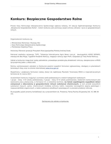 Urząd Gminy Włoszczowa Konkurs: Bezpieczne Gospodarstwo Rolne Prezes Kasy Rolniczego Ubezpieczenia Społecznego ogłasza kolejną, XV edycję Ogólnokrajowego Konkursu „Bezpieczne Gospodarstwo Rolne”. Celem konkursu jest promocja zasad ochrony zdrowia i życia w gospodarstwach rolnych. Organizatorami konkursu są: ● ● ● Ministerstwo Rolnictwa i Rozwoju Wsi Kasa Rolniczego Ubezpieczenia Społecznego Państwowa Inspekcja Pracy Honorowy Patronat sprawuje Prezydent Rzeczypospolitej Polskiej Andrzej Duda. Patronat medialny sprawują: TVP1, Telewizja Interaktywna Agro News com.pl, dwutygodnik AGRO SERWIS, miesięcznik Bez Pługa, Tygodnik Poradnik Rolniczy, magazyn rolniczy Agro Profil, Gospodarz.pl Twój Portal Rolniczy. Udział w konkursie mogą brać osoby pełnoletnie, prowadzące produkcyjną działalność rolniczą, ubezpieczone w KRUS (przynajmniej jeden z właścicieli). Rolnicy zainteresowani udziałem w Konkursie powinni wypełnić formularz zgłoszeniowy, dostępny w placówkach terenowych Kasy oraz na stronie internetowej www.krus.gov.pl. Wypełniony i podpisany formularz należy złożyć do najbliższej Placówki Terenowej KRUS w nieprzekraczalnym terminie do 31 marca 2017. Uczestnikami konkursu mogą być uczniowie szkół podstawowych w dwóch kategoriach wiekowych: I grupa – klasy 0-III szkoły podstawowej, II grupa – klasy IV-VI szkoły podstawowej. Zadaniem konkursowym jest wykonanie pracy plastycznej, w formacie A-3, w dowolnej technice, na temat zapobiegania wypadkom dzieci związanym z obecnością w gospodarstwie rolnym substancji chemicznych, w tym przede wszystkim substancji żrących, paliw, chemicznych środków ochrony roślin, nawozów (szczególnie wapna palonego) i rozpuszczalników organicznych, a także substancji szkodliwych powstających w procesie produkcji rolniczej. W przypadku pytań prosimy kontaktować się z pracownikiem ds. Prewencji, Panią Pauliną Stryjewską (tel. 41 388 36 15). Zachęcamy do udziału w konkursie. 1
