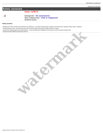 Informacje o produkcie Utworzono 07-03-2017 Rolety weneckie Cena : 0,00 zł Dostępność : Na zamówienie Stan magazynowy : brak w magazynie Średnia ocena : Rolety weneckie -podobnie jak rolety rzymskie lub austriackie są subtelnym , a zarazem ekskluzywnym rodzajem osłon okiennych nadając wnętrzu szyku i elegancji -charakteryzują się tym ,że tworzone są przy użyciu tkanin lekko zmarszczonych bądź ułożonych w fałdy w at er m ar k -opuszczone mogą przypominać zwykłe zasłony , a przy podciągnięciu dodatkowo marszczą się w pionie tworząc puszyste bufy -stanowią bardzo efektywną dekorację okienną Wygenerowano w programie www.oscGold.com