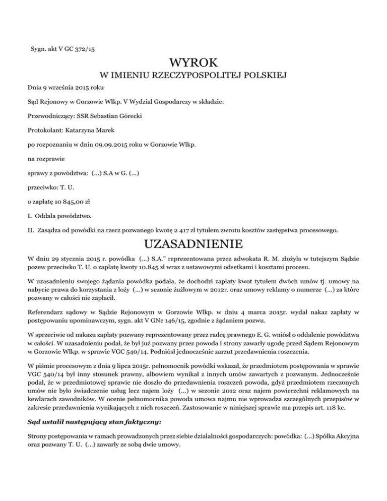 Sygn. akt V GC 372/15 WYROK W IMIENIU RZECZYPOSPOLITEJ POLSKIEJ Dnia 9 września 2015 roku Sąd Rejonowy w Gorzowie Wlkp. V Wydział Gospodarczy w składzie: Przewodniczący: SSR Sebastian Górecki Protokolant: Katarzyna Marek po rozpoznaniu w dniu 09.09.2015 roku w Gorzowie Wlkp. na rozprawie sprawy z powództwa: (...) S.A w G. (...) przeciwko: T. U. o zapłatę 10 845,00 zł I. Oddala powództwo. II. Zasądza od powódki na rzecz pozwanego kwotę 2 417 zł tytułem zwrotu kosztów zastępstwa procesowego. UZASADNIENIE W dniu 29 stycznia 2015 r. powódka (...) S.A.” reprezentowana przez adwokata R. M. złożyła w tutejszym Sądzie pozew przeciwko T. U. o zapłatę kwoty 10.845 zł wraz z ustawowymi odsetkami i kosztami procesu. W uzasadnieniu swojego żądania powódka podała, że dochodzi zapłaty kwot tytułem dwóch umów tj. umowy na nabycie prawa do korzystania z loży (...) w sezonie żużlowym w 2012r. oraz umowy reklamy o numerze (...) za które pozwany w całości nie zapłacił. Referendarz sądowy w Sądzie Rejonowym w Gorzowie Wlkp. w dniu 4 marca 2015r. wydał nakaz zapłaty w postępowaniu upominawczym, sygn. akt V GNc 146/15, zgodnie z żądaniem pozwu. W sprzeciwie od nakazu zapłaty pozwany reprezentowany przez radcę prawnego E. G. wniósł o oddalenie powództwa w całości. W uzasadnieniu podał, że był już pozwany przez powoda i strony zawarły ugodę przed Sądem Rejonowym w Gorzowie Wlkp. w sprawie VGC 540/14. Podniósł jednocześnie zarzut przedawnienia roszczenia. W piśmie procesowym z dnia 9 lipca 2015r. pełnomocnik powódki wskazał, że przedmiotem postępowania w sprawie VGC 540/14 był inny stosunek prawny, albowiem wynikał z innych umów zawartych z pozwanym. Jednocześnie podał, że w przedmiotowej sprawie nie doszło do przedawnienia roszczeń powoda, gdyż przedmiotem rzeczonych umów nie było świadczenie usług lecz najem loży (...) w sezonie 2012 oraz najem powierzchni reklamowych na kewlarach zawodników. W ocenie pełnomocnika powoda umowa najmu nie wprowadza szczególnych przepisów w zakresie przedawnienia wynikających z nich roszczeń. Zastosowanie w niniejszej sprawie ma przepis art. 118 kc. Sąd ustalił następujący stan faktyczny: Strony postępowania w ramach prowadzonych przez siebie działalności gospodarczych: powódka: (...) Spółka Akcyjna oraz pozwany T. U. (...) zawarły ze sobą dwie umowy. Strony podpisały pierwszą umowę w dniu 11.01.2011 r. Umowa obowiązywała w sezonie żużlowym 2012 r. tj. od dnia jej podpisania do dnia 31.10.2012 r. podczas imprez organizowanych w G. (...). przez powódkę. Powódka zobowiązała się do następujących świadczeń na rzecz pozwanego: - udostępnienia pozwanemu loży na stadionie na czas trwania zawodów sportowych przez 2 godziny przed ich rozpoczęciem oraz 90 minut po ich zakończeniu. - przekazania pozwanemu siedmiu całosezonowych karnetów na imprezy opisane w umowie, 20 wejściówek bezpłatnych do wykorzystania wyłącznie podczas zawodów o Drużynowe Mistrzostwo Polski, ale nie więcej niż 5 sztuk na jeden mecz, - zaproszenia do udziału we wszystkich spotkaniach (...) oraz „biznesowych organizowanych przez (...), - przygotowania kateringu, - umożliwienia korzystania z logo powódki oraz logo (...) w materiałach reklamowych pozwanego w sezonie 2012 r. Za wymienione usługi pozwany zobowiązał się zapłacić wynagrodzenie w kwocie 50.000 zł, które miało zostać zapłacone przez pozwanego w dwóch ratach po 25.000 zł płatnych, pierwsza do dnia 31.01.2012 r. oraz druga do dnia 29.02.2012 r. W dniu 15 marca 2012 r. strony zawarły drugą umowę zatytułowaną „umowa reklamy”. Umowa obowiązywała podczas meczów o Drużynowe Mistrzostwo Polski w sezonie 2012 r. tj. od dnia podpisania umowy do dnia 31.12.2012 r. Przedmiotem umowy było nabycie prawa do umieszczenia logotypu firmy pozwanego na kewlarach zawodników (A. M., K. K., M. Z., M. J. J., N. I.) na pozycji oznaczonej numerem 19. Wynagrodzenie za usługi strony oznaczyły na kwotę 3.500 zł płatną w dwóch ratach: kwotę 1.500 zł do dnia 31.03.2012 r. oraz 2.000 zł do dnia 31.07.2012 r. Dowody: - wydruk z Krajowego Rejestru Sądowego k. 11-15 akt k. 19-31 akt - wydruk (...) k. 41 - umowa nabycia prawa do loży (...) z dnia 11.01.2011r. k. 32-35 akt - umowa reklamy k. 36-38 akt. Pozwany jedynie częściowo uregulował względem powódki należności wynikające z dwóch umów. Łącznie nie zapłacił kwoty 10.845 zł. Powódka wezwała pozwanego do zapłaty brakujących należności. Pozwany nie zapłacił żądanej kwoty. Dowód: -wezwanie do zapłaty k. 39-40 akt Sąd zważył co następuje: Powództwo okazało się niezasadne. W pierwszej kolejności Sąd rozpoznał najdalej idący zarzut powagi rzeczy ugodzonej podniesiony przez pozwanego. Ugoda zawarta przez strony przed Sądem Rejonowym w Gorzowie Wlkp. w sprawie VGC 540/14, na którą powoływał się pozwany nie dotyczyła roszczeń wynikających ze spornych umów, a obejmowała roszczenia wynikające z umowy sponsoringowej zawartej w 2013 roku. W treści ugody powódka zrzekła się wyłącznie roszczeń wynikających ze stosunku prawnego będącego przedmiotem tamtego postępowania. Tymczasem niniejsze postępowanie dotyczyło innych umów, tj. zawartych na sezon 2012. Ten zarzut pozwanego okazał się zatem chybiony. Trafny okazał się za to drugi z podniesionych przez pozwanego zarzutów, tj. zarzut przedawnienia. W tym zakresie spór pomiędzy stronami dotyczył kwalifikacji prawnej łączących je stosunków prawnych wynikających z dwóch umów. Powódka stała na stanowisku, że umowy należy zakwalifikować jako umowy najmu (art. 659 i n. k.c.). Jej zdaniem pozwany był najemcą loży (na podstawie umowy z dnia 11 stycznia 2011 r.) oraz powierzchni reklamowych na kewlarach (strojach sportowych) wybranych zawodników (na podstawie umowy z dnia 15 marca 2012 r.). Zdaniem pozwanego umowy winny być zaś uznane za umowy o świ