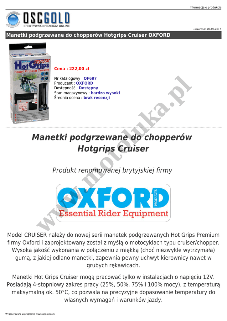 Informacje o produkcie Utworzono 07-03-2017 Manetki podgrzewane do chopperów Hotgrips Cruiser OXFORD uk Nr katalogowy : OF697 Producent : OXFORD Dostępność : Dostępny Stan magazynowy : bardzo wysoki Średnia ocena : brak recenzji a. pl Cena : 222,00 zł ot ol Manetki podgrzewane do chopperów Hotgrips Cruiser w w w .m Produkt renomowanej brytyjskiej firmy Model CRUISER należy do nowej serii manetek podgrzewanych Hot Grips Premium firmy Oxford i zaprojektowany został z myślą o motocyklach typu cruiser/chopper. Wysoka jakość wykonania w połączeniu z miękką (choć niezwykle wytrzymałą) gumą, z jakiej odlano manetki, zapewnia pewny uchwyt kierownicy nawet w grubych rękawicach. Manetki Hot Grips Cruiser mogą pracować tylko w instalacjach o napięciu 12V. Posiadają 4-stopniowy zakres pracy (25%, 50%, 75% i 100% mocy), z temperaturą maksymalną ok. 50°C, co pozwala na precyzyjne dopasowanie temperatury do własnych wymagań i warunków jazdy. Wygenerowano w programie www.oscGold.com Sterowanie podgrzewaniem odbywa się za pomocą wodoodpornego stylowego chromowanego regulatora. Specjalnie zaprogramowany regulator zapobiega całkowitemu rozładowaniu akumulatora w trakcie używania manetek na postoju. Cechy produktu: w w w .m ot ol uk a. pl - prosty montaż na każdej kierownicy o średnicy do 25mm - elastyczna i jednocześnie wytrzymała guma z zatopionymi na stałe elementami grzewczymi - wodoodporny, łatwy w obsłudze nawet w rękawicach, panel sterujący - silikonowe, odporne nawet na mróz, przewody - 4-stopniowa regulacja mocy (25%, 50%, 75% i 100% - ok. 50°C) - regulator zapobiegający rozładowaniu akumulatora - niski pobór prądu (poniżej 4A) - możliwość przycięcia manetek do potrzebnego rozmiaru w w w .m ot ol uk a. pl Informacje o produkcie Wygenerowano w programie www.oscGold.com