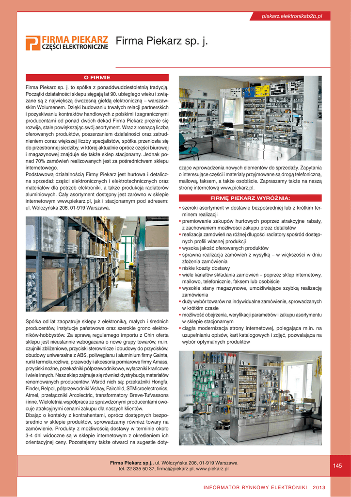 piekarz.elektronikab2b.pl Firma Piekarz sp. j. O FIRMIE Firma Piekarz sp. j. to spółka z ponaddwudziestoletnią tradycją. Początki działalności sklepu sięgają lat 90. ubiegłego wieku izwiązane są znajwiększą ówczesną giełdą elektroniczną – warszawskim Wolumenem. Dzięki budowaniu trwałych relacji partnerskich ipozyskiwaniu kontraktów handlowych zpolskimi izagranicznymi producentami od ponad dwóch dekad Firma Piekarz prężnie się rozwija, stale powiększając swój asortyment. Wraz zrosnącą liczbą oferowanych produktów, poszerzaniem działalności oraz zatrudnieniem coraz większej liczby specjalistów, spółka przeniosła się do przestronnej siedziby, wktórej aktualnie oprócz części biurowej imagazynowej znajduje się także sklep stacjonarny. Jednak ponad 70% zamówień realizowanych jest za pośrednictwem sklepu internetowego. Podstawową działalnością Firmy Piekarz jest hurtowa i detaliczna sprzedaż części elektronicznych i elektrotechnicznych oraz materiałów dla potrzeb elektroniki, a także produkcja radiatorów aluminiowych. Cały asortyment dostępny jest zarówno wsklepie internetowym www.piekarz.pl, jak i stacjonarnym pod adresem: ul. Wólczyńska 206, 01-919 Warszawa. Spółka od lat zaopatruje sklepy zelektroniką, małych iśrednich producentów, instytucje państwowe oraz szerokie grono elektroników-hobbystów. Za sprawą regularnego importu zChin oferta sklepu jest nieustannie wzbogacana onowe grupy towarów, m.in. czujniki zbliżeniowe, przyciski sterownicze iobudowy do przycisków, obudowy uniwersalne zABS, poliwęglanu ialuminium firmy Gainta, rurki termokurczliwe, przewody iakcesoria pomiarowe firmy Amass, przyciski nożne, przekaźniki półprzewodnikowe, wyłączniki krańcowe iwiele innych. Nasz sklep zajmuje się również dystrybucją materiałów renomowanych producentów. Wśród nich są: przekaźniki Hongfa, Finder, Relpol, półprzewodniki Vishay, Fairchild, STMicroelectronics, Atmel, przełączniki Arcolectric, transformatory Breve-Tufvassons iinne. Wieloletnia współpraca ze sprawdzonymi producentami owocuje atrakcyjnymi cenami zakupu dla naszych klientów. Dbając o kontakty z kontrahentami, oprócz dostępnych bezpośrednio w sklepie produktów, sprowadzamy również towary na zamówienie. Produkty z możliwością dostawy w terminie około 3-4 dni widoczne są w sklepie internetowym z określeniem ich orientacyjnej ceny. Pozostajemy także otwarci na sugestie doty- czące wprowadzenia nowych elementów do sprzedaży. Zapytania ointeresujące części imateriały przyjmowane są drogą telefoniczną, mailową, faksem, atakże osobiście. Zapraszamy także na naszą stronę internetową www.piekarz.pl. FIRMĘ PIEKARZ WYRÓŻNIA: szeroki asortyment wdostawie bezpośredniej lub zkrótkim terminem realizacji premiowanie zakupów hurtowych poprzez atrakcyjne rabaty, zzachowaniem możliwości zakupu przez detalistów realizacja zamówień na różnej długości radiatory spośród dostępnych profili własnej produkcji wysoka jakość oferowanych produktów sprawna realizacja zamówień zwysyłką – wwiększości wdniu złożenia zamówienia niskie koszty dostawy wiele kanałów składania zamówień – poprzez sklep internetowy, mailowo, telefonicznie, faksem lub osobiście wysokie stany magazynowe, umożliwiające szybką realizację zamówienia duży wybór towarów na indywidualne zamówienie, sprowadzanych wkrótkim czasie możliwość obejrzenia, weryfikacji parametrów izakupu asortymentu wsklepie stacjonarnym ciągła modernizacja strony internetowej, polegająca m.in. na uzupełnianiu opisów, kart katalogowych izdjęć, pozwalająca na wybór optymalnych produktów Firma Piekarz sp.j., ul. Wólczyńska 206, 01-919 Warszawa tel. 22 835 50 37, fi[email protected], www.piekarz.pl I N F O R M AT O R R Y N KO W Y E L E K T R O N I K I 145 2013