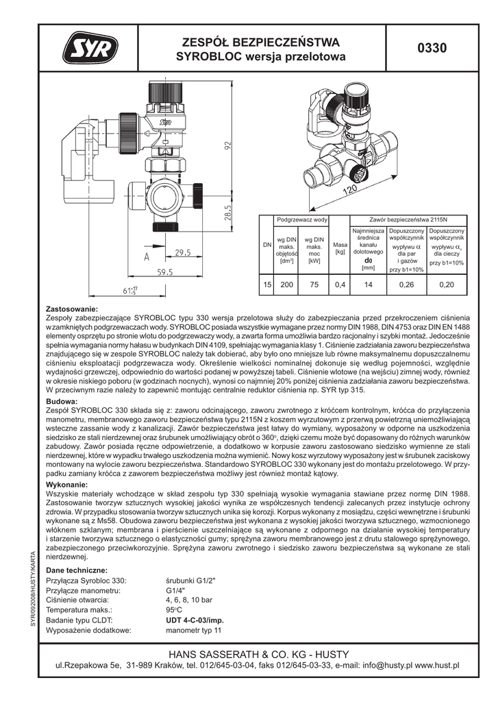 ZESPÓŁ BEZPIECZEŃSTWA SYROBLOC wersja przelotowa Podgrzewacz wody DN 15 wg DIN maks. objętość [dm3] wg DIN maks. moc [kW] 200 75 0330 Zawór bezpieczeństwa 2115N Najmniejsza Dopuszczony Dopuszczony średnica współczynnik współczynnik kanału Masa wypływu α wypływu αc [kg] dolotowego dla par dla cieczy d0 i gazów przy b1=10% [mm] przy b1=10% 0,4 14 0,26 0,20 Zastosowanie: Zespoły zabezpieczające SYROBLOC typu 330 wersja przelotowa służy do zabezpieczania przed przekroczeniem ciśnienia w zamkniętych podgrzewaczach wody. SYROBLOC posiada wszystkie wymagane przez normy DIN 1988, DIN 4753 oraz DIN EN 1488 elementy osprzętu po stronie wlotu do podgrzewaczy wody, a zwarta forma umożliwia bardzo racjonalny i szybki montaż. Jedocześnie spełnia wymagania normy hałasu w budynkach DIN 4109, spełniając wymagania klasy 1. Ciśnienie zadziałania zaworu bezpieczeństwa znajdującego się w zespole SYROBLOC należy tak dobierać, aby było ono mniejsze lub równe maksymalnemu dopuszczalnemu ciśnieniu eksploatacji podgrzewacza wody. Określenie wielkości nominalnej dokonuje się według pojemności, względnie wydajności grzewczej, odpowiednio do wartości podanej w powyższej tabeli. Ciśnienie wlotowe (na wejściu) zimnej wody, również w okresie niskiego poboru (w godzinach nocnych), wynosi co najmniej 20% poniżej ciśnienia zadziałania zaworu bezpieczeństwa. W przeciwnym razie należy to zapewnić montując centralnie reduktor ciśnienia np. SYR typ 315. SYR/092008/HUSTY/KARTA Budowa: Zespół SYROBLOC 330 składa się z: zaworu odcinającego, zaworu zwrotnego z króćcem kontrolnym, króćca do przyłączenia manometru, membranowego zaworu bezpieczeństwa typu 2115N z koszem wyrzutowym z przerwą powietrzną uniemożliwiającą wsteczne zassanie wody z kanalizacji. Zawór bezpieczeństwa jest łatwy do wymiany, wyposażony w odporne na uszkodzenia siedzisko ze stali nierdzewnej oraz śrubunek umożliwiający obrót o 360o, dzięki czemu może być dopasowany do różnych warunków zabudowy. Zawór posiada ręczne odpowietrzenie, a dodatkowo w korpusie zaworu zastosowano siedzisko wymienne ze stali nierdzewnej, które w wypadku trwałego uszkodzenia można wymienić. Nowy kosz wyrzutowy wyposażony jest w śrubunek zaciskowy montowany na wylocie zaworu bezpieczeństwa. Standardowo SYROBLOC 330 wykonany jest do montażu przelotowego. W przypadku zamiany króćca z zaworem bezpieczeństwa możliwy jest również montaż kątowy. Wykonanie: Wszyskie materiały wchodzące w skład zespołu typ 330 spełniają wysokie wymagania stawiane przez normę DIN 1988. Zastosowanie tworzyw sztucznych wysokiej jakości wynika ze współczesnych tendencji zalecanych przez instytucje ochrony zdrowia. W przypadku stosowania tworzyw sztucznych unika się korozji. Korpus wykonany z mosiądzu, części wewnętrzne i śrubunki wykonane są z Ms58. Obudowa zaworu bezpieczeństwa jest wykonana z wysokiej jakości tworzywa sztucznego, wzmocnionego włóknem szklanym; membrana i pierścienie uszczelniające są wykonane z odpornego na działanie wysokiej temperatury i starzenie tworzywa sztucznego o elastyczności gumy; sprężyna zaworu membranowego jest z drutu stalowego sprężynowego, zabezpieczonego przeciwkorozyjnie. Sprężyna zaworu zwrotnego i siedzisko zaworu bezpieczeństwa są wykonane ze stali nierdzewnej. Dane techniczne: Przyłącza Syrobloc 330: Przyłącze manometru: Ciśnienie otwarcia: Temperatura maks.: Badanie typu CLDT: Wyposażenie dodatkowe: śrubunki G1/2" G1/4" 4, 6, 8, 10 bar 95oC UDT 4-C-03/imp. manometr typ 11 HANS SASSERATH & CO. KG - HUSTY ul.Rzepakowa 5e, 31-989 Kraków, tel. 012/645-03-04, faks 012/645-03-33, e-mail: [email protected] www.hust.pl Zawór bezpieczeństwa Kosz wyrzutowy z przedłużeniem teleskopowym Zawór zwrotny Korpus zaworu Korek manometru 0828.08.000