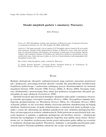 Fragm. Flor. Geobot. Polonica 10: 221–240, 2003 Mszaki miejskich parków i cmentarzy Warszawy EWA FUDALI FUDALI, E. 2003. Bryophytes of parks and cemeteries of Warszawa town. Fragmenta Floristica et Geobotanica Polonica 10: 221–240. Kraków. PL ISSN 1640-629X. ABSTRACT: The paper presents a list of stations of 67 bryophyte species found in 26 town parks and cemeteries situated within administrative borders of Warszawa town, with short descriptions of colonized substrata and frequency of occurrence in both types of town biotops. Species richness and ecological structure of bryoflora are analysed in relation to localization in town, architectural type, origin and age of parks as well as to microclimatical and topographical differentation of town area. KEY WORDS : urban bryophytes, parks, cemeteries, Warszawa E. Fudali, Katedra Botaniki i Fizjologii Roślin, Akademia Rolnicza, ul. Cybulskiego 32, PL-50-205 Wroclaw, Polska, e-mail: [email protected] WSTE˛P Badania ekologiczne obszarów zurbanizowanych maja˛ zarówno znaczenie poznawcze jak i praktyczne, pozwalaja˛ bowiem określić warunki dla prawidłowego kształtowania krajobrazu kulturowego i zachowania istnieja˛cej jeszcze bioróżnorodności na terenach miejskich (GOODE 1998; SUKOPP 1998; FUDALI 2000a, b; WILKE 2000). Poznanie struktury elementarnej i przestrzennej flory miast jest podstawa˛ wytypowania obszarów potencjalnie do tego zdolnych (JACKOWIAK 1998). Spośród licznych specyficznych biotopów miejskich tylko parki i cmentarze stwarzaja˛ warunki sprzyjaja˛ce rozwojowi mszaków (FUDALI 1996). Szczegółowe badania briologiczne przeprowadzone we Wrocławiu (FUDALI 2001a, b) i Poznaniu (FUDALI 2002) wykazały jednak, że nie wszystkie obiekty nazywane parkami charakteryzuja˛ sie˛ bogata˛ brioflora˛. Zaobserwowano, że parki zlokalizowane w centrum tych miast sa˛ ubogie w gatunki i cze˛sto nie odróżniaja˛ sie˛ składem gatunkowym oraz struktura˛ ekologiczna˛ brioflory od otaczaja˛cych je terenów zabudowanych. Parki położone na peryferiach były znacznie bogatsze w gatunki, a spektrum ekologiczne ich brioflory szersze – obejmowało bowiem nie wyste˛puja˛ce w centrum epiksyle, higrofity oraz epifity sensu stricto. Stwierdzono też, że charakter użytkowania terenu przed założeniem parku odbija sie˛ wyraźnie w strukturze ekologicznej parków Wrocławia. Jednakże w przypadku peryferyjnie położonych parków Poznania podobna zależność nie rysuje sie˛ tak jednoznacznie. 222 Fragm. Flor. Geobot. Polonica 10, 2003 Niezbadanym dota˛d problemem pozostaje także wpływ lokalnych czynników środowiskowych (glebowych i klimatycznych) na kształtowanie sie˛ brioflory miast. Badania nad flora˛ mszaków terenów miejskich Hiszpanii i Włoch wykazały zależność mie˛dzy bogactwem gatunkowym a klimatem. Obszary be˛da˛ce pod wpływem klimatu śródziemnomorskiego były bogatsze niż te znajduja˛ce sie˛ w zasie˛gu klimatu kontynentalnego (LO G IUDICE i in. 1997). Teren Warszawy położony jest w obre˛bie czterech jednostek fizjograficznych, różnia˛cych sie˛ istotnie wielkościa˛ średnich rocznych opadów i wilgotnościa˛ wzgle˛dna˛ powietrza (GROCHOLSKA 1974; KONDRACKI 1978). Wilgotność jest podstawowym czynnikiem ekologicznym generuja˛cym rozwój mszaków. Niestety znajomość współczesnych stosunków briologicznych miasta jest niewystarczaja˛ca, aby stwierdzić, czy zróżnicowanie fizjograficzne i wynikaja˛ce z tego różnice mikroklimatyczne maja˛ widoczny wpływ na rozmieszczenie mszaków na terenie Warszawy (FUDALI 1998). Flora naczyniowa stolicy, zarówno w aspekcie współczesnego zróżnicowania gatunkowego i wyste˛powania, jak i historycznych przemian zwia˛zanych z rozwojem urbanizacyjnym, została dobrze poznana i opisana (SUDNIK-WÓJCIKOWSKA 1987, 1998). Na tym tle niekorzystnie odbija sie˛ stan wiedzy o aktualnej florze mszaków miasta. Zainicjowane pod koniec lat 70. przez prof. I. Rejment-Grochowska˛ z UW (i przerwane z chwila˛ jej śmierci) badania briologiczne warszawskich parków i skwerów zaowocowały nieopublikowanymi opracowaniami brioflory trzech obiektów: Parku Łazienkowskiego (FIEDZIUKIEWICZ 1978), Lasku Bielańskiego (BOJANOWSKA 1977) i trawników Trasy Łazienkowskiej (KLIMCZAK 1980). Wcześniej zbadana została brioflora Ogrodu Botanicznego Uniwersytetu Warszawskiego (KWIECIEŃ 1971). Ła˛cznie, w pracach tych podano stanowiska 97 gatunków mszaków. Mszaki w Warszawie wybrano też za obiekt badań bioindykacyjnych, których celem było określenie zawartości metali cie˛żkich w tych roślinach, zarówno wyste˛puja˛cych naturalnie jak i transplantowanych na teren miasta (CZARNOWSKA & REJMENT-G ROCHOWSKA 1974; REJMENT-GROCHOWSKA 1976). Z florystycznego punktu widzenia nie wniosły one nowych danych. Niniejsze opracowanie jest kontynuacja˛ prezentacji brioflory parków i cmentarzy wybranych miast Polski. Zawiera wykaz mszaków zebranych na obszarze wszystkich takich obiektów Warszawy, a także ocene˛ cze˛stości wyste˛powania gatunków w tych biotopach oraz analize˛ struktury ekologicznej brioflory w odniesieniu do położenia geograficznego obiektów, ich lokalizacji wzgle˛dem centrum, koncepcji architektonicznej założenia, wieku i charakteru użytkowania terenu przed ich powstaniem. Przesłanki teoretyczne podje˛tych studiów nad brioflora˛ miejskich parków i cmentarzy oraz hipotezy badawcze zostały przedstawione we wcześniejszych pracach autorki (FUDALI 2000a-c, 2001a, b). MATERIAŁ I METODY Badania briologiczne przeprowadzono latem 2001r. w 26 miejskich parkach i na 13 cmentarzach Warszawy. Obejmowały one dokonanie notatek florystyczno-ekologicznych (gatunek, rodzaj podłoża, wielkość darni, ilość wysta˛pień) oraz zbiór materiałów zielnikowych ze wszystkich mikrosiedlisk: powierzchnie trawnikowe (otwarte i zacienionie), ścieżki, murki (suche i wilgotne), pnie i podstawa drzew, zarośla, nagrobki oraz spróchnia