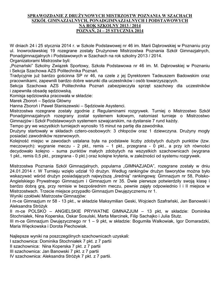 SPRAWOZDANIE Z DRUŻYNOWYCH MISTRZOSTW POZNANIA W SZACHACH SZKÓŁ GIMNAZJALNYCH, PONADGIMNAZJALNYCH I PODSTAWOWYCH NA ROK SZKOLNY 2013 / 2014 POZNAŃ, 24 – 25 STYCZNIA 2014 W dniach 24 i 25 stycznia 2014 r. w Szkole Podstawowej nr 46 im. Marii Dąbrowskiej w Poznaniu przy ul. Inowrocławskiej 19 rozegrane zostały Drużynowe Mistrzostwa Poznania Szkół Gimnazjalnych, Ponadgimnazjalnych i Podstawowych w Szachach na rok szkolny 2013 / 2014. Organizatorami Mistrzostw byli: „Poznański” Szkolny Związek Sportowy, Szkoła Podstawowa nr 46 im. M. Dąbrowskiej w Poznaniu i Sekcja Szachowa AZS Politechnika Poznań. Tradycyjnie już bardzo gościnna SP nr 46, na czele z jej Dyrektorem Tadeuszem Badowskim oraz pracownikami, zapewnili bardzo dobre warunki dla uczestników i osób towarzyszących. Sekcja Szachowa AZS Politechnika Poznań zabezpieczyła sprzęt szachowy dla uczestników i zapewniła obsadę sędziowską. Komisja sędziowska pracowała w składzie: Marek Zboroń – Sędzia Główny Hanna Zboroń i Paweł Staniszewski – Sędziowie Asystenci. Mistrzostwa rozegrane zostały zgodnie z Regulaminami rozgrywek. Turniej o Mistrzostwo Szkół Ponadgimnazjalnych rozegrany został systemem kołowym, natomiast turnieje o Mistrzostwo Gimnazjów i Szkół Podstawowych systemem szwajcarskim, na dystansie 7 rund każdy. Tempo gry we wszystkich turniejach wynosiło 15 minut na partię dla zawodnika. Drużyny startowały w składach cztero-osobowych: 3 chłopców oraz 1 dziewczyna. Drużyny mogły posiadać zawodników rezerwowych. Kolejność miejsc w zawodach ustalana była na podstawie liczby zdobytych dużych punktów (tzw. meczowych): wygranie meczu - 2 pkt., remis – 1 pkt., przegrana - 0 pkt., a przy ich równości decydowało kolejno - suma punktów małych zdobytych na wszystkich szachownicach (wygrana 1 pkt., remis 0,5 pkt., przegrana - 0 pkt.) oraz kolejne kryteria, w zależności od systemu rozgrywek. Mistrzostwa Poznania Szkół Gimnazjalnych, popularna „GIMNAZJADA”, rozegrane zostały w dniu 24.01.2014 r. W Turnieju wzięło udział 10 drużyn. Według rankingów drużyn faworytów można było wskazywać wśród drużyn posiadających najwyższą „średnią” rankingową: Gimnazjum nr 58, PolskoAngielskiego Prywatnego Gimnazjum i Gimnazjum nr 35. Dwie pierwsze potwierdziły swoją klasę i bardzo dobrą grą, przy remisie w bezpośrednim meczu, pewnie zajęły odpowiednio I i II miejsce w Mistrzostwach. Trzecie miejsce przypadło Gimnazjum Dwujęzycznemu nr 1. Wyniki czołówki Mistrzostw Gimnazjów: I m-ce Gimnazjum nr 58 - 13 pkt., w składzie Maksymilian Geski, Wojciech Szafrański, Jan Banowski i Aleksandra Stróżyk II m-ce POLSKO – ANGIELSKIE PRYWATNE GIMNAZJUM – 13 pkt, w składzie: Dominika Stochniałek, Nina Koperska, Oskar Sosulski, Marta Marcinek, Filip Sachajko i Julia Stutz. III m-ce Gimnazjum Dwujęzycznego nr 1 – 9 pkt, w składzie: Bogumiła Walkowiak, Igor Domaradzki, Maria Więckowska i Dorota Piechowiak. Najlepsze wyniki na poszczególnych szachownicach uzyskali: I szachownica: Dominika Stochniałek 7 pkt. z 7 partii II szachownica: Nina Koperska 7 pkt. z 7 partii III szachownica: Jan Banowski 7 pkt. z 7 partii IV szachownica: Aleksandra Stróżyk 7 pkt. z 7 partii. Poniżej (po lewej) Mistrzowie Poznania - drużyna Gimnazjum nr 58. Kolejno pozostali medaliści i sala rozgrywek. Mistrzostwa Poznania Szkół Ponadgimnazjalnych – „LICEALIADA” rozegrane zostały również w dniu 24.01.2014 r. W Turnieju udział wzięło 6 drużyn. Rozgrywki przeprowadzono systemem jednokołowym „każda drużyna z każdą”. W rozgrywkach pewnie wygrała drużyna Liceum nr III – zremisowała tylko jeden mecz, wygrała wszystkie pozostałe i z przewagą dwóch punktów meczowych bezapelacyjnie zdobyła tytuł Mistrzów Poznania. Wyniki czołówki Mistrzostw Szkół Ponadgimnazjalnych: I m-ce LICEUM nr III – 9 pkt., w składzie: Karolina Jarmużek, Mikołaj Nowaczyk, Bartosz Damrath i Mirela Baranowska. II m-ce LICEUM nr II – 7 pkt., w składzie: Paweł Musiałkiewicz, Tomasz Andrzejewski, Piotr Pietrzak i Michalina Sarzyńska. III m-ce LICEUM nr XVI – 6 pkt., w składzie: Tomasz Kałużny, Bartosz Kopras, Artur Mostowski i Sandra Kucharczak. Najlepsze wyniki na poszczególnych szachownicach uzyskali: I szachownica: Paweł Musiałkiewicz 4,5 pkt. z 5 partii II szachownica: Mikołaj Nowaczyk 5 pkt. z 5 partii III szachownica: Piotr Pietrzak 5 pkt. z 5 partii IV szachownica: Mirela Baranowska 5 pkt. z 5 partii Poniżej (po lewej) drużyna Mistrzów Poznania Szkół Ponadgimnazjalnych – Liceum nr III i kolejni medaliści oraz mecz medalistów. Mistrzostwa Poznania Szkół Podstawowych rozegrane zostały w dniu 25.01.2014 r. W turnieju udział wzięło 16 drużyn. Tym razem zawiódł faworyt Mistrzostw – drużyna Polsko-Angielskiej Prywatnej Szkoły Podstawowej. Rewanż za ubiegły rok wzięła świetnie tego dnia dysponowana drużyna SP 46 gospodarza tegorocznych Mistrzostw. Szkoła nr 46 kolejno od trzech lat zdobywa kolejno brązowe, srebrne i wreszcie w b.r. szkolnym zdecydowanie złote medale Mistrzostw! SP 46 wygrała wszystkie mecze, a zawodnicy tej drużyny przegrali tylko 2 z 28 partii! Wyniki czołówki Mistrzostw Szkół Podstawowych: I m-ce SZKOŁA PODSTAWOWA 46 – 14 pkt., w składzie: Mikołaj Nowak, Bruno Urbaniak, Witold Lewandowski, Lena Jankowska i Stanisław Kałużny II m-ce POLSKO – ANGIELSKA PRYWATNA SP – 12 pkt., w składzie: Martyna Wojciechowska, Florentyna Piotrowska, Piotr Franc, Anna Roszkiewicz i Nela Kultys. III m-ce SZKOŁA PODSTAWOWA 63 - 9 pkt., w składzie: Paweł Pietrzak, Adam Dopierała, Jakub Szostek i Zofia Maciejewska. Najlepsze wyniki na poszczególnych szachownicach uzyskali: I szachownica: Mikołaj Nowak 7 pkt. z 7 partii II szachownica: Bruno Urbaniak 6 pkt. z 7 partii III szachownica: Michał Kowalski (SP 29) i Stanisław Walkowiak (SP 61) po 6 pkt. z 7 partii IV szachownica: Anna Roszkiewicz i Pola K