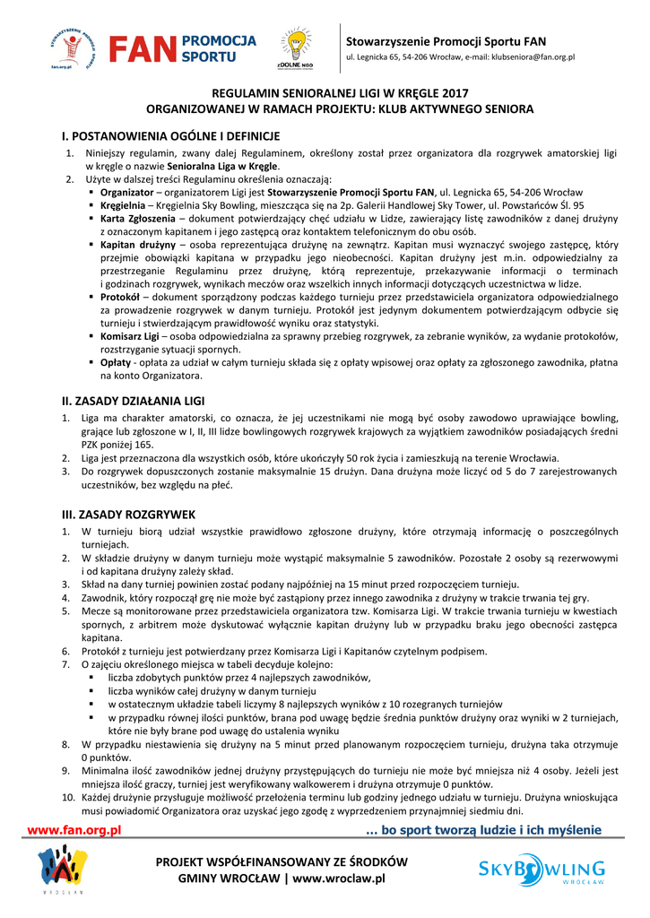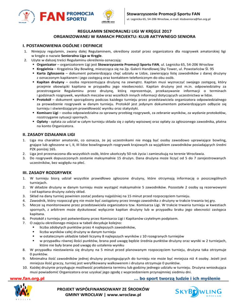 Stowarzyszenie Promocji Sportu FAN ul. Legnicka 65, 54-206 Wrocław, e-mail: [email protected] REGULAMIN SENIORALNEJ LIGI W KRĘGLE 2017 ORGANIZOWANEJ W RAMACH PROJEKTU: KLUB AKTYWNEGO SENIORA I. POSTANOWIENIA OGÓLNE I DEFINICJE 1. 2. Niniejszy regulamin, zwany dalej Regulaminem, określony został przez organizatora dla rozgrywek amatorskiej ligi w kręgle o nazwie Senioralna Liga w Kręgle. Użyte w dalszej treści Regulaminu określenia oznaczają: Organizator – organizatorem Ligi jest Stowarzyszenie Promocji Sportu FAN, ul. Legnicka 65, 54-206 Wrocław Kręgielnia – Kręgielnia Sky Bowling, mieszcząca się na 2p. Galerii Handlowej Sky Tower, ul. Powstańców Śl. 95 Karta Zgłoszenia – dokument potwierdzający chęć udziału w Lidze, zawierający listę zawodników z danej drużyny z oznaczonym kapitanem i jego zastępcą oraz kontaktem telefonicznym do obu osób. Kapitan drużyny – osoba reprezentująca drużynę na zewnątrz. Kapitan musi wyznaczyć swojego zastępcę, który przejmie obowiązki kapitana w przypadku jego nieobecności. Kapitan drużyny jest m.in. odpowiedzialny za przestrzeganie Regulaminu przez drużynę, którą reprezentuje, przekazywanie informacji o terminach i godzinach rozgrywek, wynikach meczów oraz wszelkich innych informacji dotyczących uczestnictwa w lidze. Protokół – dokument sporządzony podczas każdego turnieju przez przedstawiciela organizatora odpowiedzialnego za prowadzenie rozgrywek w danym turnieju. Protokół jest jedynym dokumentem potwierdzającym odbycie się turnieju i stwierdzającym prawidłowość wyniku oraz statystyki. Komisarz Ligi – osoba odpowiedzialna za sprawny przebieg rozgrywek, za zebranie wyników, za wydanie protokołów, rozstrzyganie sytuacji spornych. Opłaty - opłata za udział w całym turnieju składa się z opłaty wpisowej oraz opłaty za zgłoszonego zawodnika, płatna na konto Organizatora. II. ZASADY DZIAŁANIA LIGI 1. 2. 3. Liga ma charakter amatorski, co oznacza, że jej uczestnikami nie mogą być osoby zawodowo uprawiające bowling, grające lub zgłoszone w I, II, III lidze bowlingowych rozgrywek krajowych za wyjątkiem zawodników posiadających średni PZK poniżej 165. Liga jest przeznaczona dla wszystkich osób, które ukończyły 50 rok życia i zamieszkują na terenie Wrocławia. Do rozgrywek dopuszczonych zostanie maksymalnie 15 drużyn. Dana drużyna może liczyć od 5 do 7 zarejestrowanych uczestników, bez względu na płeć. III. ZASADY ROZGRYWEK 1. W turnieju biorą udział wszystkie prawidłowo zgłoszone drużyny, które otrzymają informację o poszczególnych turniejach. 2. W składzie drużyny w danym turnieju może wystąpić maksymalnie 5 zawodników. Pozostałe 2 osoby są rezerwowymi i od kapitana drużyny zależy skład. 3. Skład na dany turniej powinien zostać podany najpóźniej na 15 minut przed rozpoczęciem turnieju. 4. Zawodnik, który rozpoczął grę nie może być zastąpiony przez innego zawodnika z drużyny w trakcie trwania tej gry. 5. Mecze są monitorowane przez przedstawiciela organizatora tzw. Komisarza Ligi. W trakcie trwania turnieju w kwestiach spornych, z arbitrem może dyskutować wyłącznie kapitan drużyny lub w przypadku braku jego obecności zastępca kapitana. 6. Protokół z turnieju jest potwierdzany przez Komisarza Ligi i Kapitanów czytelnym podpisem. 7. O zajęciu określonego miejsca w tabeli decyduje kolejno: liczba zdobytych punktów przez 4 najlepszych zawodników, liczba wyników całej drużyny w danym turnieju w ostatecznym układzie tabeli liczymy 8 najlepszych wyników z 10 rozegranych turniejów w przypadku równej ilości punktów, brana pod uwagę będzie średnia punktów drużyny oraz wyniki w 2 turniejach, które nie były brane pod uwagę do ustalenia wyniku 8. W przypadku niestawienia się drużyny na 5 minut przed planowanym rozpoczęciem turnieju, drużyna taka otrzymuje 0 punktów. 9. Minimalna ilość zawodników jednej drużyny przystępujących do turnieju nie może być mniejsza niż 4 osoby. Jeżeli jest mniejsza ilość graczy, turniej jest weryfikowany walkowerem i drużyna otrzymuje 0 punktów. 10. Każdej drużynie przysługuje możliwość przełożenia terminu lub godziny jednego udziału w turnieju. Drużyna wnioskująca musi powiadomić Organizatora oraz uzyskać jego zgodę z wyprzedzeniem przynajmniej siedmiu dni. www.fan.org.pl … bo sport tworzą ludzie i ich myślenie PROJEKT WSPÓŁFINANSOWANY ZE ŚRODKÓW GMINY WROCŁAW | www.wroclaw.pl Stowarzyszenie Promocji Sportu FAN ul. Legnicka 65, 54-206 Wrocław, e-mail: [email protected] IV. WARUNKI UCZESTNICTWA 1. 2. 3. 4. 5. 6. Zgłoszenie drużyny do rozgrywek przyjmuje Organizator. Podstawowymi warunkami umożliwiającym przystąpienie do rozgrywek, są: a. dostarczenie wypełnionej elektronicznie Karty Zgłoszenia [załącznik nr 1] na e-mail [email protected] najpóźniej 10 dni przed rozpoczęciem rozgrywek ligi seniora b. dokonania stosownej opłaty przynajmniej na 5 dni przed rozpoczęciem rozgrywek ligi w wysokości: 50,00 zł – wpisowe niezależenie od ilości zgłaszanych osób 35,00 zł – za każdego zawodnika w przypadku zgłoszenia drużyny składającej się z 6-7 osób 40,00 zł – za każdego zawodnika w przypadku zgłoszenia drużyny składającej się z 4-5 osób w przypadku gdy w składzie drużyny znajduje się członek Stowarzyszenia Promocji Sportu FAN (który dokonał opłaty składki członkowskiej na 2017 rok) opłata za danego zawodnika jest pomniejszana o kwotę 10,00 zł i wyniesie w zależności od ilości osób w drużynie 25,00 zł lub 30,00 zł. c. Stosownej opłaty należy dokonać na rachunek Organizatora w banku Raiffeisen Bank Polska Spółka Akcyjna nr konta: 66 1750 0012 0000 0000 3108 6736 Potwierdzenie zarejestrowania drużyny do ligi oraz terminarz rozgrywek otrzyma Kapitan drużyny lub jego Zastępca na adres e-mail podany w Karcie Zgłoszenia. Udział w rozgrywkach jest płatny z góry za sezon za druży