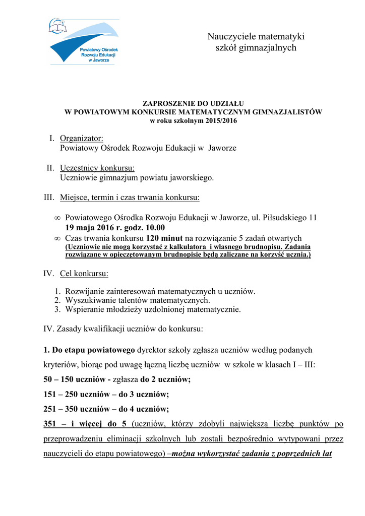 Nauczyciele matematyki szkół gimnazjalnych ZAPROSZENIE DO UDZIAŁU W POWIATOWYM KONKURSIE MATEMATYCZNYM GIMNAZJALISTÓW w roku szkolnym 2015/2016 I. Organizator: Powiatowy Ośrodek Rozwoju Edukacji w Jaworze II. Uczestnicy konkursu: Uczniowie gimnazjum powiatu jaworskiego. III. Miejsce, termin i czas trwania konkursu: • Powiatowego Ośrodka Rozwoju Edukacji w Jaworze, ul. Piłsudskiego 11 19 maja 2016 r. godz. 10.00 • Czas trwania konkursu 120 minut na rozwiązanie 5 zadań otwartych (Uczniowie nie mogą korzystać z kalkulatora i własnego brudnopisu. Zadania rozwiązane w opieczętowanym brudnopisie będą zaliczane na korzyść ucznia.) IV. Cel konkursu: 1. Rozwijanie zainteresowań matematycznych u uczniów. 2. Wyszukiwanie talentów matematycznych. 3. Wspieranie młodzieży uzdolnionej matematycznie. IV. Zasady kwalifikacji uczniów do konkursu: 1. Do etapu powiatowego dyrektor szkoły zgłasza uczniów według podanych kryteriów, biorąc pod uwagę łączną liczbę uczniów w szkole w klasach I – III: 50 – 150 uczniów - zgłasza do 2 uczniów; 151 – 250 uczniów – do 3 uczniów; 251 – 350 uczniów – do 4 uczniów; 351 – i więcej do 5 (uczniów, którzy zdobyli największą liczbę punktów po przeprowadzeniu eliminacji szkolnych lub zostali bezpośrednio wytypowani przez nauczycieli do etapu powiatowego) –można wykorzystać zadania z poprzednich lat V. Zakres wiedzy i umiejętności, przygotowanie uczniów 1. Zakres wiedzy na etapie szkolnym i finale powiatowym: a) b) c) d) e) f) g) h) i) j) k) Liczby wymierne dodatnie Liczby wymierne (dodatnie i niedodatnie) Potęgi. Pierwiastki. Procenty. Wyrażenia algebraiczne. Równania. Wykresy funkcji. Statystyka opisowa i wprowadzenie do rachunku prawdopodobieństwa. Figury płaskie. Bryły. VI. Zasady udziału w konkursie Warunkiem przystąpienia szkoły do konkursu jest przesłanie zgłoszenia udziału w konkursie do dnia 9.05.2016 r. Kartę zgłoszenia należy przesłać w dogodnej dla Państwa formie: • pocztą elektroniczną: [email protected] • faxem: 76 729 19 24 • tradycyjną pocztą na adres : Powiatowy Ośrodek Rozwoju Edukacji w Jaworze ul. Piłsudskiego 11 59-400 Jawor 4. W skład komisji na etapie powiatowym wchodzą oddelegowani nauczyciele matematyki ze szkół zgłoszonych do konkursu. Komisja sprawdza prace uczniów wg zaproponowanego schematu punktowania bezpośrednio po konkursie. 5. Komisja wyłoni laureatów I, II i III miejsca. 6. Komisja sporządza protokół z uzyskanych wyników. 7. Zgłoszenie szkoły do konkursu jest jednocześnie wyrażeniem zgody dyrektora, nauczycieli i rodziców uczniów biorących udział w konkursie na przetwarzanie danych osobowych i wykorzystania wizerunku do celów związanych z organizacją i podsumowaniem konkursu. 8. Finaliści Powiatowego Konkursu Matematycznego w dniu eliminacji powiatowych otrzymują podziękowania przygotowane przez: Powiatowy Ośrodek Rozwoju Edukacji w Jaworze. SERDECZNIE ZAPRASZAMY