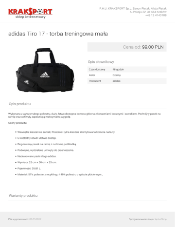 P.H.U. KRAKSPORT Sp.J. Zenon Piętak, Alicja Piętak Al.Pokoju 32, 31-564 Kraków +48 12 4140108 adidas Tiro 17 - torba treningowa mała Cena od: 99,00 PLN Opis słownikowy Czas dostawy 48 godzin Kolor Czarny Producent adidas Opis produktu Wykonana z wytrzymałego poliestru, duży, łatwo dostępna komora główna z kieszeniami bocznymi i suwakiem. Podwójny pasek na ramię oraz uchwyty zapewniają maksymalną wygodę. Cechy produktu: Wewnątrz kieszeń na zamek; Przednie i tylna kieszeń; Wentylowana komora na buty. U-kształtny otwór ułatwia dostęp. Regulowany pasek na ramię z ruchomą podkładką. Podwójne, wyściełane uchwyty do przenoszenia. Nadrukowane paski i logo adidas. Wymiary: 25 cm x 50 cm x 25 cm. Pojemność: 35.81 L. Materiał: 51% poliester z recyklingu / 49% poliestru o splocie płóciennym., Warianty produktu Plik wygenerowano: 07-03-2017 Oprogramowanie sklepu: AptusShop P.H.U. KRAKSPORT Sp.J. Zenon Piętak, Alicja Piętak Al.Pokoju 32, 31-564 Kraków +48 12 4140108 S 99,00 PLN Galeria Plik wygenerowano: 07-03-2017 Powered by TCPDF (www.tcpdf.org) Oprogramowanie sklepu: AptusShop