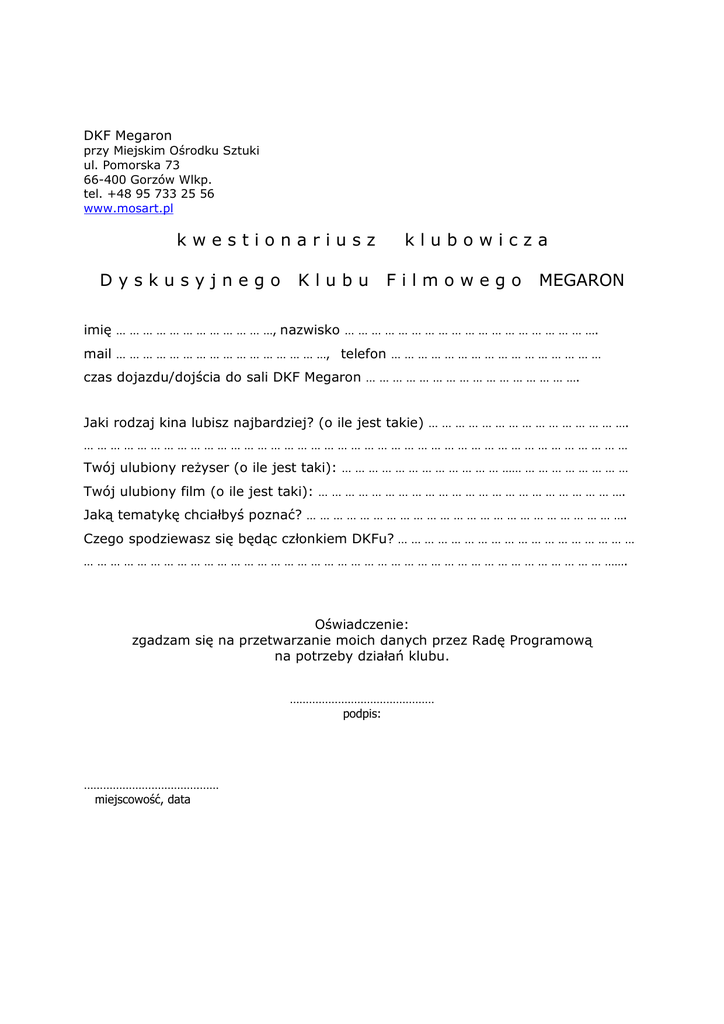 DKF Megaron przy Miejskim Ośrodku Sztuki ul. Pomorska 73 66-400 Gorzów Wlkp. tel. +48 95 733 25 56 www.mosart.pl kwestionariusz Dyskusyjnego Klubu klubowicza Filmowego MEGARON imię … … … … … … … … … … … …, nazwisko … … … … … … … … … … … … … … … … … … …. mail … … … … … … … … … … … … … … … …, telefon … … … … … … … … … … … … … … … … czas dojazdu/dojścia do sali DKF Megaron … … … … … … … … … … … … … … … …. Jaki rodzaj kina lubisz najbardziej? (o ile jest takie) … … … … … … … … … … … … … … …. …………………………………………………………………………………………………………… Twój ulubiony reżyser (o ile jest taki): … … … … … … … … … … … … …… … … … … … … … … Twój ulubiony film (o ile jest taki): … … … … … … … … … … … … … … … … … … … … … … …. Jaką tematykę chciałbyś poznać? … … … … … … … … … … … … … … … … … … … … … … … …. Czego spodziewasz się będąc członkiem DKFu? … … … … … … … … … … … … … … … … … … … … … … … … … … … … … … … … … … … … … … … … … … … … … … … … … … … … … … … … … ……. Oświadczenie: zgadzam się na przetwarzanie moich danych przez Radę Programową na potrzeby działań klubu. ……………………………………… podpis: …………………………………… miejscowość, data Jak zostać klubowiczem: 1. 2. 3. 4. trzeba trzeba trzeba trzeba chcieć się do nas zgłosić uzupełnić kwestionariusz wydać 6 zł na legitymacje klubowicza Co daje przynależność do DKFu: 1. 2. 3. 4. 5. niezapomniane wrażenia filmowe możliwość poszerzania wiedzy doborowe towarzystwo i bezstresową atmosferę wymianę poglądów nie tylko na tematy filmowe raz w miesiącu – darmowy wstęp na seans klubowy Jakie są obowiązki DKFowicza: 1. udział w spotkaniach DKFu (prelekcja+projekcja+dyskusja). Nikogo nie zmuszamy do zabierania głosu. Już po pierwszym spotkaniu wszyscy robią to dobrowolnie ☺ 2. promocja działań klubu 3. pomoc przy organizacji przedsięwzięć DKFu ponadto dla członków, którzy wykażą się szczególną aktywnością i uzyskają pozytywną opinię Rady Programowej: 1. wstęp wolny na pokazy w DKFie, 2. wstęp wolny na pokazy zamknięte wraz z osobą towarzyszącą 3. zniżka na akredytację na Letnią Akademię Filmową w Zwierzyńcu UWAGA !!! Członkostwo nie jest dożywotnie. Bierni członkowie będą skreślani z listy DKFowiczów.