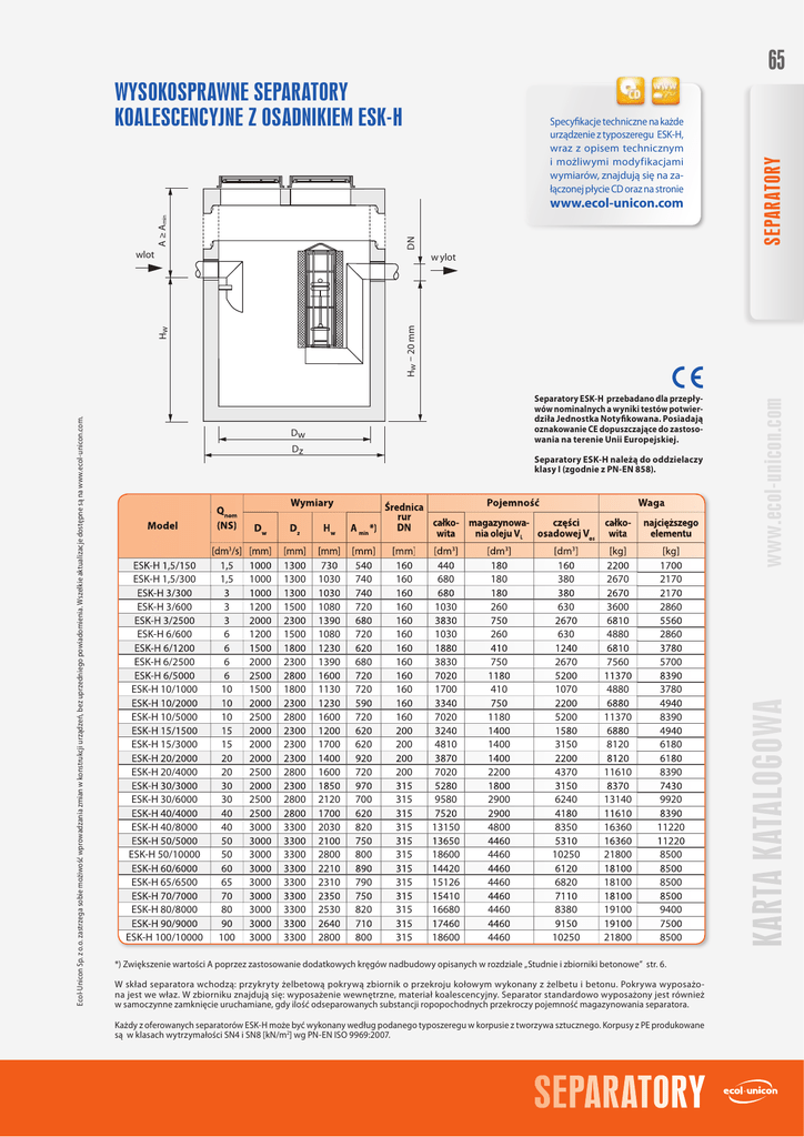 Specyfikacje techniczne na każde urządzenie z typoszeregu ESK-H, wraz z opisem technicznym i możliwymi modyfikacjami wymiarów, znajdują się na załączonej płycie CD oraz na stronie DN A ≥ Amin www.ecol-unicon.com wlot Ecol-Unicon Sp. z o.o. zastrzega sobie możiwość wprowadzania zmian w konstrukcji urządzeń, bez uprzedniego powiadomienia. Wszelkie aktualizacje dostępne są na www.ecol-unicon.com. Hw Hw – 20 mm w ylot Separatory ESK-H przebadano dla przepływów nominalnych a wyniki testów potwierdziła Jednostka Notyfikowana. Posiadają oznakowanie CE dopuszczające do zastosowania na terenie Unii Europejskiej. Dw Dz Separatory ESK-H należą do oddzielaczy klasy I (zgodnie z PN-EN 858). Wymiary Model Qnom (NS) Dw Dz Hw ESK-H 1,5/150 ESK-H 1,5/300 ESK-H 3/300 ESK-H 3/600 ESK-H 3/2500 ESK-H 6/600 ESK-H 6/1200 ESK-H 6/2500 ESK-H 6/5000 ESK-H 10/1000 ESK-H 10/2000 ESK-H 10/5000 ESK-H 15/1500 ESK-H 15/3000 ESK-H 20/2000 ESK-H 20/4000 ESK-H 30/3000 ESK-H 30/6000 ESK-H 40/4000 ESK-H 40/8000 ESK-H 50/5000 ESK-H 50/10000 ESK-H 60/6000 ESK-H 65/6500 ESK-H 70/7000 ESK-H 80/8000 ESK-H 90/9000 ESK-H 100/10000 [dm3/s] 1,5 1,5 3 3 3 6 6 6 6 10 10 10 15 15 20 20 30 30 40 40 50 50 60 65 70 80 90 100 [mm] 1000 1000 1000 1200 2000 1200 1500 2000 2500 1500 2000 2500 2000 2000 2000 2500 2000 2500 2500 3000 3000 3000 3000 3000 3000 3000 3000 3000 [mm] 1300 1300 1300 1500 2300 1500 1800 2300 2800 1800 2300 2800 2300 2300 2300 2800 2300 2800 2800 3300 3300 3300 3300 3300 3300 3300 3300 3300 [mm] 730 1030 1030 1080 1390 1080 1230 1390 1600 1130 1230 1600 1200 1700 1400 1600 1850 2120 1700 2030 2100 2800 2210 2310 2350 2530 2640 2800 Pojemność Waga Średnica rur części całko- najcięższego A min *) DNmax całko- magazynowawita nia oleju VL osadowej Vos wita elementu [mm] 540 740 740 720 680 720 620 680 720 720 590 720 620 620 920 720 970 700 620 820 750 800 890 790 750 820 710 800 [mm] 160 160 160 160 160 160 160 160 160 160 160 160 200 200 200 200 315 315 315 315 315 315 315 315 315 315 315 315 [dm3] 440 680 680 1030 3830 1030 1880 3830 7020 1700 3340 7020 3240 4810 3870 7020 5280 9580 7520 13150 13650 18600 14420 15126 15410 16680 17460 18600 [dm3] 180 180 180 260 750 260 410 750 1180 410 750 1180 1400 1400 1400 2200 1800 2900 2900 4800 4460 4460 4460 4460 4460 4460 4460 4460 [dm3] 160 380 380 630 2670 630 1240 2670 5200 1070 2200 5200 1580 3150 2200 4370 3150 6240 4180 8350 5310 10250 6120 6820 7110 8380 9150 10250 [kg] 2200 2670 2670 3600 6810 4880 6810 7560 11370 4880 6880 11370 6880 8120 8120 11610 8370 13140 11610 16360 16360 21800 18100 18100 18100 19100 19100 21800 [kg] 1700 2170 2170 2860 5560 2860 3780 5700 8390 3780 4940 8390 4940 6180 6180 8390 7430 9920 8390 11220 11220 8500 8500 8500 8500 9400 7500 8500 *) Zwiększenie wartości A poprzez zastosowanie dodatkowych kręgów nadbudowy opisanych w rozdziale „Studnie i zbiorniki betonowe” str. 6. W skład separatora wchodzą: przykryty żelbetową pokrywą zbiornik o przekroju kołowym wykonany z żelbetu i betonu. Pokrywa wyposażona jest we właz. W zbiorniku znajdują się: wyposażenie wewnętrzne, materiał koalescencyjny. Separator standardowo wyposażony jest również w samoczynne zamknięcie uruchamiane, gdy ilość odseparowanych substancji ropopochodnych przekroczy pojemność magazynowania separatora. Każdy z oferowanych separatorów ESK-H może być wykonany według podanego typoszeregu w korpusie z tworzywa sztucznego. Korpusy z PE produkowane są w klasach wytrzymałości SN4 i SN8 [kN/m2] wg PN-EN ISO 9969:2007.