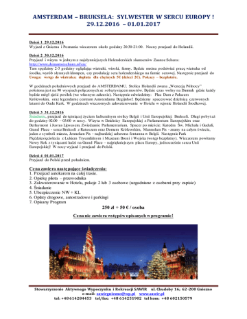 AMSTERDAM – BRUKSELA: SYLWESTER W SERCU EUROPY ! 29.12.2016 – 01.01.2017 Dzień 1 29.12.2016 Wyjazd z Gniezna i Poznania wieczorem około godziny 20:30-21:00. Nocny przejazd do Holandii. Dzień 2 30.12.2016 Przyjazd i wizyta w jednym z najsłynniejszych Holenderskich skansenów Zaanse Schans: http://www.dezaanseschans.nl/en/ Tam spędzimy 2-3 godziny oglądając wiatraki, wioski, farmy. Będzie można podziwiać pracę wiatraka od środka, wyrób słynnych klompen, czy produkcję sera holenderskiego na farmie serowej. Następnie przejazd do Uwaga: wstęp do wiatraka: dopłata dla chętnych 5€ (dzieci 2€). Pokazy – bezpłatnie. W godzinach południowych przejazd do AMSTERDAMU. Stolica Holandii zwana „Wenecją Północy” położona jest na 90 wyspach połączonych ze sobą tysiącem mostów. Będzie czas wolny na Damrak gdzie każdy będzie mógł zjeść posiłek (we własnym zakresie). Następnie odwiedzimy: Plac Dam z Pałacem Królewskim, oraz legendarne centrum Amsterdamu Begijnhof. Będziemy spacerować dzielnicą czerwonych latarni do Oude Kerk. W godzinach wieczornych zakwaterowanie w Hotelu w rejonie Holandii Środkowej. Dzień 3 31.12.2016 Śniadanie, przejazd do tętniącej życiem kulturalnym stolicy Belgii i Unii Europejskiej: Brukseli. Długi pobyt aż do godziny 02:00 – 03:00 w nocy. Wizyta w Dzielnicy Europejskiej z Parlamentem Europejskim oraz Berlaymont i Justus Lipsusem. Zwiedzanie Parlamentarium. Spacer po mieście: Katedra Św. Michała i Guduli, Grand Place - serce Brukseli z Ratuszem oraz Domem Królewskim, Manneken Pis - znany na całym świecie, jeden z symboli miasta, Jenneken Pis - najbardziej zabawna fontanna w Belgii. Następnie Park Pięćdziesięciolecia z Łukiem Tryumfalnym i Muzeum Broni i Wojska (wstęp bezpłatny). Wieczorem powitamy Nowy Rok z tysiącami ludzi na Grand Place – najpiękniejszym placu Europy, jednocześnie sercu Unii Europejskiej! W nocy wyjazd i przejazd do Polski. Dzień 4 01.01.2017 Przyjazd do Polski przed południem. Cena zawiera następujące świadczenia: 1. Przejazd autokarem na całej trasie. 2. Opiekę pilota – przewodnika 3. Zakwaterowanie w Hotelu, pokoje 2 lub 3 osobowe (uzgadniane z osobami przy zapisie) 4. Śniadanie 5. Ubezpieczenie NW + KL 6. Opłaty drogowe, autostradowe i parkingi 7. Opisany Program 250 zł + 50 € / osoba Cena nie zawiera wstępów opisanych w programie! Stowarzyszenie Aktywnego Wypoczynku i Rekreacji SAWIR ul. Chudoby 16; 62 -200 Gniezno e-mail: [email protected] www.sawir.pl tel: +48 614284453 tel/fax: +48 614251902 tel kom: +48 602150579