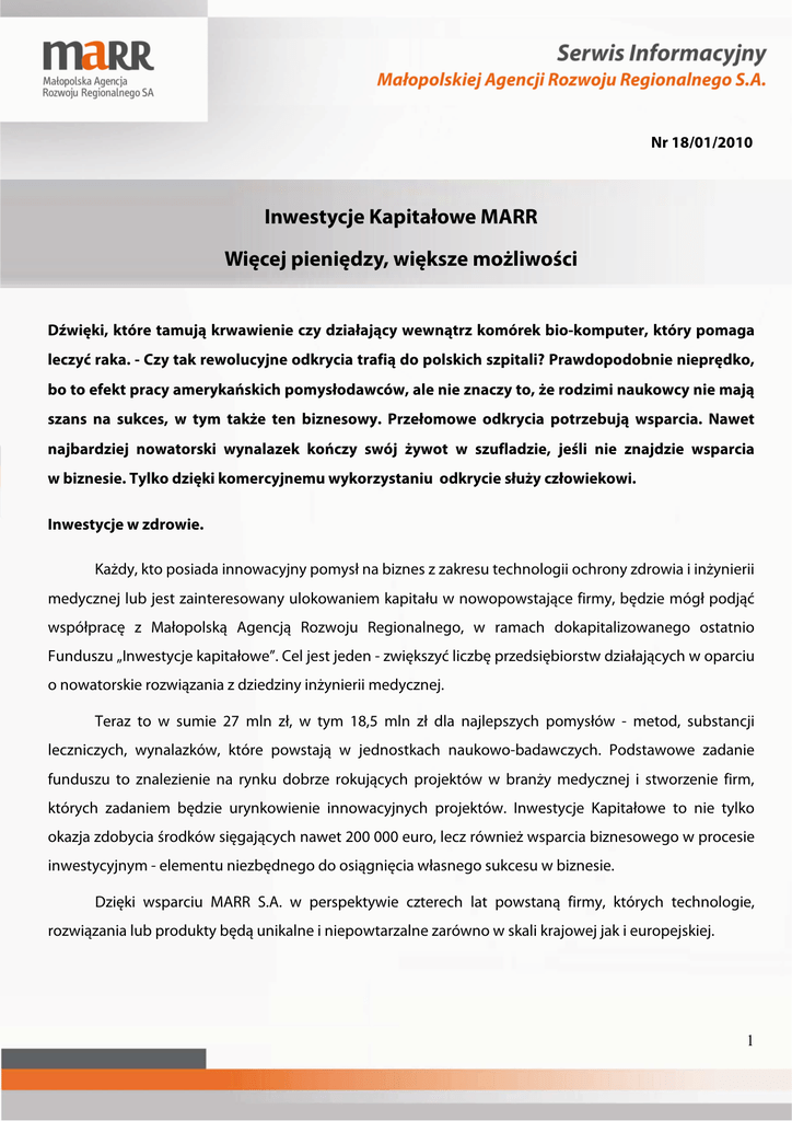 Nr 18/01/2010 Inwestycje Kapitałowe MARR Więcej pieniędzy, większe możliwości Dźwięki, które tamują krwawienie czy działający wewnątrz komórek bio-komputer, który pomaga leczyć raka. - Czy tak rewolucyjne odkrycia trafią do polskich szpitali? Prawdopodobnie nieprędko, bo to efekt pracy amerykańskich pomysłodawców, ale nie znaczy to, że rodzimi naukowcy nie mają szans na sukces, w tym także ten biznesowy. Przełomowe odkrycia potrzebują wsparcia. Nawet najbardziej nowatorski wynalazek kończy swój żywot w szufladzie, jeśli nie znajdzie wsparcia w biznesie. Tylko dzięki komercyjnemu wykorzystaniu odkrycie służy człowiekowi. Inwestycje w zdrowie. Każdy, kto posiada innowacyjny pomysł na biznes z zakresu technologii ochrony zdrowia i inżynierii medycznej lub jest zainteresowany ulokowaniem kapitału w nowopowstające firmy, będzie mógł podjąć współpracę z Małopolską Agencją Rozwoju Regionalnego, w ramach dokapitalizowanego ostatnio Funduszu „Inwestycje kapitałowe”. Cel jest jeden - zwiększyć liczbę przedsiębiorstw działających w oparciu o nowatorskie rozwiązania z dziedziny inżynierii medycznej. Teraz to w sumie 27 mln zł, w tym 18,5 mln zł dla najlepszych pomysłów - metod, substancji leczniczych, wynalazków, które powstają w jednostkach naukowo-badawczych. Podstawowe zadanie funduszu to znalezienie na rynku dobrze rokujących projektów w branży medycznej i stworzenie firm, których zadaniem będzie urynkowienie innowacyjnych projektów. Inwestycje Kapitałowe to nie tylko okazja zdobycia środków sięgających nawet 200 000 euro, lecz również wsparcia biznesowego w procesie inwestycyjnym - elementu niezbędnego do osiągnięcia własnego sukcesu w biznesie. Dzięki wsparciu MARR S.A. w perspektywie czterech lat powstaną firmy, których technologie, rozwiązania lub produkty będą unikalne i niepowtarzalne zarówno w skali krajowej jak i europejskiej. 1 Fundusz „Inwestycje Kapitałowe” Działający w MARR S.A. fundusz „Inwestycje Kapitałowe” od początku swojego istnienia cieszy się niesłabnącym zainteresowaniem ze strony podmiotów przedstawiających swój pomysł na biznes w oparciu o innowacyjne rozwiązania. Chęć urynkowienia swoich wynalazków zgłosiło dotychczas blisko stu pomysłodawców. Do realizacji zarejestrowano kilkadziesiąt projektów. Projekty związane są między innymi z branżami IT, chemiczną i ochroną środowiska. Kim są pomysłodawcy? To zarówno osoby zajmujące się nauką i teoretycznymi podstawami przyszłego biznesu, czyli naukowcy, pracownicy akademiccy, pracownicy jednostek badawczorozwojowych czy wynalazcy jak i osoby mające doświadczenie praktyczne w kierowaniu biznesem – przedsiębiorcy, specjaliści branżowi i kadra menadżerska. Zdarzają się również osoby, które w momencie składania formularza zgłoszeniowego pozostawały bez pracy. Obecnie na etapie bardziej zaawansowanych prac i analiz jest kilkanaście projektów, z czego przewiduje się, iż w tym roku w wyniku zrealizowania dla części z nich procesu preinkubacji i procesu wejścia kapitałowego - uruchomione zostaną 4 spółki portfelowe funduszu. Dlaczego MARR ? Dla Funduszu Kapitałowego MARR S.A. liczy się przede wszystkim pomysł oraz wartości, jakie niesie za sobą dane innowacyjne rozwiązanie. Nasza rynkowa przewaga wynika również z możliwości form wsparcia w zakresie prac badawczych, analiz czy też audytów technologicznych, jakimi możemy wspomóc przyszłego innowacyjnego przedsiębiorcę. MARR S.A. jako doświadczony partner w biznesie daje gwarancję wiarygodności i rzetelności całego przedsięwzięcia. Gruntowna weryfikacja ofert, zarówno od strony technicznej jak i finansowej, dają pewność stabilności projektowej oraz szansę na zyski przy bezpieczeństwie inwestowanych środków. Uruchomienie przez MARR S.A. kolejnego funduszu kapitałowego wysokiego ryzyka to realna szansa na zwiększenie poziomu innowacyjności i konkurencyjności firm w branży medycznej. Należy podkreślić, iż w perspektywie długoterminowej nowa forma wsparcia przedsiębiorstw, jaką są fundusze kapitałowe na stałe wpisze się w ofertę finansową MARR S.A. 2 Jak to działa? Etap I Pierwszy etap naboru to czas zgłaszania się pomysłodawców, posiadających innowacyjne koncepcje uruchomienia własnego biznesu wykorzystującego technologie ochrony zdrowia i inżynierii medycznej. Wybrane pomysły przejdą do drugiego etapu naboru, czyli wspólnej z MARR pracy nad całościowym opracowaniem analiz ekonomicznych, technologicznych oraz kompletnych biznesplanów wybranych projektów. Etap II W czasie trwania tego etapu specjaliści MARR udzielą pomysłodawcom doradztwa zarówno ekonomicznego, jak i technologicznego czy też prawnego koniecznego do stworzenia modelu biznesowego stanowiącego wstęp do zrealizowania ich pomysłów. Proces preinkubacji oznaczać będzie również możliwość wprowadzenia zmian i ulepszeń w technologiach i projektach, a jego uczestnicy będą mogli wziąć udział w organizowanych przez MARR szkoleniach, warsztatach i seminariach, które dostarczą im wiedzę potrzebną do rozpoczęcia własnej działalności. Stwierdzenie, że dany uczestnik jest już gotowy do rozpoczęcia własnego biznesu, skutkować będzie zakończeniem etapu preinkubacji, którego zwieńczeniem będzie wycena technologii, know-how oraz innowacyjnego rozwiązania. Etap III Ostatni etap to dla każdego z uczestników pierwszy krok na drodze do wprowadzenia własnych pomysłów w życie, a tym samym osiągnięcia sukcesu w biznesie. W tej części projektu dla najlepiej ocenionych pomysłów założone zostaną spółki, które od tego momentu zaczną działać w pełni samodzielnie, dysponując własnym kapitałem. MARR będzie posiadał w nich udziały nieprzekraczające wartości 200 tysięcy euro. Agencja po osiągnięciu przez nowo powstałą firmę dojrzałości biznesowej wycofa swoje 