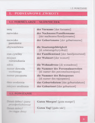 1.2. POWITANIE 1. PODSTAWOWE ZWROTY 1.1. FORMULARZE - SŁOWNICZEK imię nazwisko nazwisko panieńskie obywatelstwo stan cywilny miejsce zamieszkania adres numer dowodu osobistego numer paszportu data urodzenia miejsce urodzenia der Vorname [der fomame] der Nachname/Familienname [der nachname/familjenname] der Geburtsname [der geburtsname] die Staatsangehorigkeit [di sztatsangehyryśkajt] der Familienstand [der familjensztand] der Wohnort [der wonort] die Wohnadresse [di wonadrese] die Numraer des Personalausweises [di numer des perzonalauswajzes] die Nummer des Reisepasses [di numer des rajzepases] das Geburtsdatum [das geburtsdatum] der Geburtsort [der geburtsort] 1 2. POWITANIE Dziem dobry! (pora przedpołudniowa) Daram dobry! w t hjgu dnia) Guten Morgen! [gutn morgn!] Guten Tag! [gutn tak!] 1. PODSTAWOWE ZWROTY Dzień dobry! (wpo łudniowej części Niemiec iw Austrii) GriiB Gott! [grys got!] Cześć! Hallo! [halo!] Cześć! (wpołudnio wej części Niemiec i w Austrii) Servus!/Grufi dich! [serwus!/grys dyś!] 1.3. POŻEGNANIE Do widzenia! Cześć! (tylko na pożegnanie) Dobranoc! Na razie! Auf Wiedersehen! [auf widerzejn!] TschiiB! [czys!] Gute Nacht! [gute nacht!] Bis bald!/Bis nachher! [bys bald!/bys nachher!] 1.4. NAJPOTRZEBNIEJSZE ZWROTY Proszę! Bitte! [byte!] Dziękuję! Danke! [danke!] Tak Ja [ja] Nie Nein [najn] Przykro mi. Es tut mir Leid. [es tut mir lajd] Słucham? Wie bitte? [wi byte?] 10 1.6. PRÓBY POROZUMIEWANIA SIĘ Jak pani leci? Jak ci leci? Z przyjemnością Zgoda Szkoda Wie geht es Ihnen? [wi gejt es inen?] Wie geht es dir? [wi gejt es dir?] Mit Vergniigen [myt fergnygen] Abgemacht [abgemacht] Schade [szade] 1.5. PODSTAWOWE PYTANIA Kto? Co? Kiedy? Jak długo? Dokąd? Gdzie? Od kiedy? Jak? Dlaczego? Wer? [wer?] Was? [was?] Wann? [wan?] Wie lange? [wi lange?] Wohin? [wohin?] Wo? [wo?] Seit wann? [zajt wan?] Wie? [wi?] Warum? [warum?] 1.6. PRÓBY POROZUMIEWANIA SIĘ Nie mówię dobrze po niemiecku. Nie rozumiem pani. Proszę mówić wolno! Ich spreche nicht gut Deutsch. [yś szpresie nyśt gut dojcz] Ich verstehe Sie nicht. [yś ferszteje zi nyśt] Sprechen Sie bitte langsam! [szprechen zi byte langzam!] 1. PODSTAWOWE ZWROTY Proszę mówić wyraźnie! Proszę to jeszcze raz powtórzyć! Czy mówi pan po angielsku? - po francusku? - po hiszpańsku? - po włosku? - po rosyjsku? Czy rozumie pan po angielsku? Czy może pan przeliterować swoje nazwisko? Przeliteruję swoje nazwisko. Sprechen Sie bitte deutlich! [szprechen zi byte dojtlyś] Wiederholen Sie das bitte noch einmal! [widerholen zi das byte noch ajnmal] Sprechen Sie Englisch? [szprechen zi englysz?] - Franzósisch? [francyzysz?] - Spanisch? [szpanysz?] - Italienisch? [italjenysz?] - Russisch? [rusysz?] Verstehen Sie Englisch? [fersztejen zi englysz?] Konnen Sie Ihren Namen buchstabieren? [kynen zi iren namen buchsztabiren?] Ich buchstabiere meinen Namen. [yś buchsztabire majnen namen] 1.7. ZWROTY GRZECZNOŚCIOWE Proszę! Dziękuję! Przepraszam! Słucham? Moment, proszę! Proszę poczekać! Z przyjemnością! Bitte! [byte!] Danke! [danke!] Verzeihung! [ferzajung!] Wie bitte? [wi byte?] Einen Augenblick, bitte! [ajnen augenblik, byte!] Warten Sie bitte! [warten zi byte!] Mit Yergniigen! [myt fergnygen!] 1.7. ZWROTY GRZECZNOŚCIOWE Proszę, z miłą chęcią. Jak panu leci? Jak leci? Czy mogę pana o coś zapytać? Czy wie pan może ...? Czy mogę prosić pana o przysługę? Czy mógłbyś może ...? Wspaniale! Cieszę się. Uważam, że to świetne! Ten pomysł mi się podoba! To szkoda. Przykro mi. To niespodzianka. No coś takiego! Jak mogę ...? -ik mam ...? Bitte, gern geschehen. [byte gem geszejen] Wie geht es Ihnen? [wi gejt es inen?] Wie geht es? [wi gejt es?] Darf ich Sie etwas fragen? [darf yś zi etwas fragen?] Wissen Sie vielleicht...? [wysen zi filajśt ...?] Kann ich Sie um einen Gefallen bitten? [kan yś zi um ajnen gefalen byten?] Kónntest du vielleicht...? [kyntest du filajśt...?] Ausgezeichnet! [ausgecajśnet] Ich freue mich. [yś froje myś] Das finde ich toll! [das finde yś tol!] Die Idee gefallt mir. [di idee gefelt mir] Das ist aber schade. [das yst aber szade] Es tut mir Leid. [es tut mir lajd] Das ist aber eine Uberraschung! [das yst ajne yber-raszung] Na so was! [na zo was!] Wie kann ich ...? [wi kan yś ...?] Wie soli ich ...? [wi zol yś ...?] 13