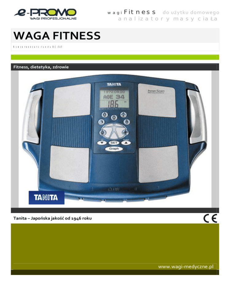 w ag i Fitness do u ytku domowego analizatory masy cia a WAGA FITNESS NUMER PRODUKTU: TANITA BC-545 Fitness, dietetyka, zdrowie Tanita – Japo ska jako od 1946 roku www.wagi-medyczne.pl w ag i Fitness do u ytku domowego analizatory masy cia a WAGA FITNESS NUMER PRODUKTU: TANITA BC-545 Opis produktu Analizator masy cia a do domowego u ytku polecany jest wszystkim osobom dbaj cym o utrzymanie swojego organizmu w dobrej kondycji, chc cych pozna pe ny obraz ich wewn trznego zdrowia. Jednocze nie informujemy i analizator nie jest przeznaczony do diagnozowania lub leczenia chorób i zaburze . Prosimy skonsultowa si z lekarzem w razie wszystkich pyta lub w tpliwo ci dotycz cych Pa stwa zdrowia. Osobom odchudzaj cym si analizator pozwoli na bie kontrol czy stosowana dieta jest odpowiednia i proces odchudzania przebiega prawid owo, czy nie nast puje niekorzystna zbyt gwa towna utrata tkanki mi niowej czy te wody w organizmie. Polecana równie dla osób aktywnych, chc cych prowadzi zdrowy tryb ycia, dbaj cych o adn sylwetk by na bie co mia y wp yw i wiadomo zdrowego rozwoju swojego cia a. Analizatory sk adu cia a daj Ci wgl d w kluczowe wska niki zdrowotne, które pozwol Ci na monitorowanie wp ywu zmian w stylu ycia: › Mo esz kontrolowa wp yw diety na Twoje cia o, aby upewni si czy dobra odpowiedni sposób ywienia dostosowany dla Ciebie. › Mo esz kontrolowa post py w przybieraniu na masie mi niowej, oraz sprawdza swój wiek metaboliczny. › Mo esz sprawdza ilo t uszczu trzewnego, który jest g ównym wska nikiem ryzyka wyst pienia cukrzycy typu 2 i chorób serca. › Mo esz obra sobie cel dla Twojej sylwetki i monitorowa post pów w tym kierunku. Specyfikacja: › Metoda pomiaru - BIA (bio-elektryczna analiza impedancji) – pomiar przez stopy i r ce › 8 elektrod umo liwiaj cych segmentowy odczyt analizy cia a › Maksymalna no no – 150 kg › Dok adno wa enia – 100g › Dok adno % - 0,1% Analiza cia a: › Masa cia a (kg) › Zawarto tkanki t uszczowej (%) › Masa mi niowa (kg) › Ca kowita zawarto wody w organizmie (%) › Zawarto wisceralnej tkanki t uszczowej › Masa ko ci (kg) › Wiek metaboliczny › Physique rating (niezale nie od spadku mi ni, ró nice w proporcji zawarto ci tkanki t uszczowej i mi niowej) › Podstawowa przemiana materii Dodatkowe odczyty dla poszczególnych fragmentów cia a: r k, nóg, tu owia › Zawarto tkanki t uszczowej (%) › Masa mi niowa (kg) Funkcje wagi: › Pami pomiarów dla 4 osób › Funkcja tylko waga – bez wykonania analizy ca a › Funkcja go – jednorazowe u ycie › Funkcja „atleta” › Data i godzina › Funkcja auto-off – automatyczne wy czenie wagi po 10-20 sekundach Dane techniczne: › Zasilanie bateryjne 4 baterie 1,5 V AA (baterie za czone w dostawie) › Pobór mocy 60mA maximum › Pr d 50kHz, 500µA › Graficzny wy wietlacz LCD – 32mm www.wagi-medyczne.pl ul. Bonarka 21, 30-415 Kraków, tel./fax: +48 12 263 73 27, e-mail: [email protected] Zastrzegamy sobie prawo do pomy ek i zmian technicznych. Karta Katalogowa: Data utworzenia 2012-08-24 18:15:00, aktualizacja: 2012-08-24, waga-Tanita-bc-545-karta-katalogowa w ag i Fitness do u ytku domowego analizatory masy cia a Jak to dzia a Jak to dzia a: Analizator sk adu cia a Tanita oblicza sk ad cia a za pomoc bioimpedancji elektrycznej (BIA). Bezpieczne, o niskim poziomie sygna y elektryczne przechodz przez cia o poprzez opatentowane elektrody Tanita znajduj ce si na platformie analizatora. Sygna z atwo ci przep ywa przez p yny w mi niach i innych tkankach cia a, lecz przechodz c przez tkank t uszczow napotyka opór, poniewa zawiera niewielkie ilo ci p ynów. Opór ten nazywa si impedancj . Odczyty impedancji s nast pnie wprowadzone do medycznie ustalonych formu matematycznych do obliczenia sk adu cia a. Kiedy najlepiej u ywa analizatora: Poziom wody w organizmie w sposób naturalny mo e ulega wahaniom w ci gu dnia i nocy. Wszelkie istotne zmiany w zawarto ci wody w ciele mog wp ywa na organizm. Cia o ma tendencj do dehydratacji po d ugiej nocy, wi c rano masa cia a b dzie ni sza, a procentowa zawarto t uszczu wy sza. Jedzenie du ych posi ków, picie alkoholu, menstruacja, choroba, k piel mo e równie powodowa zmiany w poziomie nawodnienia. Aby uzyska najbardziej wiarygodne odczyty zalecane jest wykonywanie pomiaru przed kolacj . Interpretacja wyników Czym jest procentowa zawarto t uszczu: Procentowa zawarto tkanki t uszczowej w organizmie ustalana jest w stosunku do masy cia a. Ograniczenie poziomu uszczu w organizmie wykaza o, zmniejszenie ryzyka wyst pienia pewnych schorze , takich jak wysokie ci nienie krwi, choroby serca, cukrzycy i nowotwory. Poni szy wykres pokazuje wahanie w tkance t uszczowej. Analizator Sk adu Cia a automatycznie porównuje zawarto uszczu w organizmie do prawid owej zawarto ci na wykresie. Gdy warto zostanie obliczona, czarny pasek zacznie miga w dolnej cz ci ekranu, wskazuj c, gdzie mie ci si zakres dla danego wieku i p ci. www.wagi-medyczne.pl ul. Bonarka 21, 30-415 Kraków, tel./fax: +48 12 263 73 27, e-mail: [email protected] Zastrzegamy sobie prawo do pomy ek i zmian technicznych. Karta Katalogowa: Data utworzenia 2012-08-24 18:15:00, aktualizacja: 2012-08-24, waga-Tanita-bc-545-karta-katalogowa w ag i Fitness do u ytku domowego analizatory masy cia a Czym jest procentowa zawarto wody w ciele: Woda odgrywa istotn rol w wielu procesach organizmu i wyst puje w ka dej komórce, tkance i narz dzie. Utrzymanie zdrowego poziomu wody zapewnia efektywne funkcjonowanie organizmu i zmniejsza ryzyko wyst pienia problemów zdrowotnych z tym zwi zanych. Poziom wody w organizmie mo e naturalnie zmienia si przez ca y dzie i ca noc. Cia o ma tendencj do dehydratacji po d ugiej nocy st d ró nice w p ynie mi dzy dniem i noc . Jedzenie du ych posi ków, picie alkoholu, menstruacja, choroba, k piel mog tak e powodowa ró nice w poziomie nawodnienia. rednia procentowa zawarto doros ego wynosi: wody dla zdrowego Kobieta: 45 do 60% czyzna: od 50 do 65% ród 