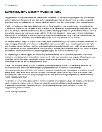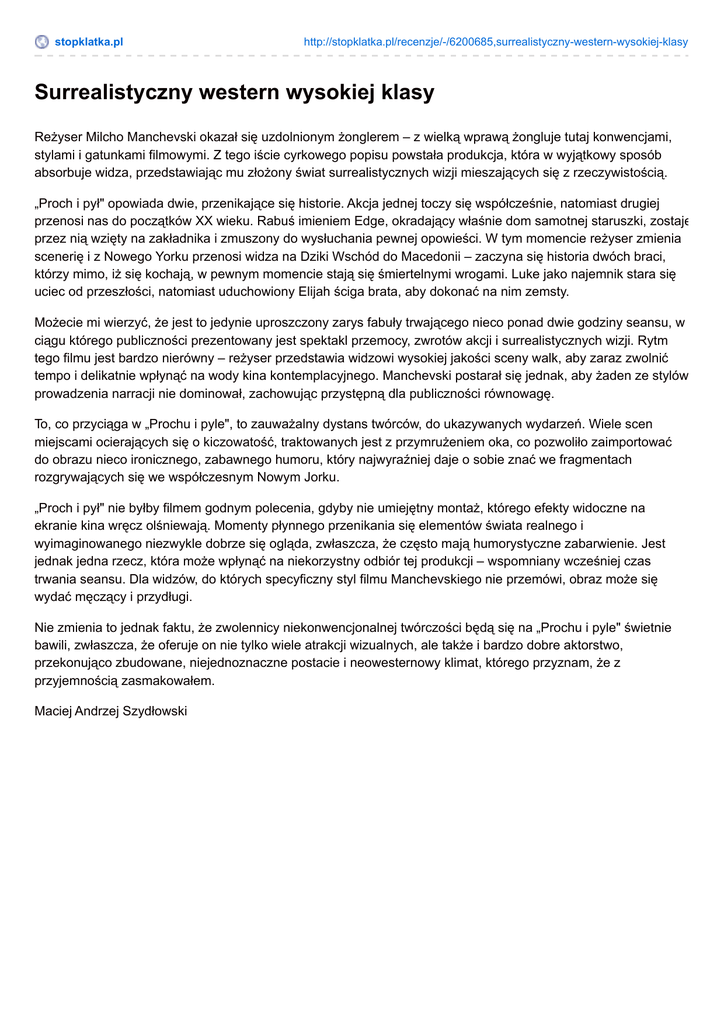 stopklatka.pl http://stopklatka.pl/recenzje/-/6200685,surrealistyczny-western-wysokiej-klasy Surrealistyczny western wysokiej klasy Reżyser Milcho Manchevski okazał się uzdolnionym żonglerem – z wielką wprawą żongluje tutaj konwencjami, stylami i gatunkami filmowymi. Z tego iście cyrkowego popisu powstała produkcja, która w wyjątkowy sposób absorbuje widza, przedstawiając mu złożony świat surrealistycznych wizji mieszających się z rzeczywistością. „Proch i pył" opowiada dwie, przenikające się historie. Akcja jednej toczy się współcześnie, natomiast drugiej przenosi nas do początków XX wieku. Rabuś imieniem Edge, okradający właśnie dom samotnej staruszki, zostaje przez nią wzięty na zakładnika i zmuszony do wysłuchania pewnej opowieści. W tym momencie reżyser zmienia scenerię i z Nowego Yorku przenosi widza na Dziki Wschód do Macedonii – zaczyna się historia dwóch braci, którzy mimo, iż się kochają, w pewnym momencie stają się śmiertelnymi wrogami. Luke jako najemnik stara się uciec od przeszłości, natomiast uduchowiony Elijah ściga brata, aby dokonać na nim zemsty. Możecie mi wierzyć, że jest to jedynie uproszczony zarys fabuły trwającego nieco ponad dwie godziny seansu, w ciągu którego publiczności prezentowany jest spektakl przemocy, zwrotów akcji i surrealistycznych wizji. Rytm tego filmu jest bardzo nierówny – reżyser przedstawia widzowi wysokiej jakości sceny walk, aby zaraz zwolnić tempo i delikatnie wpłynąć na wody kina kontemplacyjnego. Manchevski postarał się jednak, aby żaden ze stylów prowadzenia narracji nie dominował, zachowując przystępną dla publiczności równowagę. To, co przyciąga w „Prochu i pyle", to zauważalny dystans twórców, do ukazywanych wydarzeń. Wiele scen miejscami ocierających się o kiczowatość, traktowanych jest z przymrużeniem oka, co pozwoliło zaimportować do obrazu nieco ironicznego, zabawnego humoru, który najwyraźniej daje o sobie znać we fragmentach rozgrywających się we współczesnym Nowym Jorku. „Proch i pył" nie byłby filmem godnym polecenia, gdyby nie umiejętny montaż, którego efekty widoczne na ekranie kina wręcz olśniewają. Momenty płynnego przenikania się elementów świata realnego i wyimaginowanego niezwykle dobrze się ogląda, zwłaszcza, że często mają humorystyczne zabarwienie. Jest jednak jedna rzecz, która może wpłynąć na niekorzystny odbiór tej produkcji – wspomniany wcześniej czas trwania seansu. Dla widzów, do których specyficzny styl filmu Manchevskiego nie przemówi, obraz może się wydać męczący i przydługi. Nie zmienia to jednak faktu, że zwolennicy niekonwencjonalnej twórczości będą się na „Prochu i pyle" świetnie bawili, zwłaszcza, że oferuje on nie tylko wiele atrakcji wizualnych, ale także i bardzo dobre aktorstwo, przekonująco zbudowane, niejednoznaczne postacie i neowesternowy klimat, którego przyznam, że z przyjemnością zasmakowałem. Maciej Andrzej Szydłowski
