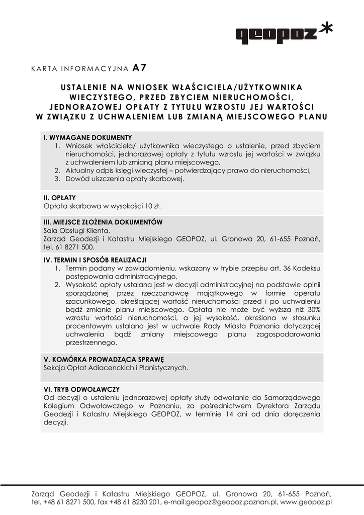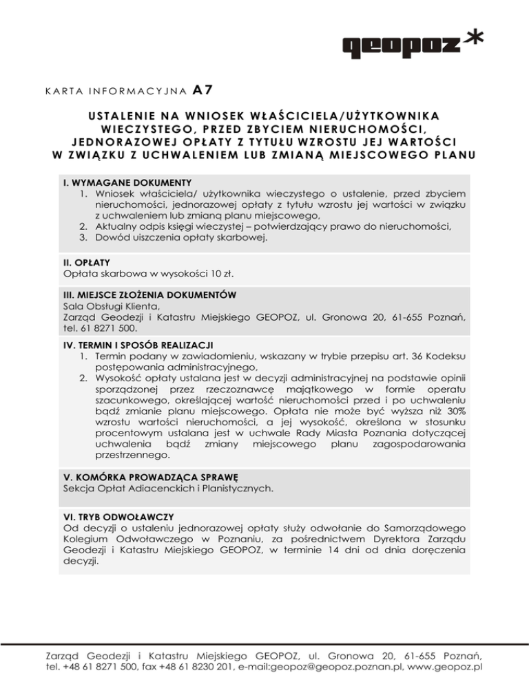 KARTA INFORMACYJNA A7 USTALENIE NA WNIOSEK WŁAŚCICIELA/UśYTKOWNIKA WIECZYSTEGO, PRZED ZBYCIEM NIERUCHOMOŚCI, JEDNORAZOWEJ OPŁATY Z TYTUŁU WZROSTU JEJ WARTOŚCI W ZWIĄZKU Z UCHWALENIEM LUB ZMIANĄ MIEJSCOWEGO PLANU I. WYMAGANE DOKUMENTY 1. Wniosek właściciela/ uŜytkownika wieczystego o ustalenie, przed zbyciem nieruchomości, jednorazowej opłaty z tytułu wzrostu jej wartości w związku z uchwaleniem lub zmianą planu miejscowego, 2. Aktualny odpis księgi wieczystej – potwierdzający prawo do nieruchomości, 3. Dowód uiszczenia opłaty skarbowej. II. OPŁATY Opłata skarbowa w wysokości 10 zł. III. MIEJSCE ZŁOśENIA DOKUMENTÓW Sala Obsługi Klienta, Zarząd Geodezji i Katastru Miejskiego GEOPOZ, ul. Gronowa 20, 61-655 Poznań, tel. 61 8271 500. IV. TERMIN I SPOSÓB REALIZACJI 1. Termin podany w zawiadomieniu, wskazany w trybie przepisu art. 36 Kodeksu postępowania administracyjnego, 2. Wysokość opłaty ustalana jest w decyzji administracyjnej na podstawie opinii sporządzonej przez rzeczoznawcę majątkowego w formie operatu szacunkowego, określającej wartość nieruchomości przed i po uchwaleniu bądź zmianie planu miejscowego. Opłata nie moŜe być wyŜsza niŜ 30% wzrostu wartości nieruchomości, a jej wysokość, określona w stosunku procentowym ustalana jest w uchwale Rady Miasta Poznania dotyczącej uchwalenia bądź zmiany miejscowego planu zagospodarowania przestrzennego. V. KOMÓRKA PROWADZĄCA SPRAWĘ Sekcja Opłat Adiacenckich i Planistycznych. VI. TRYB ODWOŁAWCZY Od decyzji o ustaleniu jednorazowej opłaty słuŜy odwołanie do Samorządowego Kolegium Odwoławczego w Poznaniu, za pośrednictwem Dyrektora Zarządu Geodezji i Katastru Miejskiego GEOPOZ, w terminie 14 dni od dnia doręczenia decyzji. VII. PODSTAWA PRAWNA 1. Ustawa z dnia 27 marca 2003r. o planowaniu i zagospodarowaniu przestrzennym (Dz.U. z 2003r., Nr 80, poz. 717 z późn. zm.), 2. Uchwała nr XXXII/177/91 Rady Miejskiej Poznania z dnia 25.06.1991r. w sprawie przekształcenia Poznańskiego Przedsiębiorstwa Geodezyjno-Kartograficznego GEOPOZ w Zarząd Geodezji i Katastru Miejskiego GEOPOZ z późn. zm., 3. Uchwały Rady Miasta Poznania w sprawie uchwalenia lub zmiany miejscowego planu zagospodarowania przestrzennego dla danego terenu.