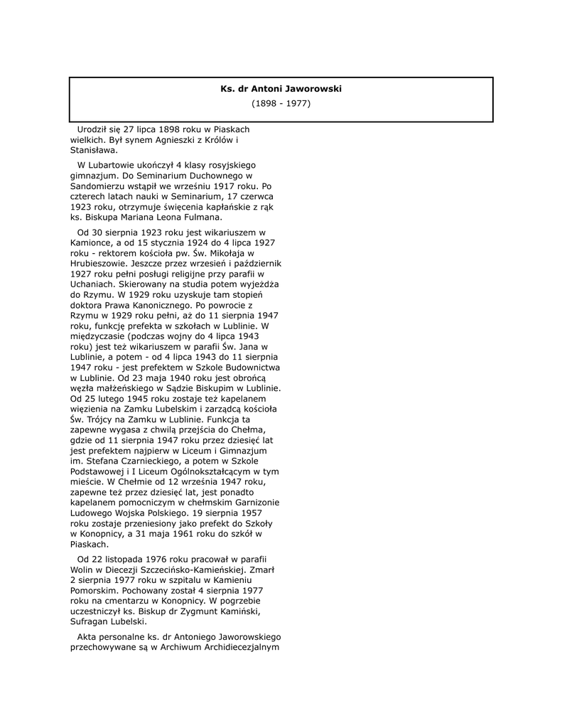 Ks. dr Antoni Jaworowski (1898 - 1977) Urodził się 27 lipca 1898 roku w Piaskach wielkich. Był synem Agnieszki z Królów i Stanisława. W Lubartowie ukończył 4 klasy rosyjskiego gimnazjum. Do Seminarium Duchownego w Sandomierzu wstąpił we wrześniu 1917 roku. Po czterech latach nauki w Seminarium, 17 czerwca 1923 roku, otrzymuje święcenia kapłańskie z rąk ks. Biskupa Mariana Leona Fulmana. Od 30 sierpnia 1923 roku jest wikariuszem w Kamionce, a od 15 stycznia 1924 do 4 lipca 1927 roku - rektorem kościoła pw. Św. Mikołaja w Hrubieszowie. Jeszcze przez wrzesień i październik 1927 roku pełni posługi religijne przy parafii w Uchaniach. Skierowany na studia potem wyjeżdża do Rzymu. W 1929 roku uzyskuje tam stopień doktora Prawa Kanonicznego. Po powrocie z Rzymu w 1929 roku pełni, aż do 11 sierpnia 1947 roku, funkcję prefekta w szkołach w Lublinie. W międzyczasie (podczas wojny do 4 lipca 1943 roku) jest też wikariuszem w parafii Św. Jana w Lublinie, a potem - od 4 lipca 1943 do 11 sierpnia 1947 roku - jest prefektem w Szkole Budownictwa w Lublinie. Od 23 maja 1940 roku jest obrońcą węzła małżeńskiego w Sądzie Biskupim w Lublinie. Od 25 lutego 1945 roku zostaje też kapelanem więzienia na Zamku Lubelskim i zarządcą kościoła Św. Trójcy na Zamku w Lublinie. Funkcja ta zapewne wygasa z chwilą przejścia do Chełma, gdzie od 11 sierpnia 1947 roku przez dziesięć lat jest prefektem najpierw w Liceum i Gimnazjum im. Stefana Czarnieckiego, a potem w Szkole Podstawowej i I Liceum Ogólnokształcącym w tym mieście. W Chełmie od 12 września 1947 roku, zapewne też przez dziesięć lat, jest ponadto kapelanem pomocniczym w chełmskim Garnizonie Ludowego Wojska Polskiego. 19 sierpnia 1957 roku zostaje przeniesiony jako prefekt do Szkoły w Konopnicy, a 31 maja 1961 roku do szkół w Piaskach. Od 22 listopada 1976 roku pracował w parafii Wolin w Diecezji Szczecińsko-Kamieńskiej. Zmarł 2 sierpnia 1977 roku w szpitalu w Kamieniu Pomorskim. Pochowany został 4 sierpnia 1977 roku na cmentarzu w Konopnicy. W pogrzebie uczestniczył ks. Biskup dr Zygmunt Kamiński, Sufragan Lubelski. Akta personalne ks. dr Antoniego Jaworowskiego przechowywane są w Archiwum Archidiecezjalnym Lubelskim pod sygnaturą Rep. 60 II b J 47. ***