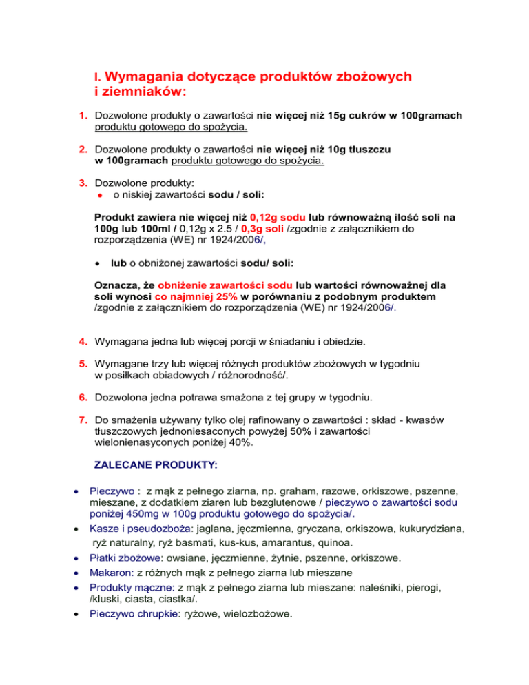 I. Wymagania dotyczące produktów zbożowych i ziemniaków: 1. Dozwolone produkty o zawartości nie więcej niż 15g cukrów w 100gramach produktu gotowego do spożycia. 2. Dozwolone produkty o zawartości nie więcej niż 10g tłuszczu w 100gramach produktu gotowego do spożycia. 3. Dozwolone produkty: o niskiej zawartości sodu / soli: Produkt zawiera nie więcej niż 0,12g sodu lub równoważną ilość soli na 100g lub 100ml / 0,12g x 2.5 / 0,3g soli /zgodnie z załącznikiem do rozporządzenia (WE) nr 1924/2006/, lub o obniżonej zawartości sodu/ soli: Oznacza, że obniżenie zawartości sodu lub wartości równoważnej dla soli wynosi co najmniej 25% w porównaniu z podobnym produktem /zgodnie z załącznikiem do rozporządzenia (WE) nr 1924/2006/. 4. Wymagana jedna lub więcej porcji w śniadaniu i obiedzie. 5. Wymagane trzy lub więcej różnych produktów zbożowych w tygodniu w posiłkach obiadowych / różnorodność/. 6. Dozwolona jedna potrawa smażona z tej grupy w tygodniu. 7. Do smażenia używany tylko olej rafinowany o zawartości : skład - kwasów tłuszczowych jednoniesaconych powyżej 50% i zawartości wielonienasyconych poniżej 40%. ZALECANE PRODUKTY: Pieczywo : z mąk z pełnego ziarna, np. graham, razowe, orkiszowe, pszenne, mieszane, z dodatkiem ziaren lub bezglutenowe / pieczywo o zawartości sodu poniżej 450mg w 100g produktu gotowego do spożycia/. Kasze i pseudozboża: jaglana, jęczmienna, gryczana, orkiszowa, kukurydziana, ryż naturalny, ryż basmati, kus-kus, amarantus, quinoa. Płatki zbożowe: owsiane, jęczmienne, żytnie, pszenne, orkiszowe. Makaron: z różnych mąk z pełnego ziarna lub mieszane Produkty mączne: z mąk z pełnego ziarna lub mieszane: naleśniki, pierogi, /kluski, ciasta, ciastka/. Pieczywo chrupkie: ryżowe, wielozbożowe. NIE ZALECANE : Pieczywo: z białej mąki /w przeważającej ilości/, produkty mączne na bazie białych mąk z wysokiego przemiału – oczyszczenia, np makarony, kluski, drożdżówki, Płatki zbożowe ; wysokoprzetworzone i słodzone / ekstrudowane płatki zbożowe/ np kukurydziane, smakowe, w postaci kółeczek i innych form chrupiących, Pieczywo cukiernicze i półcukiernicze / francuskie, półfrancuskie/, chrupki smakowe i chipsy, II. Wymagania dotyczące warzyw: 1. Surowe lub przetworzone. 2. Dozwolone produkty bez dodatku cukrów /Definicja: „żywność bez dodatku cukru” oznacza żywność bez: żadnego dodatku monosacharydów lub disacharydów; żadnego dodatku środków spożywczych zawierających monosacharydy lub disacharydy / i substancji słodzących: Substancje słodzące: E 420 Sorbitole E 421 Mannitol E 950 Acesulfam K E 951 Aspartam E 952 Cyklaminiany E 953 Izomalt E 954 Sacharyny E 955 Sukraloza E 957 Taumatyna E 959 Neohesperydyna DC E 960 Glikozydy stewiolowe E 961 Neotam E 962 Sól aspartamu i acesulfamu E 964 Syrop poliglucitolowy E 965 Maltitole E 966 Laktitol E 967 Ksylitol E 968 Erytrytol 3. Dozwolone produkty: o niskiej zawartości sodu / soli: Produkt zawiera nie więcej niż 0,12g sodu lub równoważną ilość soli na 100g lub 100ml / 0,12g x 2.5 / 0,3g soli /zgodnie z załącznikiem do rozporządzenia (WE) nr 1924/2006/, lub o obniżonej zawartości sodu/ soli: Oznacza, że obniżenie zawartości sodu lub wartości równoważnej dla soli wynosi co najmniej 25% w porównaniu z podobnym produktem /zgodnie z załącznikiem do rozporządzenia (WE) nr 1924/2006/. Z wyłączeniem produktów poddanych naturalnej fermentacji mlekowej kwaszona kapusta, kwaszone ogórki/. / 4. W przypadku warzyw suszonych dozwolone produkty bez dodatku cukrów i substancji słodzących, bez soli i tłuszczu. 5. Wymagana jedna lub więcej porcji w posiłku obiadowym. 6. Wymagana trzy lub więcej porcji surowych warzyw w posiłkach obiadowych w tygodniu. 7. Wymagane trzy lub więcej różnych warzyw w tygodniu w posiłkach obiadowych / różnorodność/. ZALECANE : Z przewagą rodzimych i uwzględniając sezonowość i różnorodność, świeże lub mrożone : marchew, buraki, ziemniaki, seler korzeń i naciowy, rzepa, rzodkiew, dynia, pietruszka, cebula, czosnek, brokuł, kalafior, cukinia, kabaczki, szpinak,szparagi, fasolka szparagowa, zielony groszek, kukurydza,pomidor, papryka, ogórek, rzodkiewka, kiełki, sałaty, kapusty, pieczarki, grochy i fasole, soczewica, ciecierzyca III. Wymagania dotyczące owoców: 1. Surowe lub przetworzone. 2. Dozwolone produkty bez dodatku cukrów /Definicja: „żywność bez dodatku cukru” oznacza żywność bez: żadnego dodatku monosacharydów lub disacharydów; żadnego dodatku środków spożywczych zawierających monosacharydy lub disacharydy / i substancji słodzących: Substancje słodzące: E 420 Sorbitole E 421 Mannitol E 950 Acesulfam K E 951 Aspartam E 952 Cyklaminiany E 953 Izomalt E 954 Sacharyny E 955 Sukraloza E 957 Taumatyna E 959 Neohesperydyna DC E 960 Glikozydy stewiolowe E 961 Neotam E 962 Sól aspartamu i acesulfamu E 964 Syrop poliglucitolowy E 965 Maltitole E 966 Laktitol E 967 Ksylitol E 968 Erytrytol W przypadku owoców suszonych dozwolone produkty bez dodatku cukrów i substancji słodzących, bez soli i tłuszczu. Wymagana porcja owoców w każdym posiłku obiadowym. Wymagana w tygodniu - trzy lub więcej różnych owoców w posiłkach obiadowych. ZALECANE : Surowe : Uwzględniając sezonowość i z przewagą rodzimych: jabłka, gruszki, śliwki, czereśnie, wiśnie, truskawki, jagody, maliny, brzoskwinie, morele, porzeczki, agrest, żurawina oraz owoce cytrusowe. Owoce suszone (bezsiarkowe): rodzynki, daktyle, morele, śliwki, żurawina, jabłka,gruszki, śliwki, czereśnie, wiśnie, truskawki, jagody, maliny, brzoskwinie, morele, porzeczki, agrest,, owoce cytrusowe. IV. Wymagania dotyczące owoców i warzyw: Dodatek warzyw lub owoców w każdym posiłku każdego dnia . Jedna porcja może być zastąpiona przez sok w porcji nie przekraczającej 200ml. soki owocowe niesłodzone, najlepiej rozcieńczone z wodą, soki warzywne, soki i 